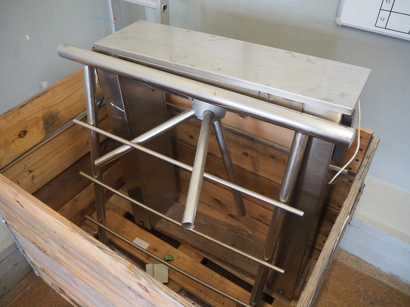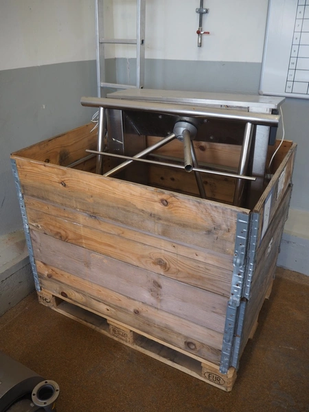 Wooden pallet box with tourniquet, dimensions: 1200 mm x 800 mm x 1400 mm. Technical condition unknown.