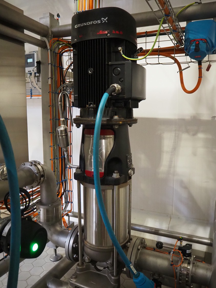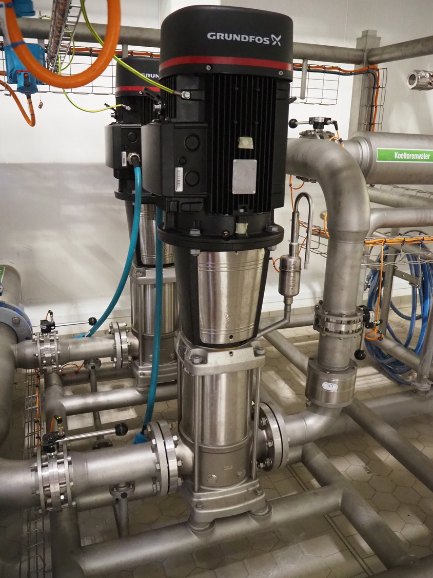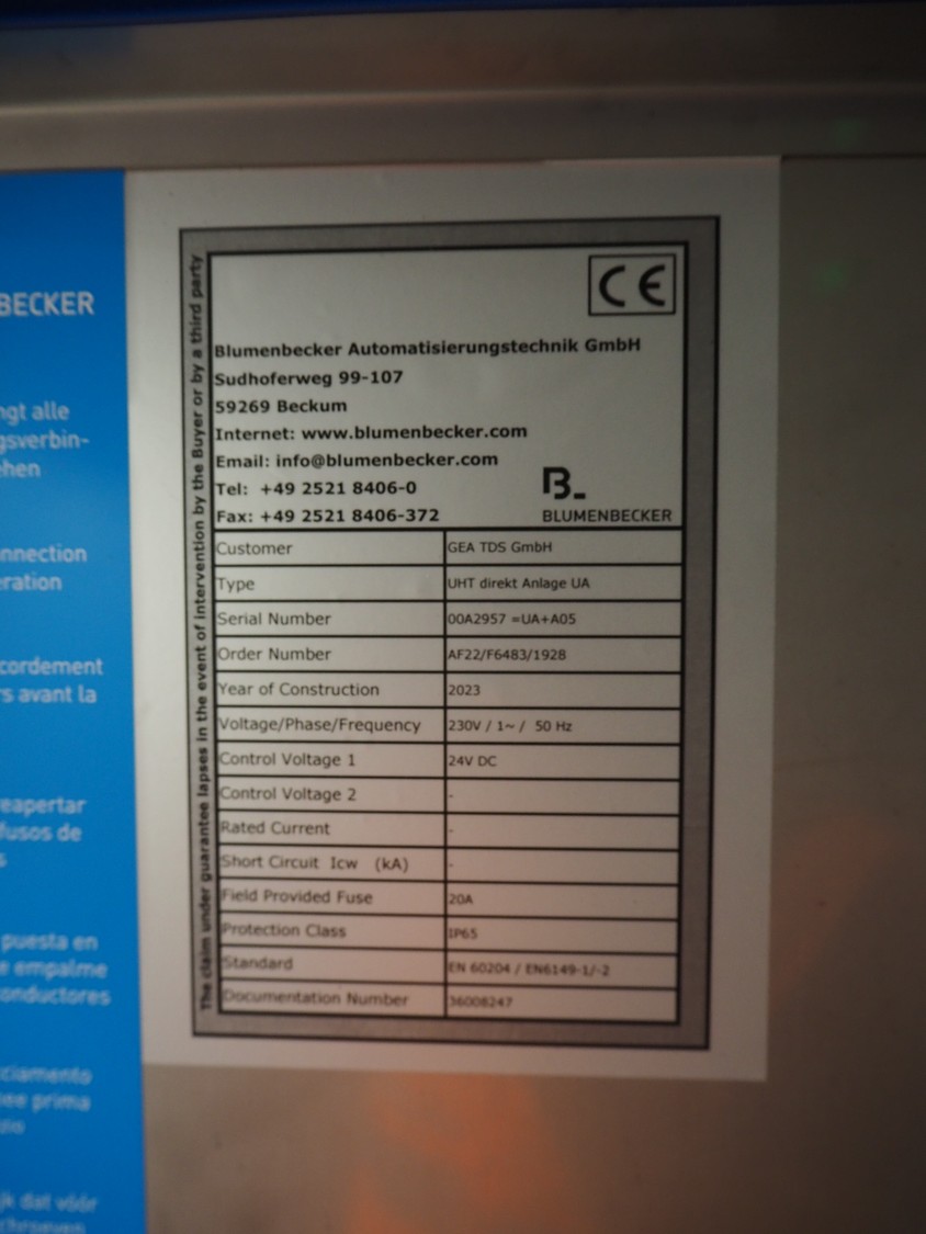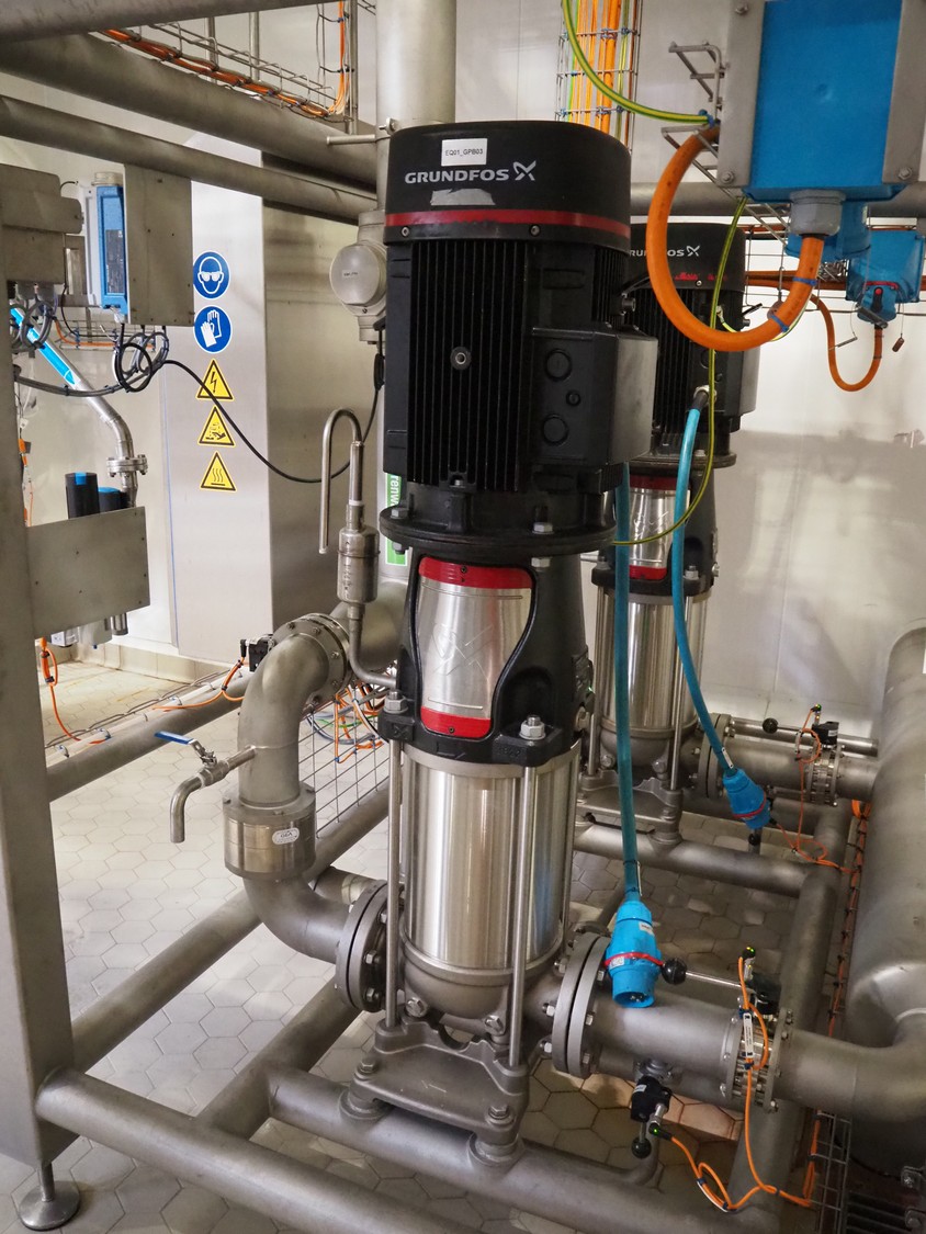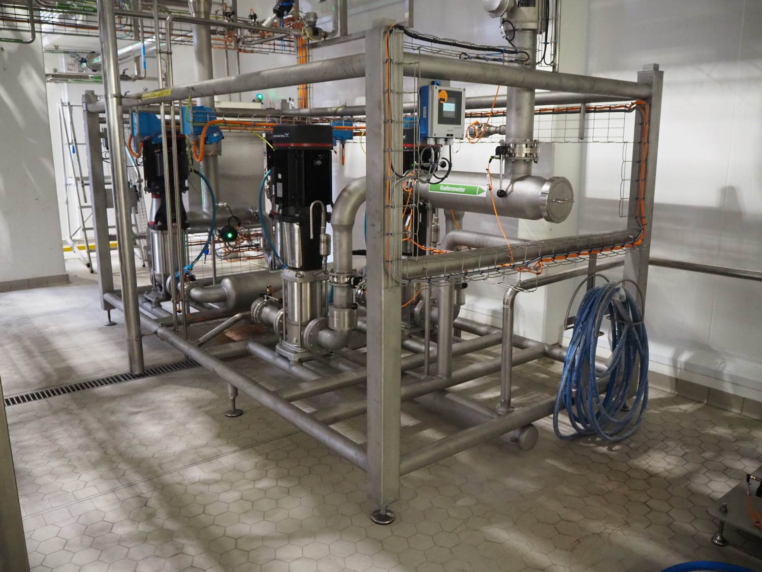 GEA TDS GmbH s/s skid with pump unit for cooling tower water, type: UHT direkt Anlage UA, serial number: 00A2957 =UA+A05, year of construction: 2023, 230 V, 1 Ph, 50 Hz, 24 V DC, 20 A, consisting of: 4 Grundfos centrifugal pumps, various flowmeters and valves, total dimensions: 4400 mm x 2000 mm x 2000 mm.