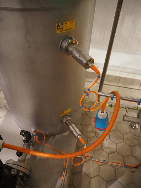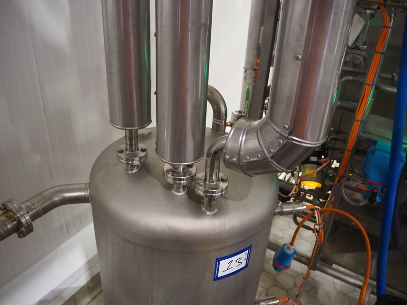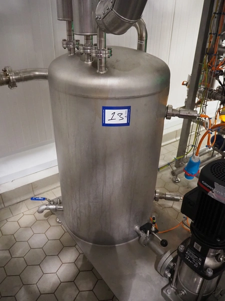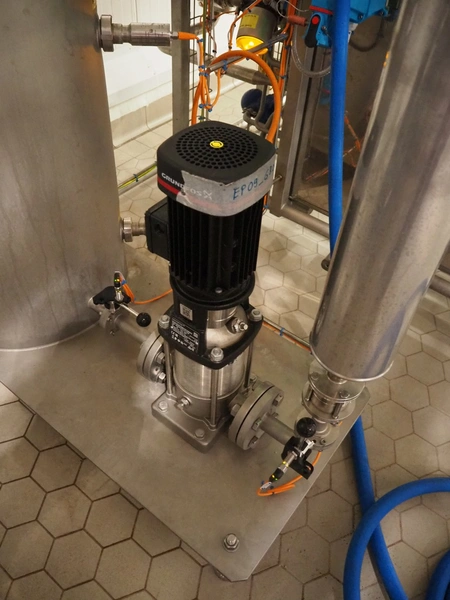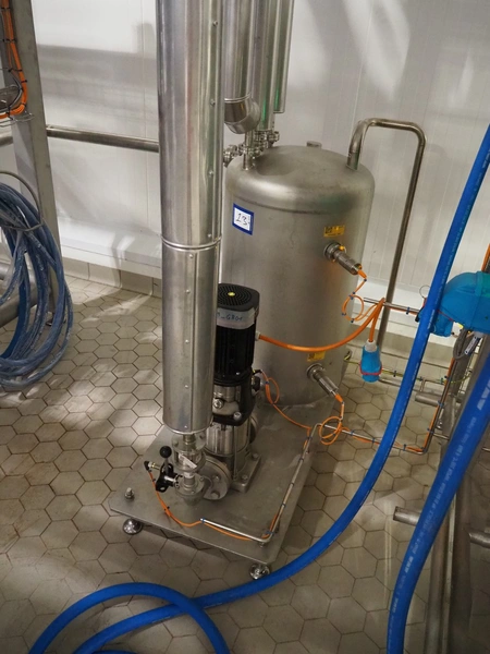 S/s skid with ice water buffer tank and Grundfos centrifugal pump, model pump: PN-SN A-98857158-10000010, type: CRN3-9 A-FGJ-H-E-HQQE, 0.75 kW, 3.0 m³/h, total dimensions: 1200 mm x 600 mm x 1200 mm.