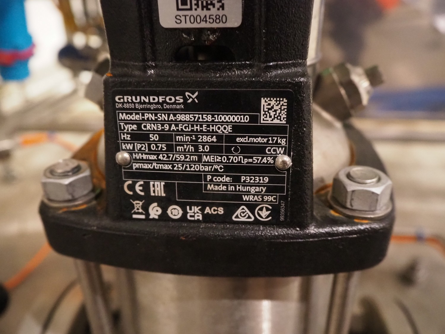 S/s skid with ice water buffer tank and Grundfos centrifugal pump, model pump: PN-SN A-98857158-10000010, type: CRN3-9 A-FGJ-H-E-HQQE, 0.75 kW, 3.0 m³/h, total dimensions: 1200 mm x 600 mm x 1200 mm.
