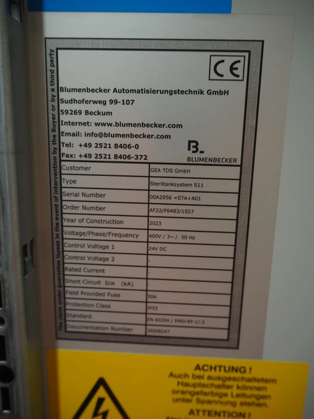 Rittal switch cabinet for GEA TDS GmbH aseptic tank system, type: Steriltanksystem S11, serial number: 00A2956 =STA+A01, year of construction: 2023, 400 V, 3 Ph, 50 Hz, 24 V DC, 50 A, dimensions: 1200 mm x 700 mm x 2150 mm.
