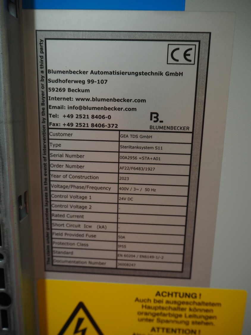 Rittal switch cabinet for GEA TDS GmbH aseptic tank system, type: Steriltanksystem S11, serial number: 00A2956 =STA+A01, year of construction: 2023, 400 V, 3 Ph, 50 Hz, 24 V DC, 50 A, dimensions: 1200 mm x 700 mm x 2150 mm.