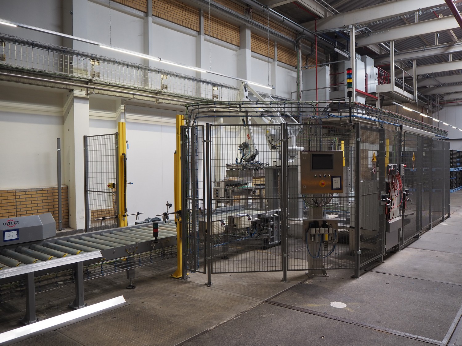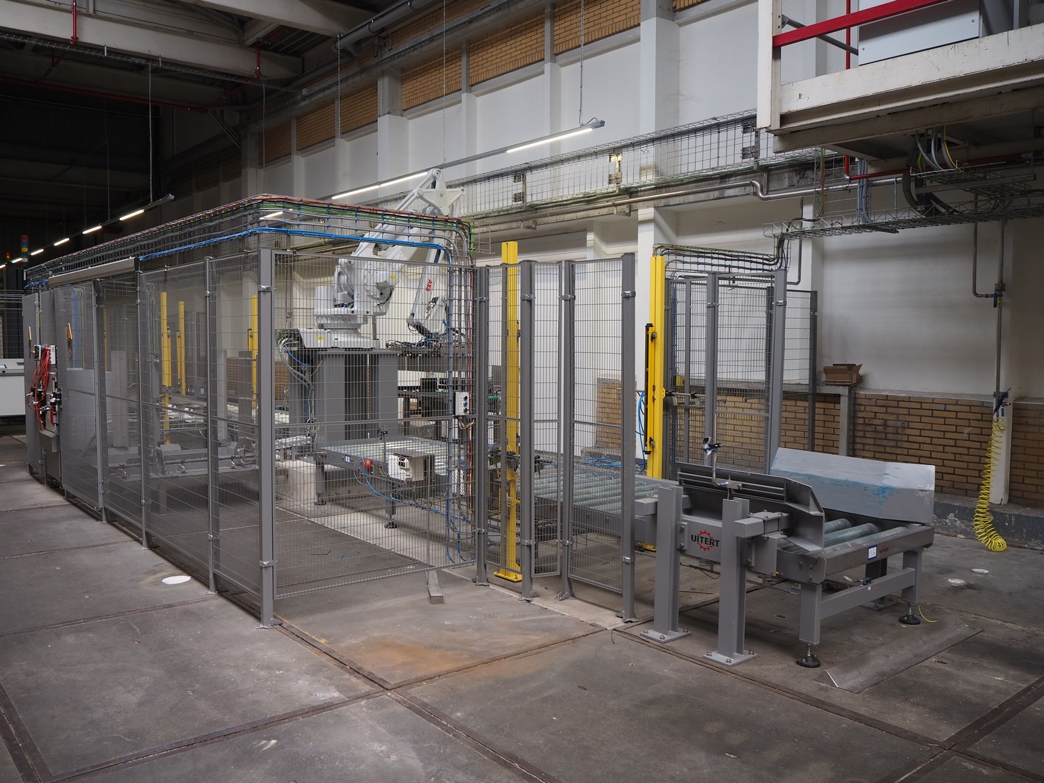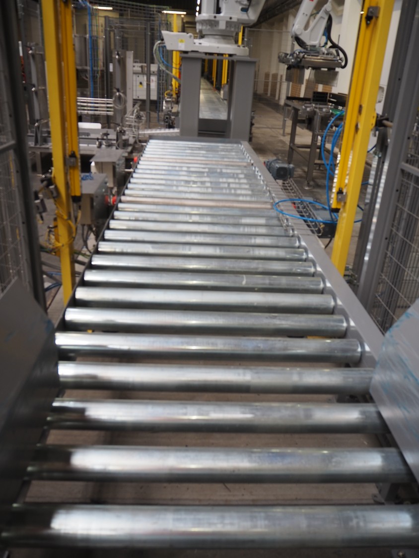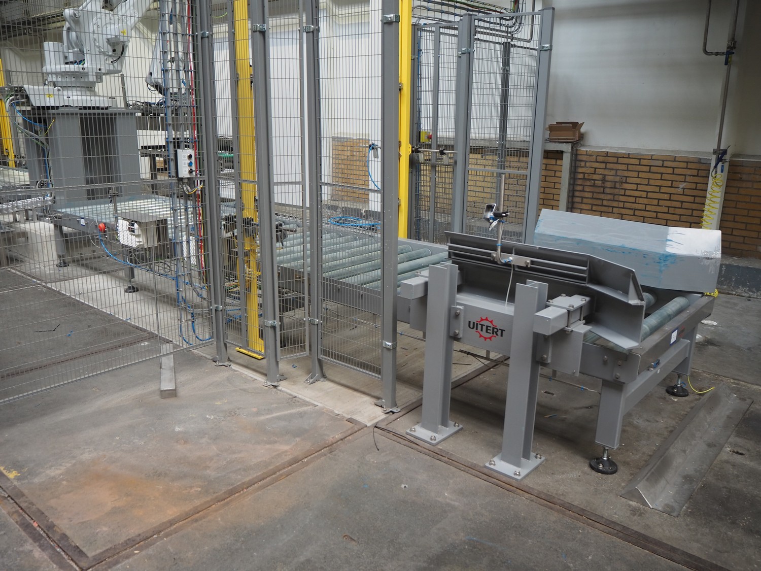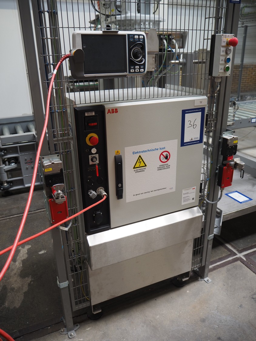 ABB AB/Uitert palletizing installation, consisting of: Uitert infeed roller conveyor, roller width: 1100 mm, total dimensions: 6000 mm x 1900 mm x 1000 mm, infeed unit for spacers, dimensions spacers: 1200 mm x 800 mm, total dimensions: 1700 mm x 1700 mm x 1600 mm, ABB AB palletizing robot, dimensions: 2400 mm x 1200 mm x 2400 mm, switch cabinet palettizing robot, type: IRC5 Single, serial number: 660-104128, date of manufacturing: 2023-06-08, 3x400 V, 56-60 Hz, 20 A, 10 kA, dimensions: 700 mm x 800 mm x 1400 mm, gripper table, dimensions: 1800 mm x 1300 mm x 1400 mm, uitert outfeed roller conveyor, roller width: 1100, total dimensions: 8700 mm x 1900 mm x 1000 mm, steel safety fence.