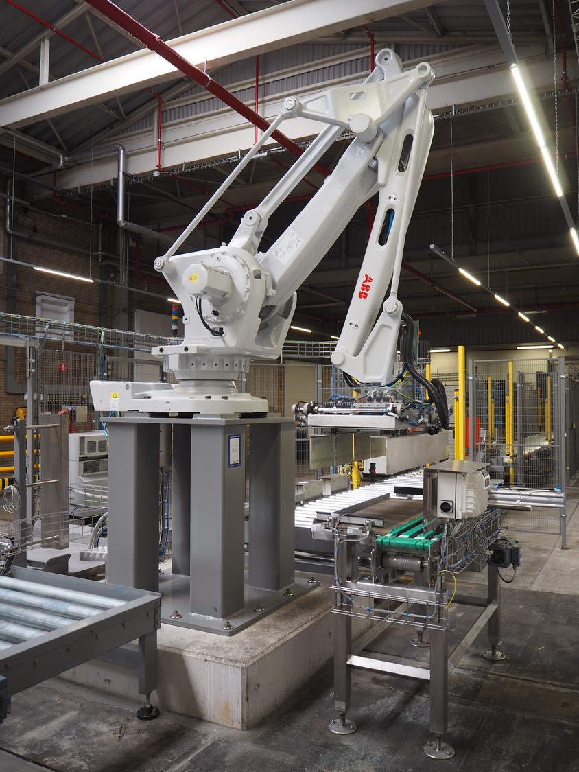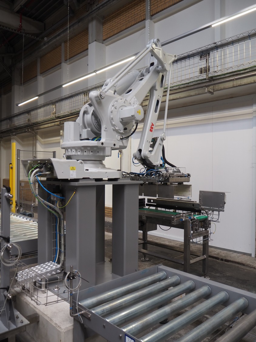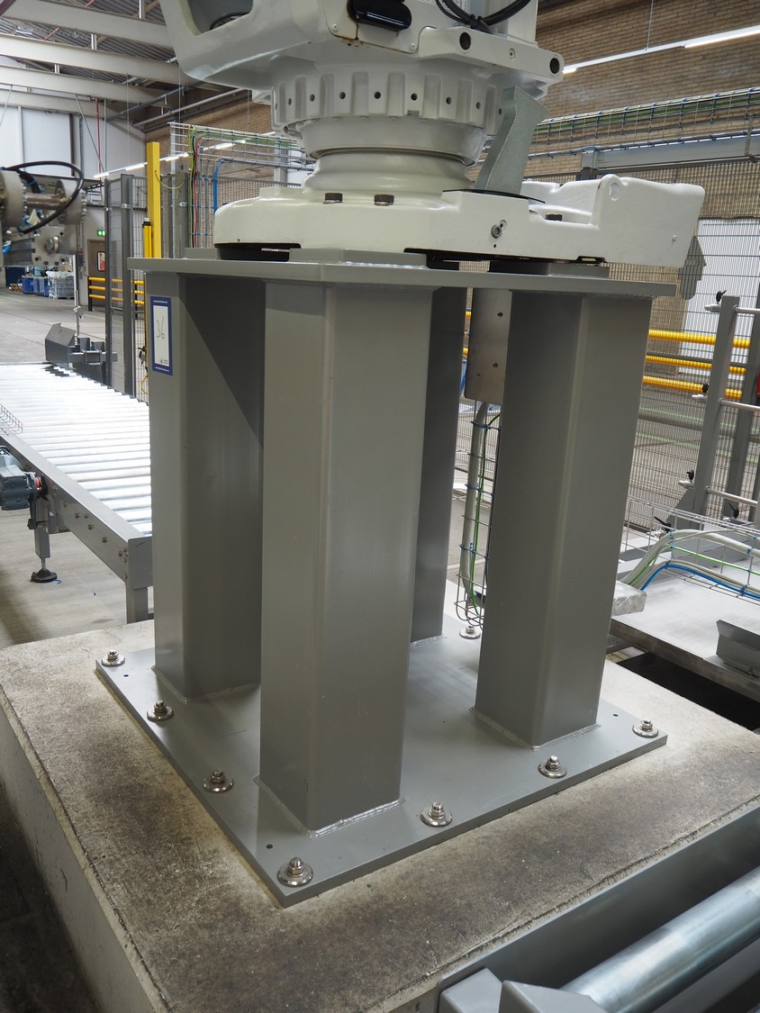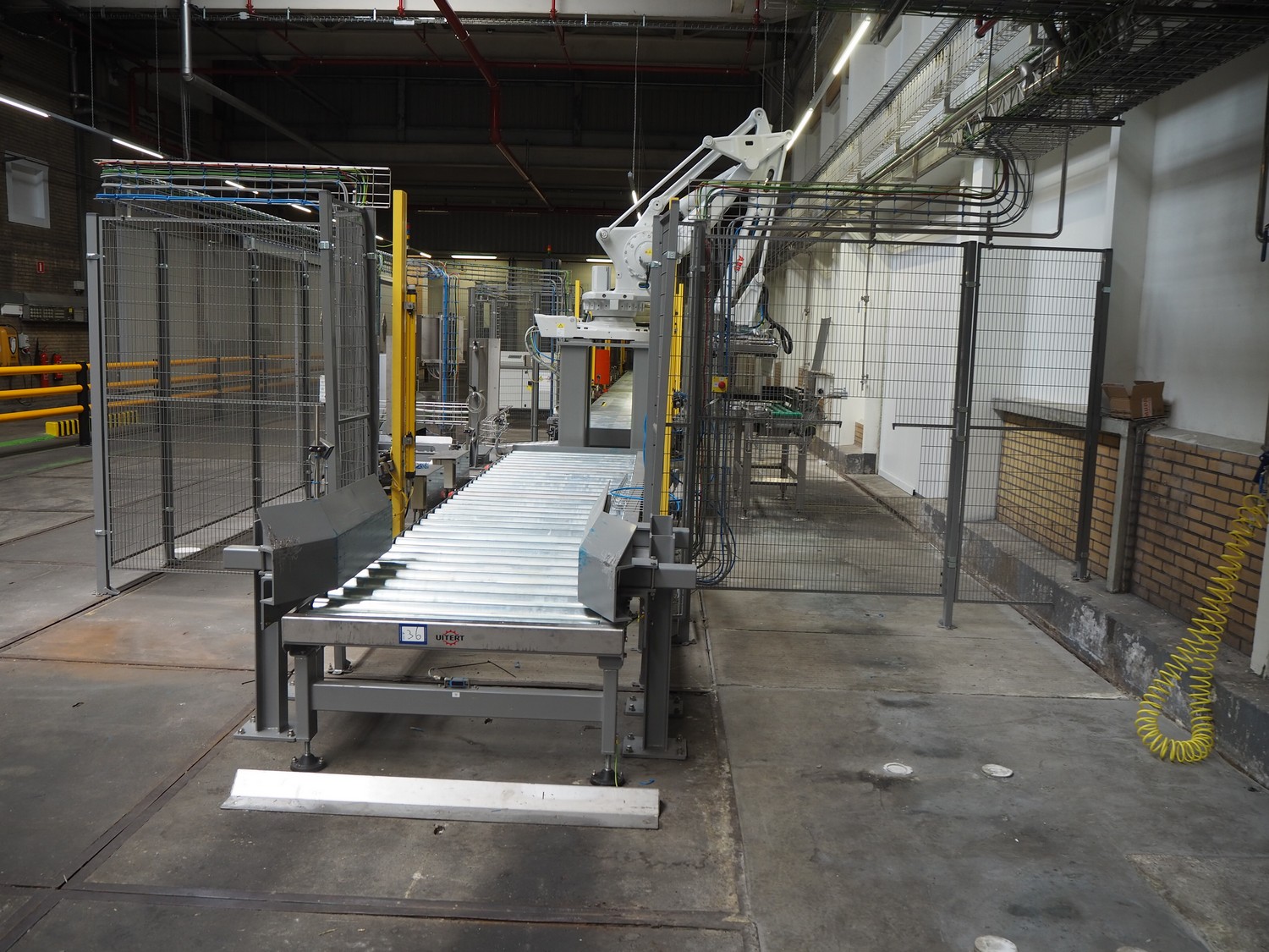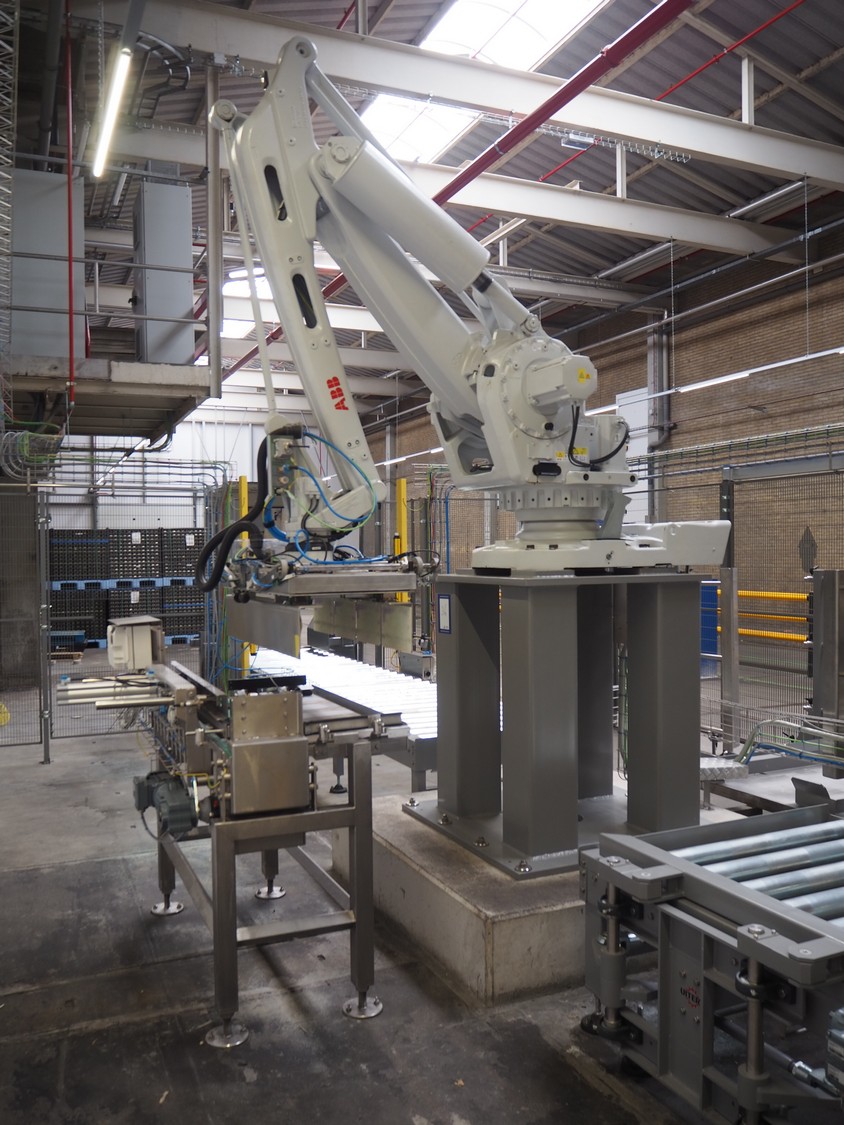 ABB AB/Uitert palletizing installation, consisting of: Uitert infeed roller conveyor, roller width: 1100 mm, total dimensions: 6000 mm x 1900 mm x 1000 mm, infeed unit for spacers, dimensions spacers: 1200 mm x 800 mm, total dimensions: 1700 mm x 1700 mm x 1600 mm, ABB AB palletizing robot, dimensions: 2400 mm x 1200 mm x 2400 mm, switch cabinet palettizing robot, type: IRC5 Single, serial number: 660-104128, date of manufacturing: 2023-06-08, 3x400 V, 56-60 Hz, 20 A, 10 kA, dimensions: 700 mm x 800 mm x 1400 mm, gripper table, dimensions: 1800 mm x 1300 mm x 1400 mm, uitert outfeed roller conveyor, roller width: 1100, total dimensions: 8700 mm x 1900 mm x 1000 mm, steel safety fence.