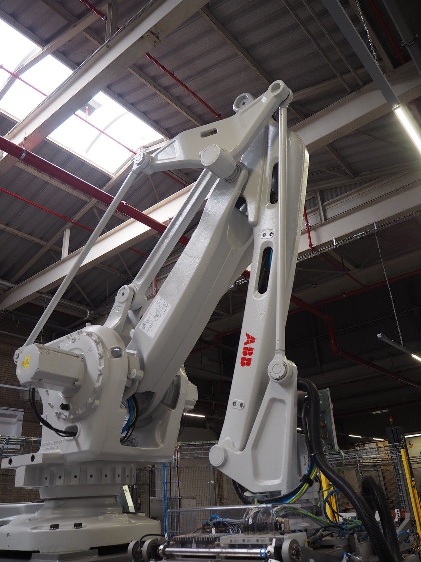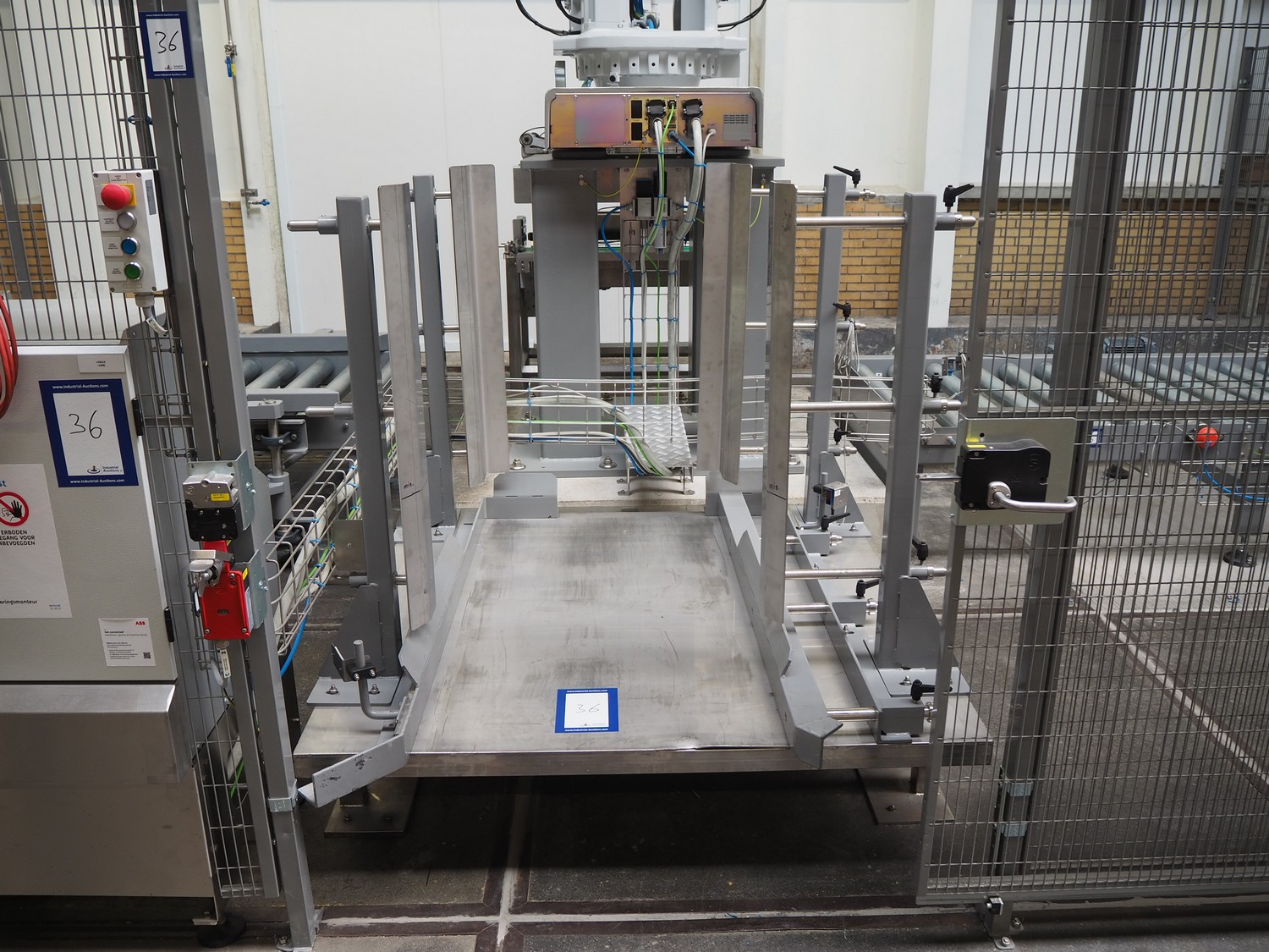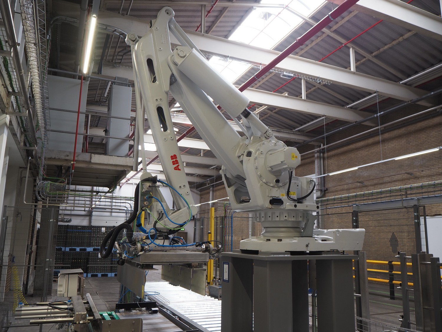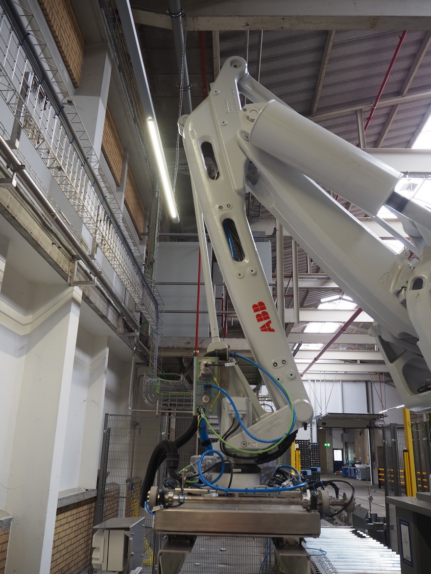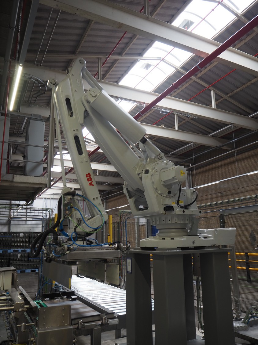 ABB AB/Uitert palletizing installation, consisting of: Uitert infeed roller conveyor, roller width: 1100 mm, total dimensions: 6000 mm x 1900 mm x 1000 mm, infeed unit for spacers, dimensions spacers: 1200 mm x 800 mm, total dimensions: 1700 mm x 1700 mm x 1600 mm, ABB AB palletizing robot, dimensions: 2400 mm x 1200 mm x 2400 mm, switch cabinet palettizing robot, type: IRC5 Single, serial number: 660-104128, date of manufacturing: 2023-06-08, 3x400 V, 56-60 Hz, 20 A, 10 kA, dimensions: 700 mm x 800 mm x 1400 mm, gripper table, dimensions: 1800 mm x 1300 mm x 1400 mm, uitert outfeed roller conveyor, roller width: 1100, total dimensions: 8700 mm x 1900 mm x 1000 mm, steel safety fence.