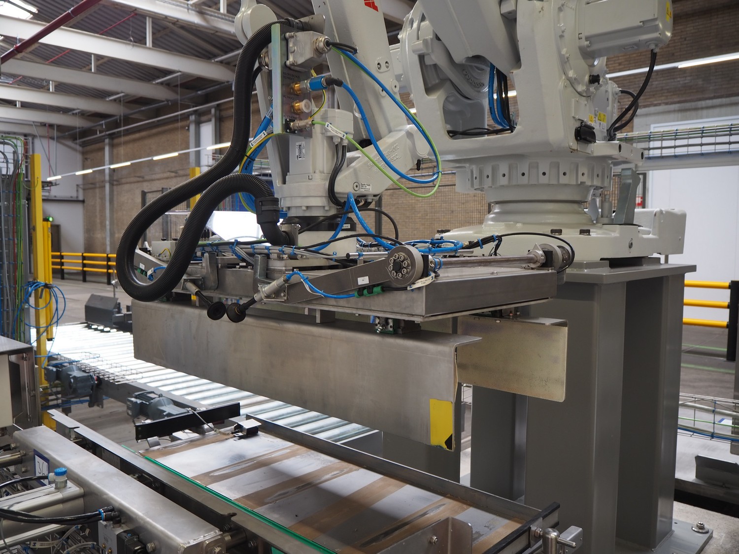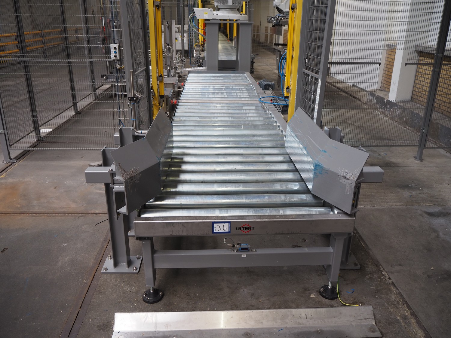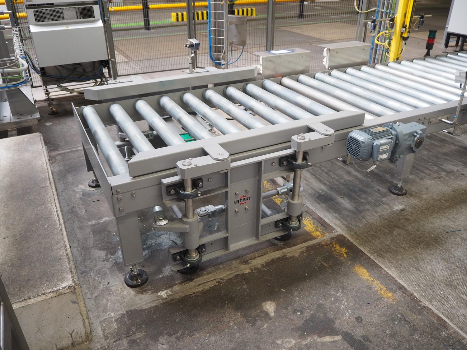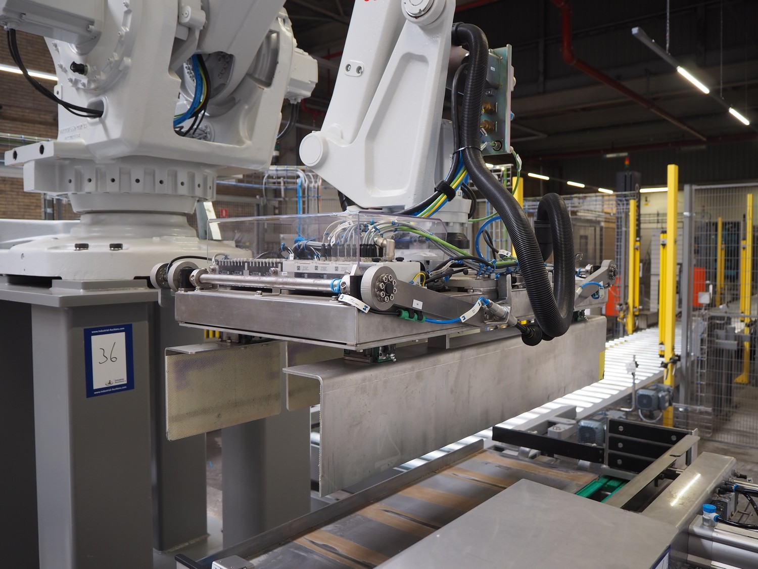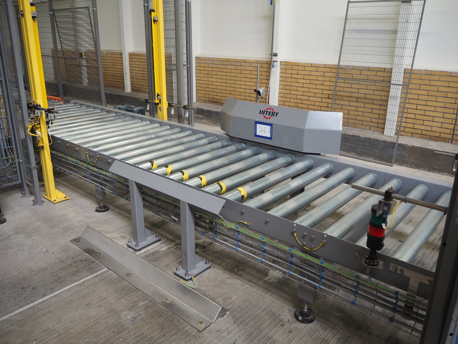 ABB AB/Uitert palletizing installation, consisting of: Uitert infeed roller conveyor, roller width: 1100 mm, total dimensions: 6000 mm x 1900 mm x 1000 mm, infeed unit for spacers, dimensions spacers: 1200 mm x 800 mm, total dimensions: 1700 mm x 1700 mm x 1600 mm, ABB AB palletizing robot, dimensions: 2400 mm x 1200 mm x 2400 mm, switch cabinet palettizing robot, type: IRC5 Single, serial number: 660-104128, date of manufacturing: 2023-06-08, 3x400 V, 56-60 Hz, 20 A, 10 kA, dimensions: 700 mm x 800 mm x 1400 mm, gripper table, dimensions: 1800 mm x 1300 mm x 1400 mm, uitert outfeed roller conveyor, roller width: 1100, total dimensions: 8700 mm x 1900 mm x 1000 mm, steel safety fence.