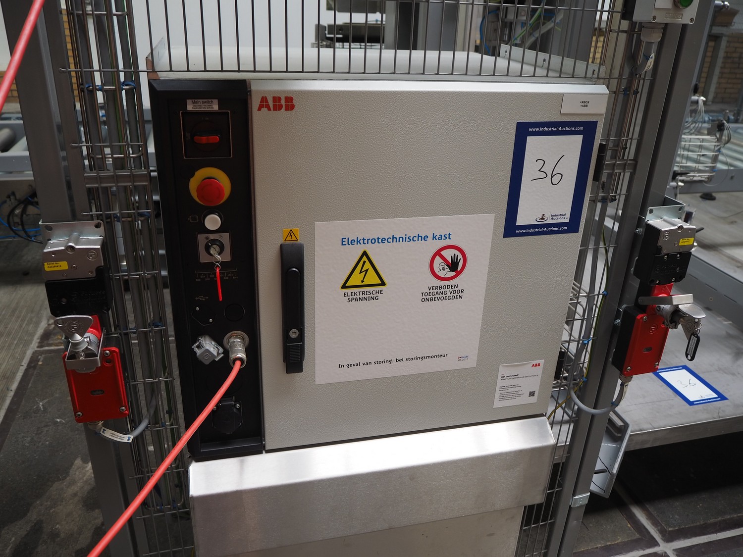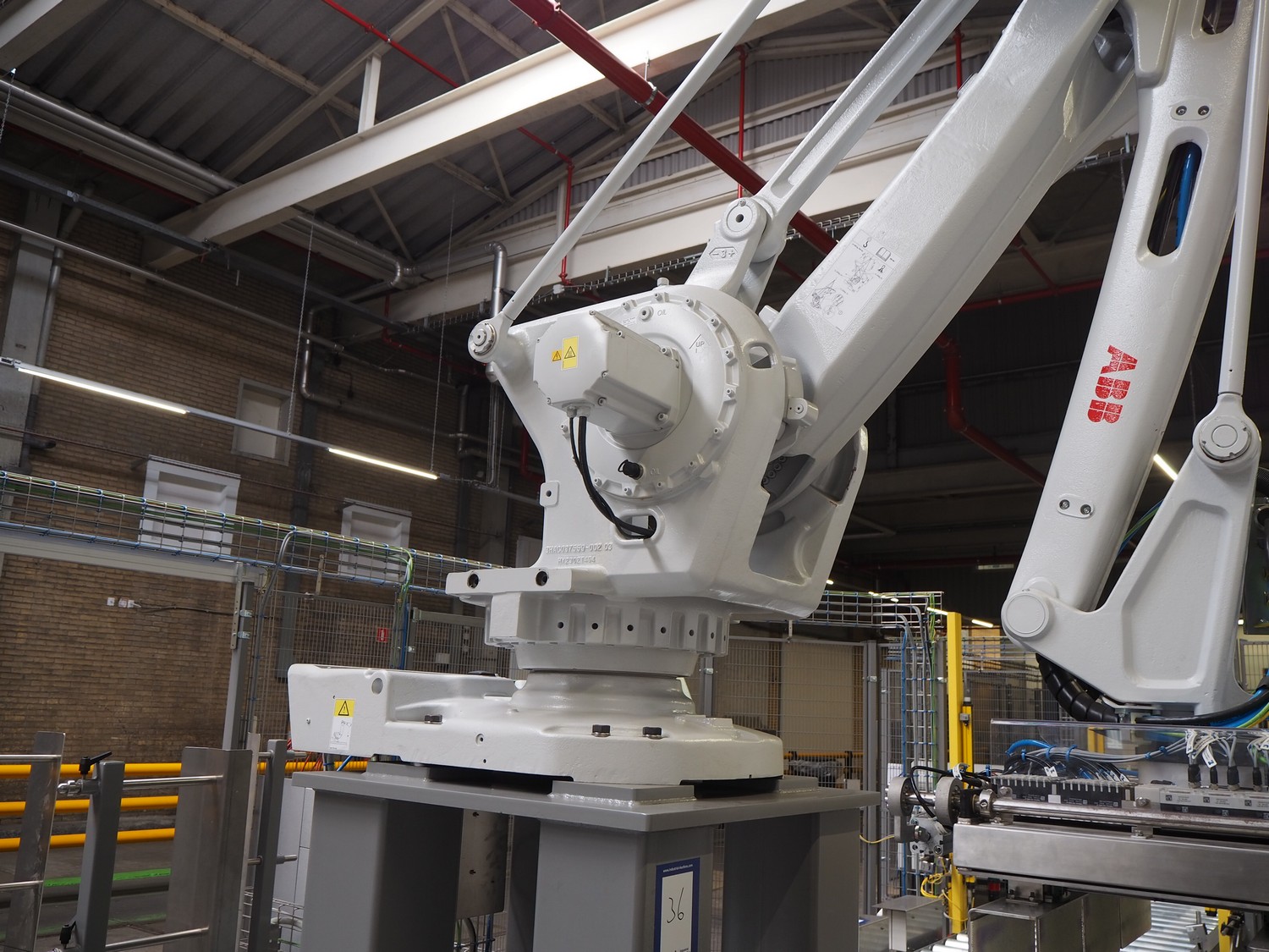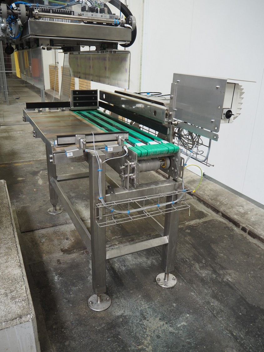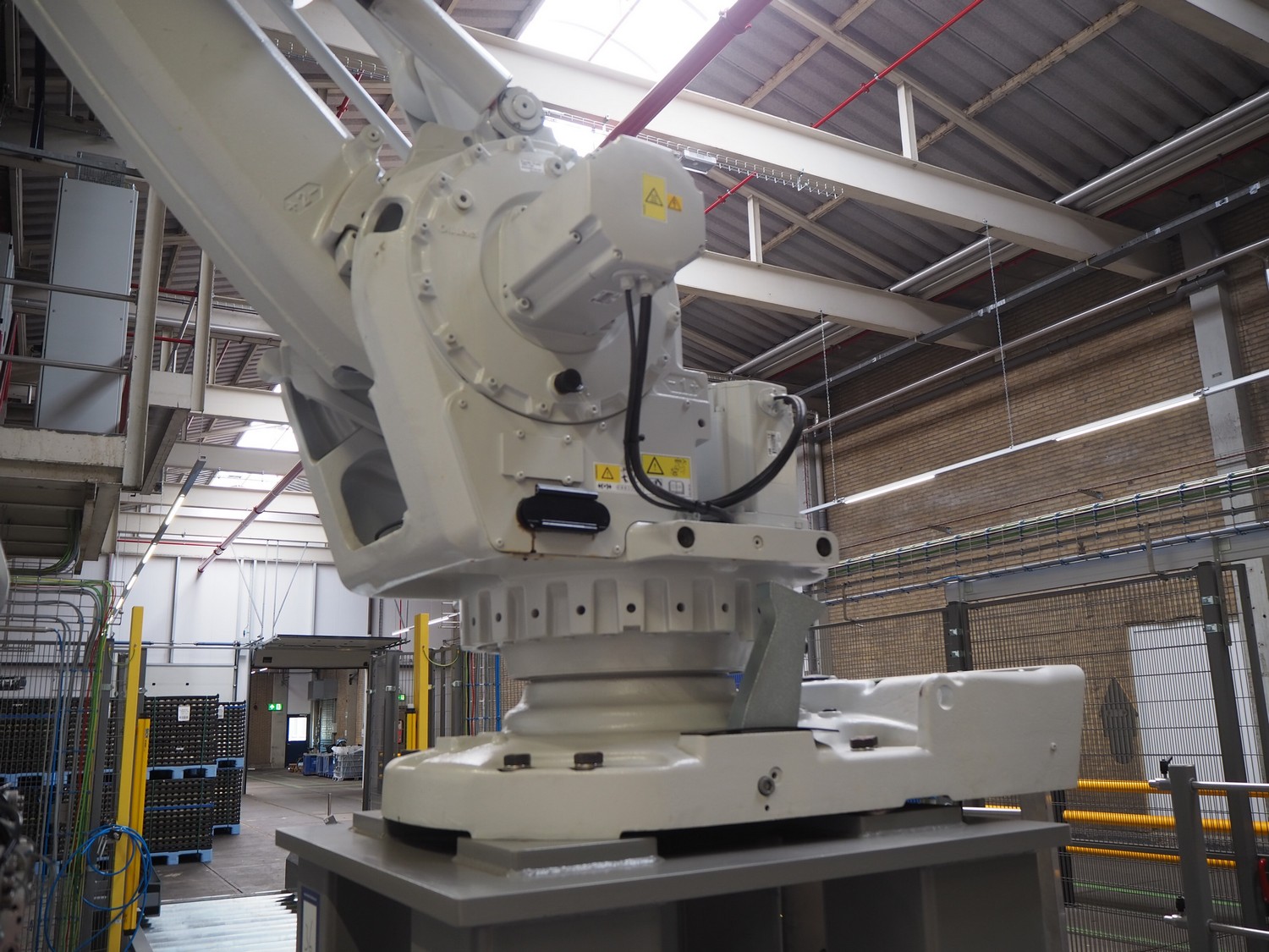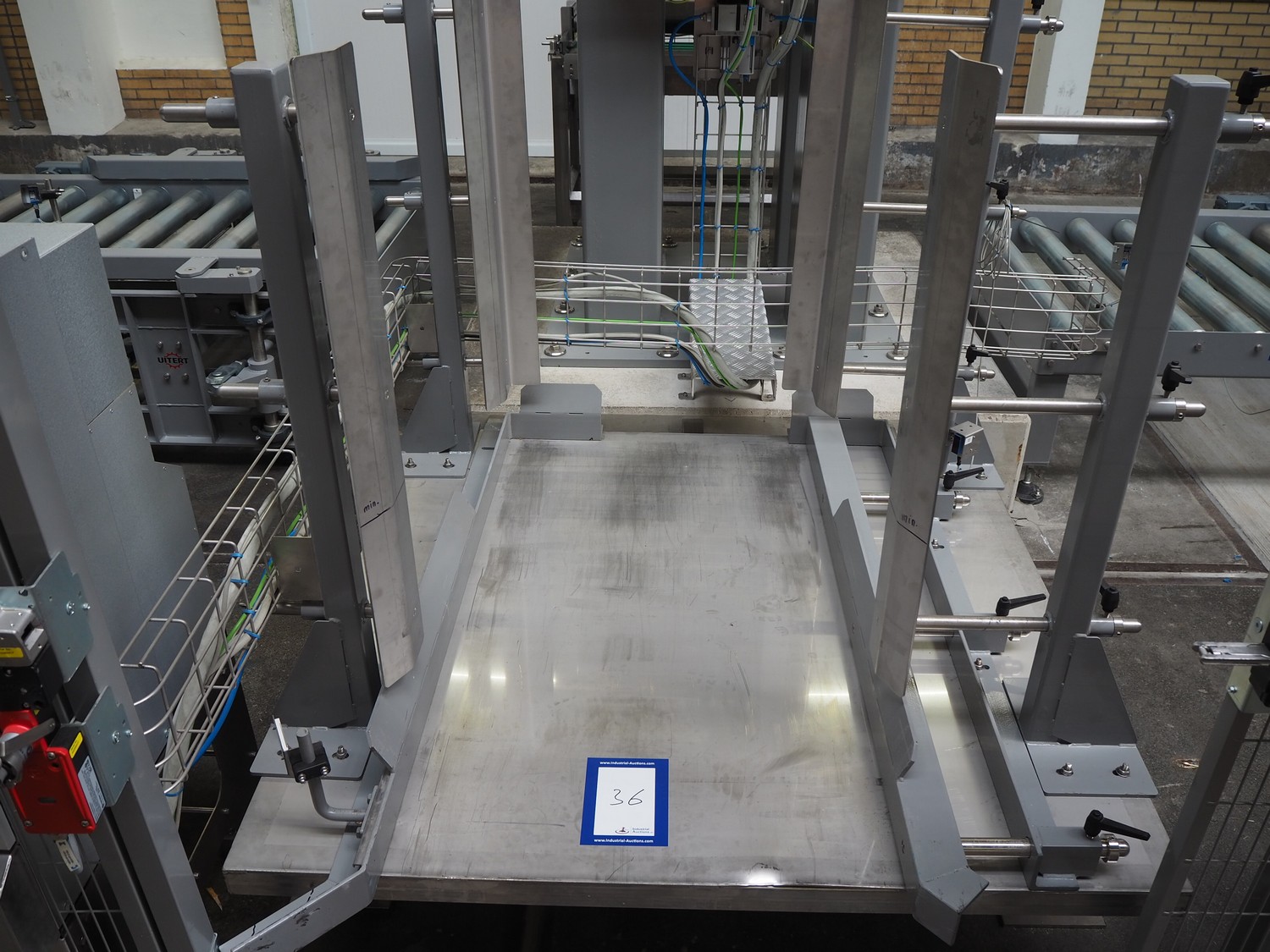 ABB AB/Uitert palletizing installation, consisting of: Uitert infeed roller conveyor, roller width: 1100 mm, total dimensions: 6000 mm x 1900 mm x 1000 mm, infeed unit for spacers, dimensions spacers: 1200 mm x 800 mm, total dimensions: 1700 mm x 1700 mm x 1600 mm, ABB AB palletizing robot, dimensions: 2400 mm x 1200 mm x 2400 mm, switch cabinet palettizing robot, type: IRC5 Single, serial number: 660-104128, date of manufacturing: 2023-06-08, 3x400 V, 56-60 Hz, 20 A, 10 kA, dimensions: 700 mm x 800 mm x 1400 mm, gripper table, dimensions: 1800 mm x 1300 mm x 1400 mm, uitert outfeed roller conveyor, roller width: 1100, total dimensions: 8700 mm x 1900 mm x 1000 mm, steel safety fence.