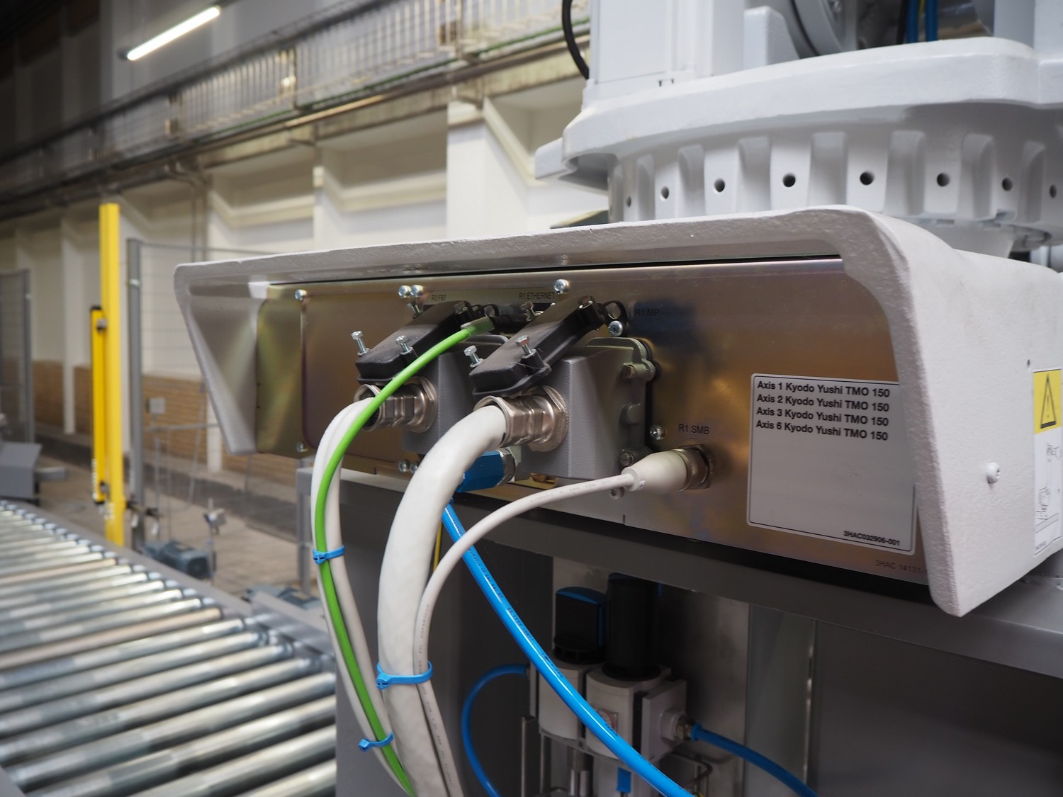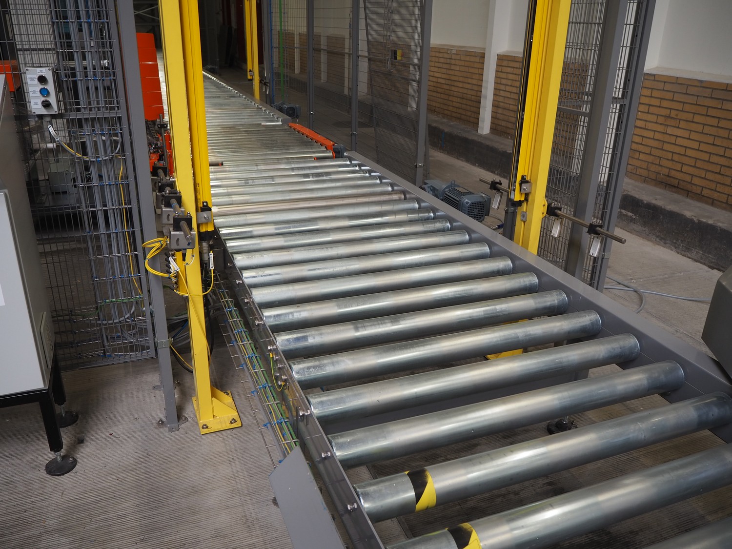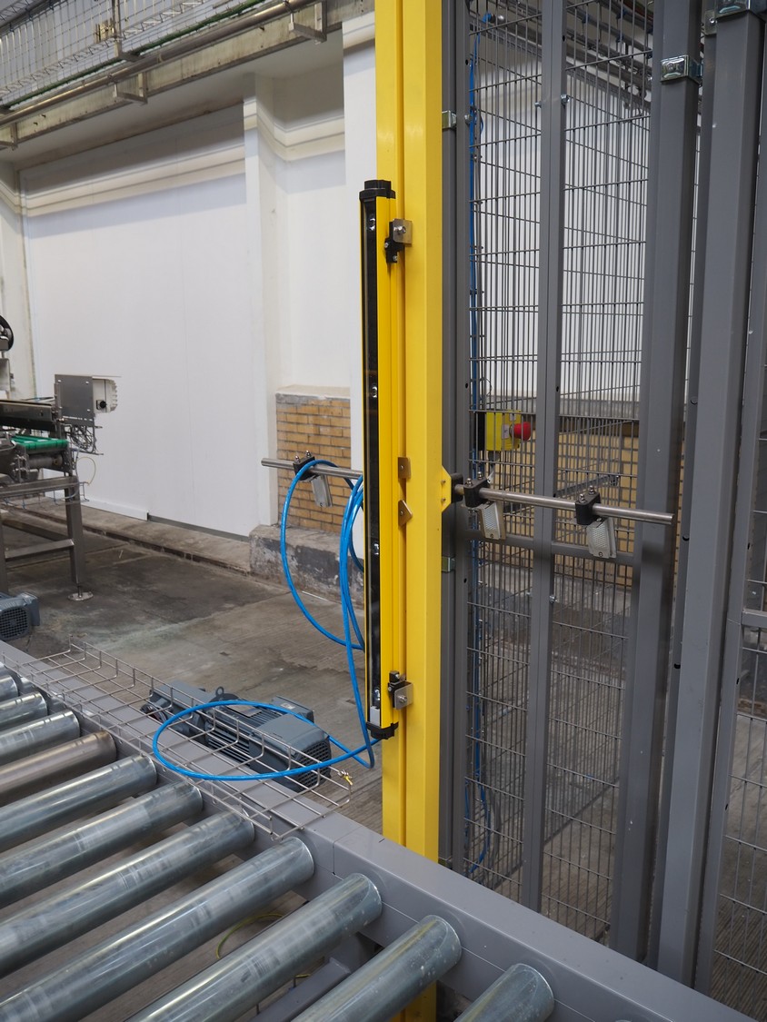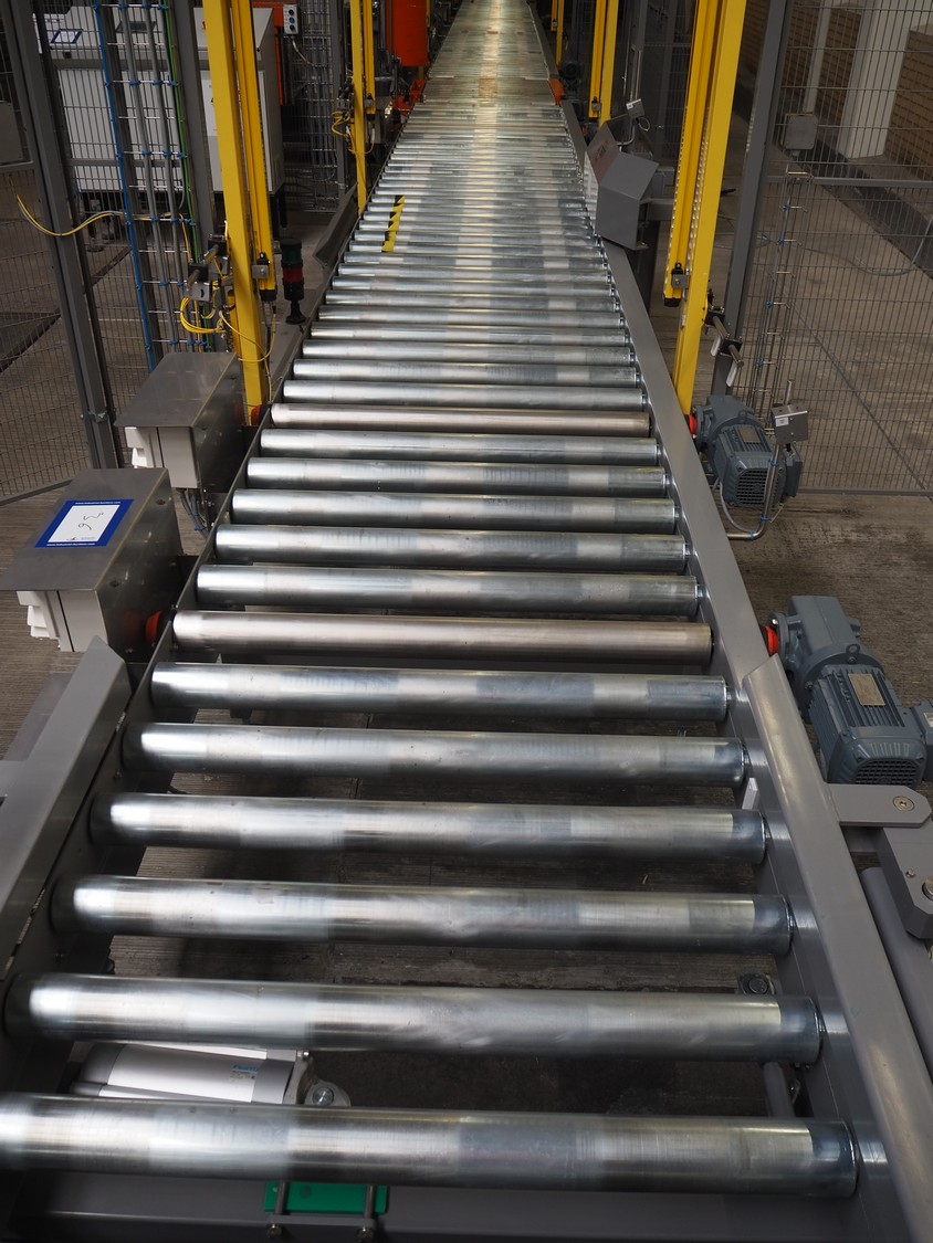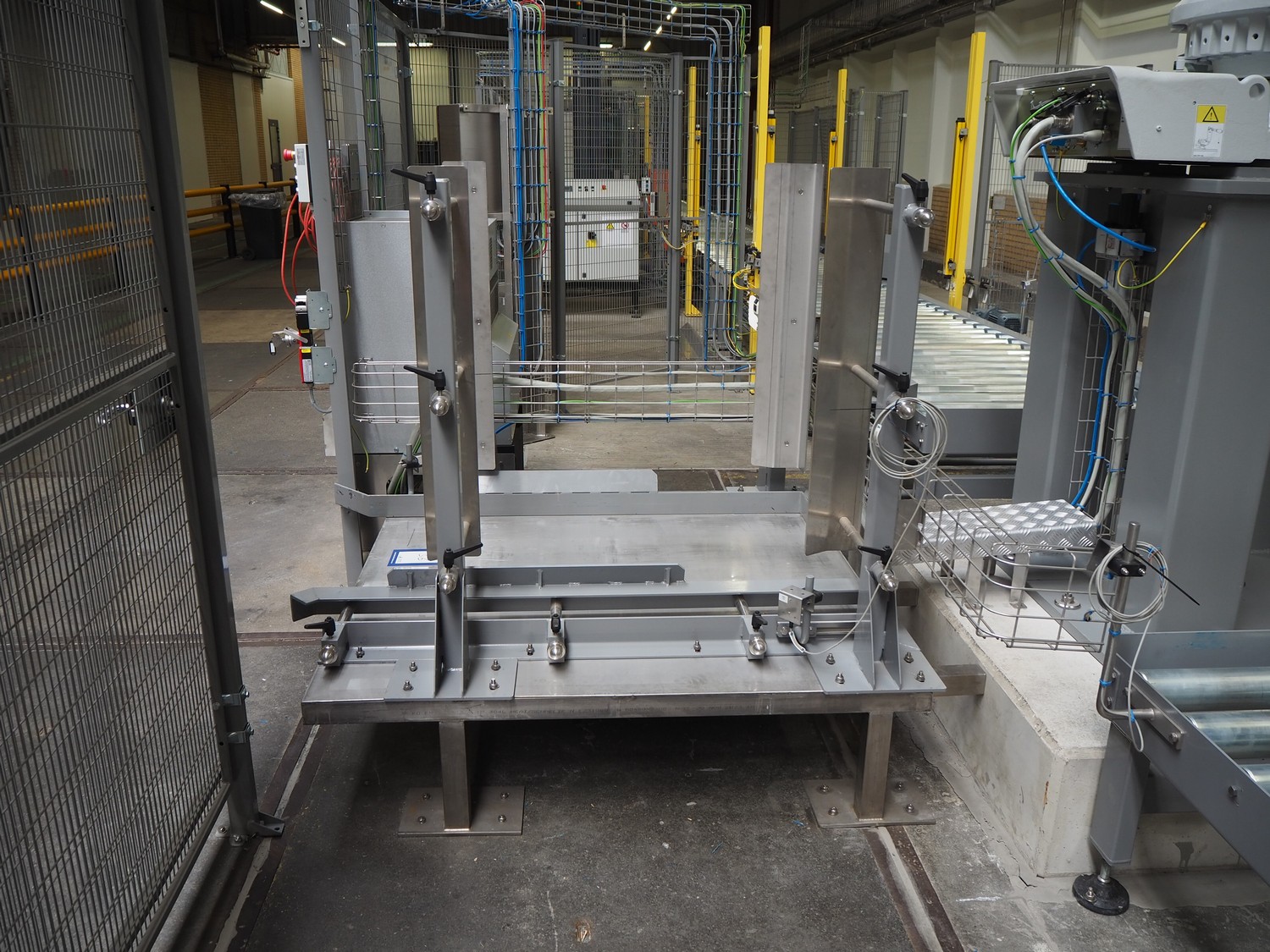ABB AB/Uitert palletizing installation, consisting of: Uitert infeed roller conveyor, roller width: 1100 mm, total dimensions: 6000 mm x 1900 mm x 1000 mm, infeed unit for spacers, dimensions spacers: 1200 mm x 800 mm, total dimensions: 1700 mm x 1700 mm x 1600 mm, ABB AB palletizing robot, dimensions: 2400 mm x 1200 mm x 2400 mm, switch cabinet palettizing robot, type: IRC5 Single, serial number: 660-104128, date of manufacturing: 2023-06-08, 3x400 V, 56-60 Hz, 20 A, 10 kA, dimensions: 700 mm x 800 mm x 1400 mm, gripper table, dimensions: 1800 mm x 1300 mm x 1400 mm, uitert outfeed roller conveyor, roller width: 1100, total dimensions: 8700 mm x 1900 mm x 1000 mm, steel safety fence.