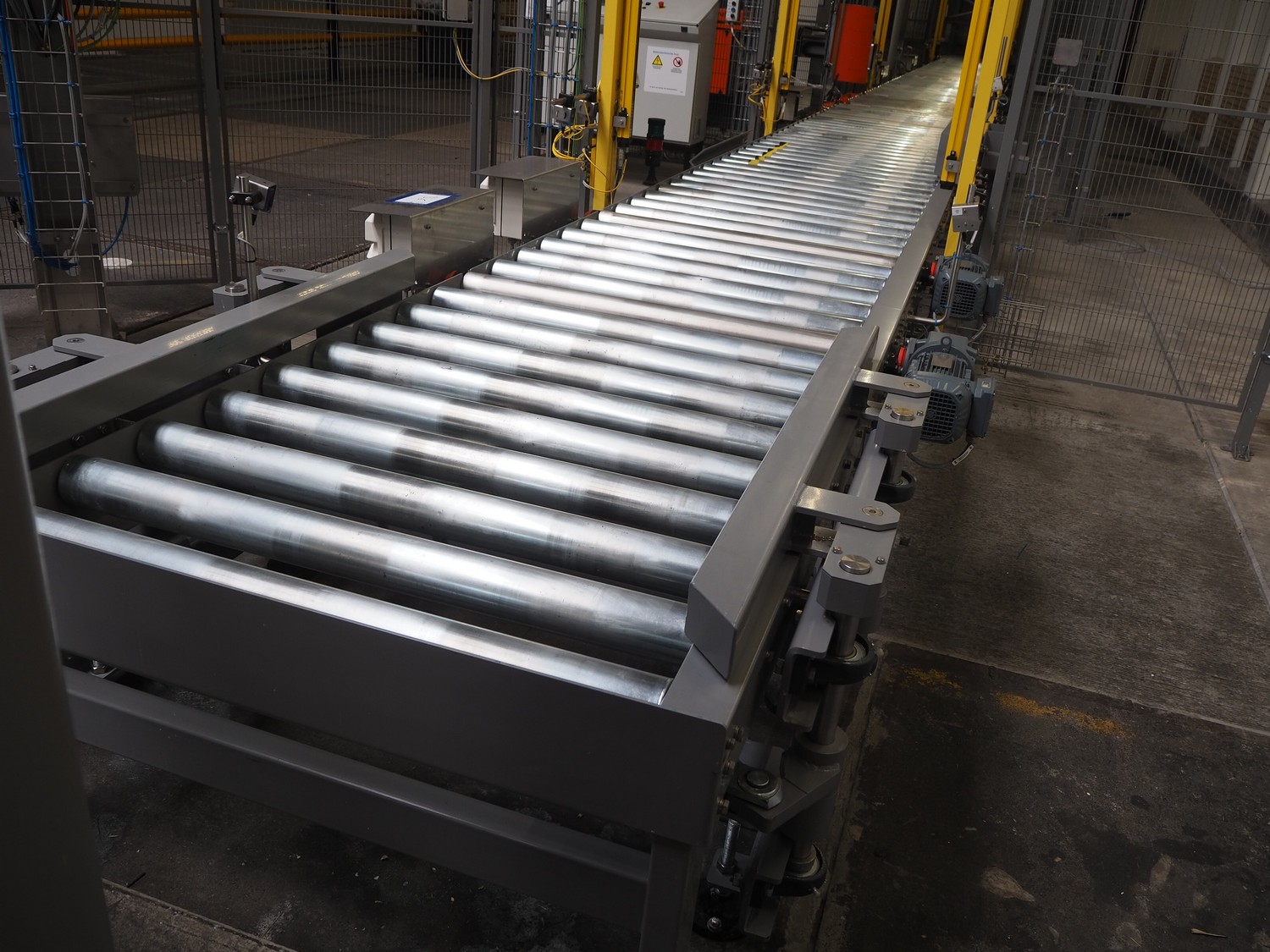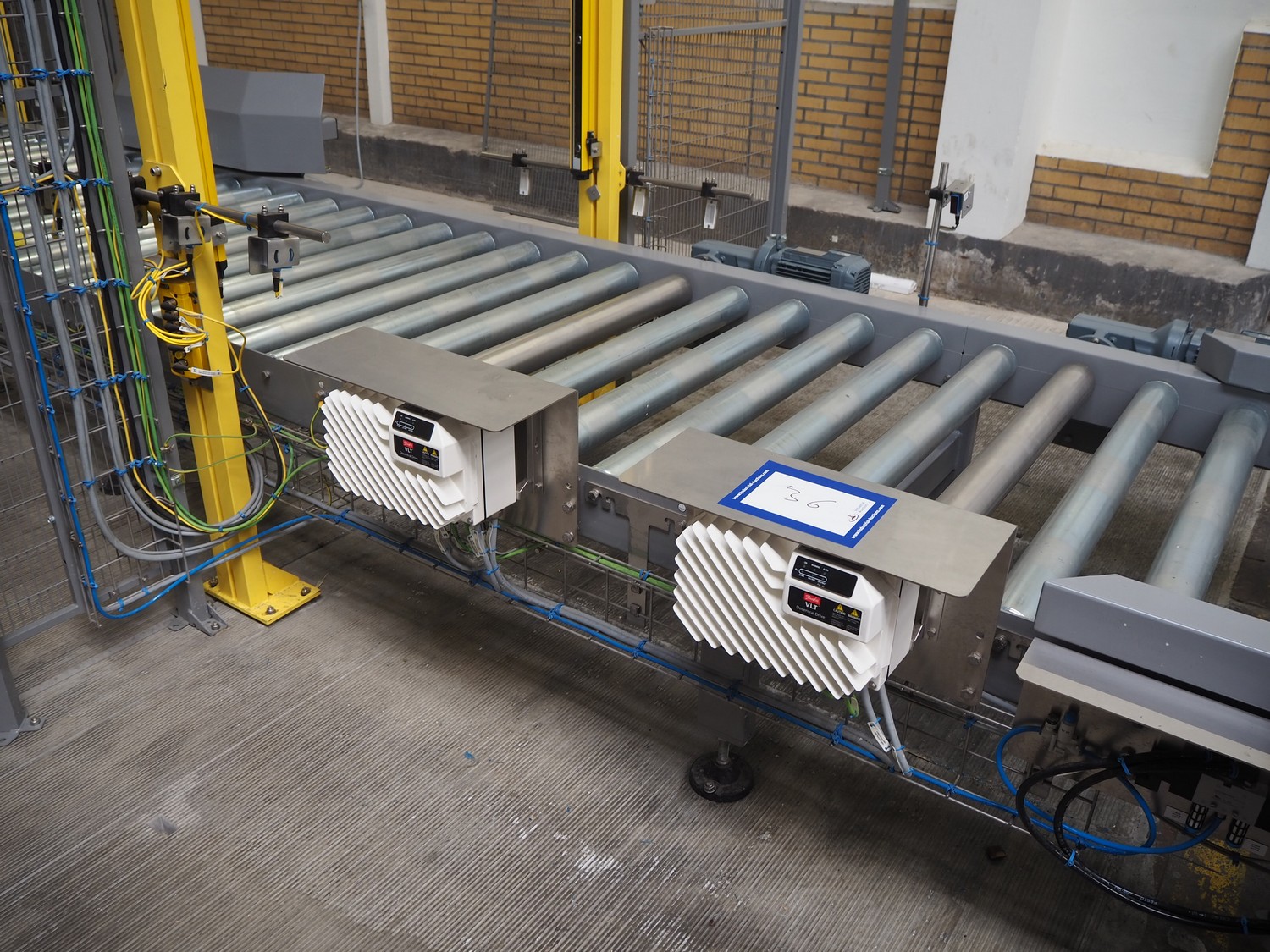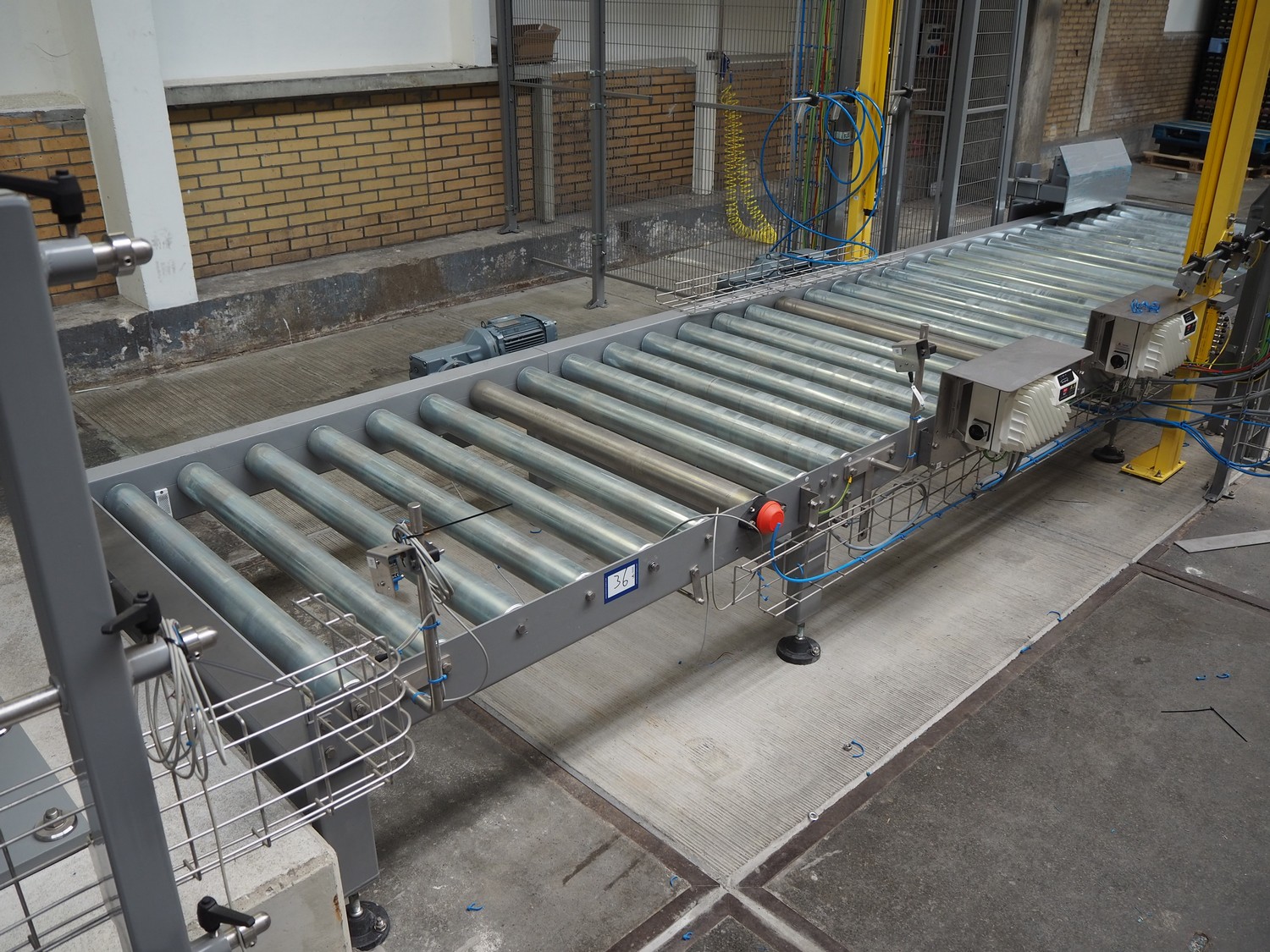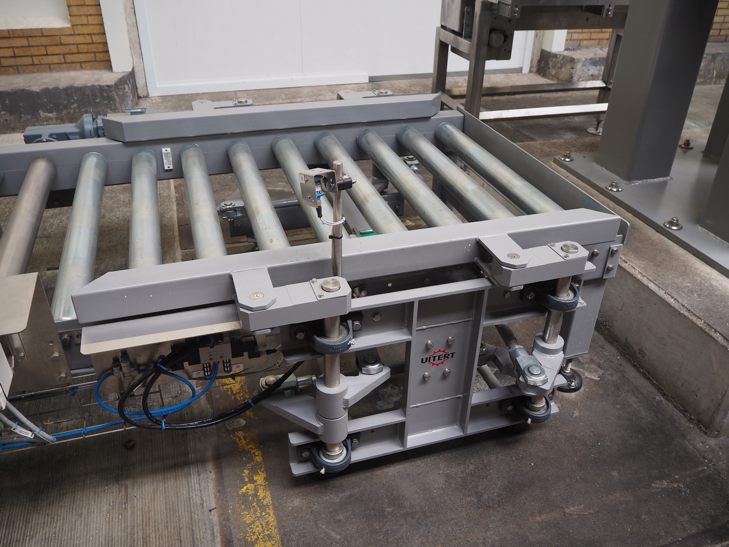 ABB AB/Uitert palletizing installation, consisting of: Uitert infeed roller conveyor, roller width: 1100 mm, total dimensions: 6000 mm x 1900 mm x 1000 mm, infeed unit for spacers, dimensions spacers: 1200 mm x 800 mm, total dimensions: 1700 mm x 1700 mm x 1600 mm, ABB AB palletizing robot, dimensions: 2400 mm x 1200 mm x 2400 mm, switch cabinet palettizing robot, type: IRC5 Single, serial number: 660-104128, date of manufacturing: 2023-06-08, 3x400 V, 56-60 Hz, 20 A, 10 kA, dimensions: 700 mm x 800 mm x 1400 mm, gripper table, dimensions: 1800 mm x 1300 mm x 1400 mm, uitert outfeed roller conveyor, roller width: 1100, total dimensions: 8700 mm x 1900 mm x 1000 mm, steel safety fence.
