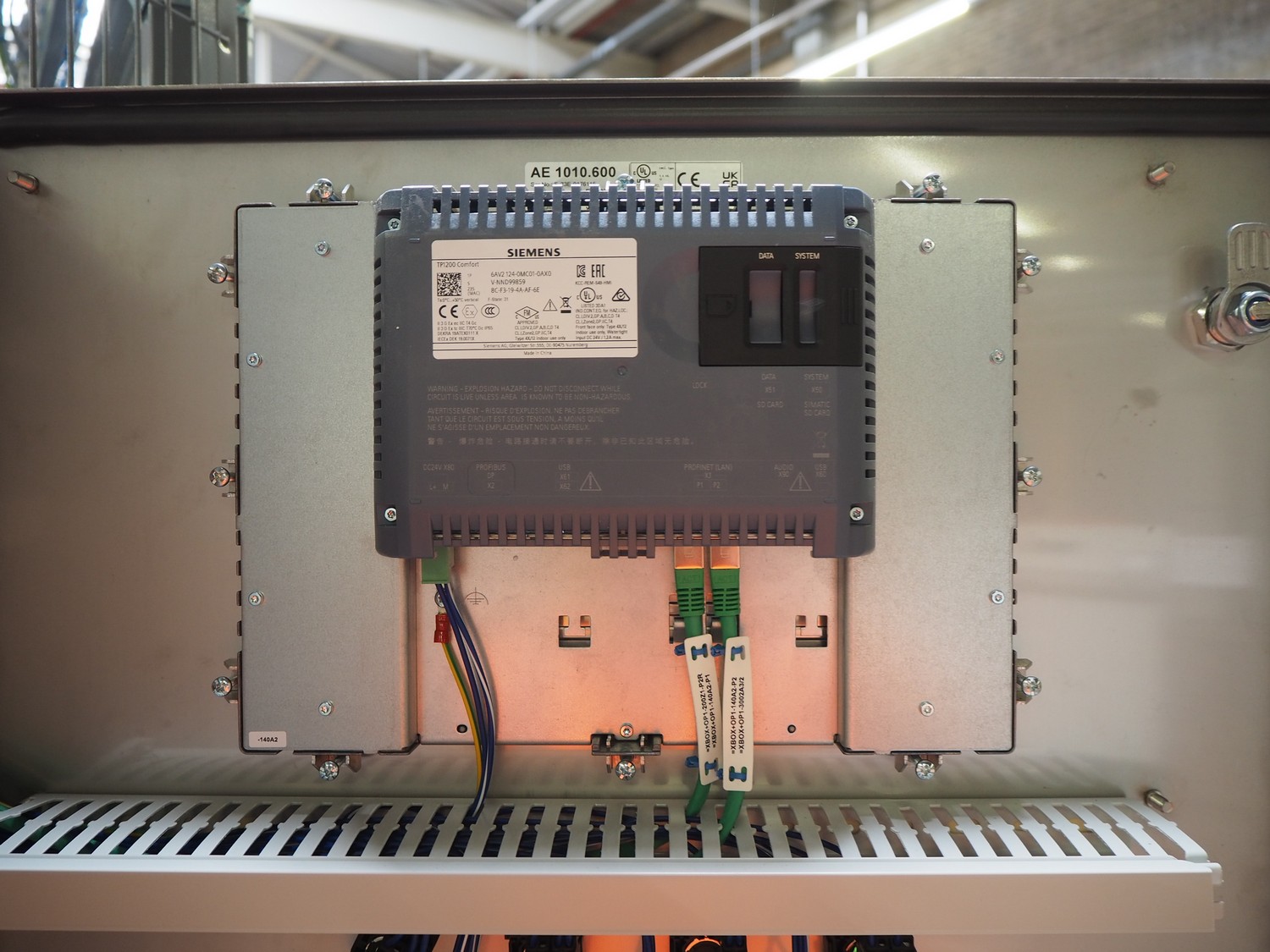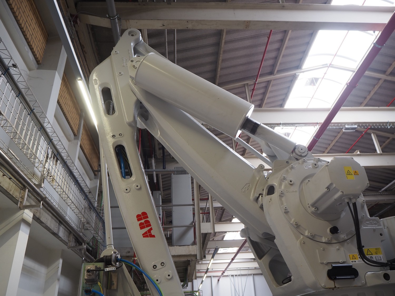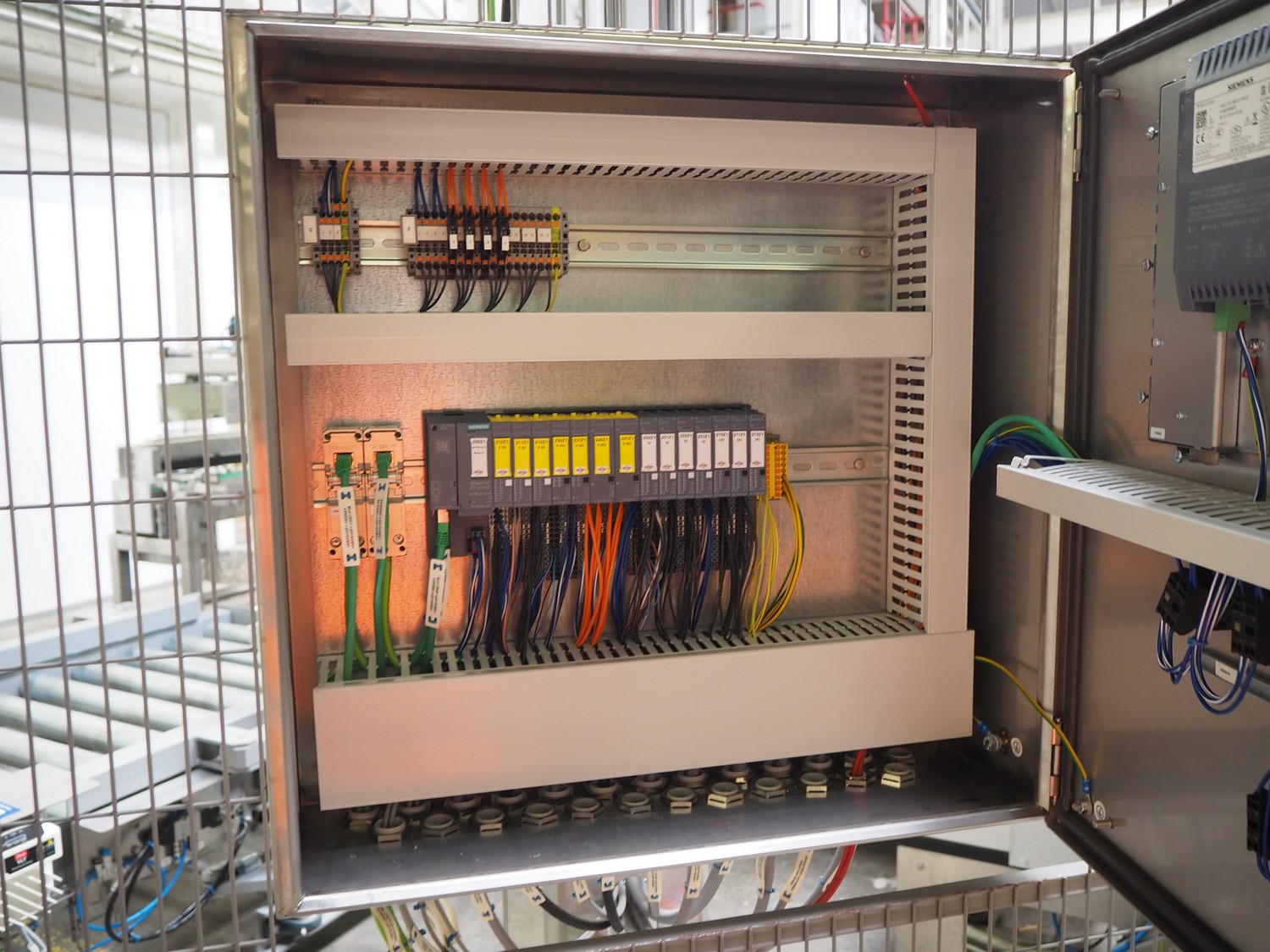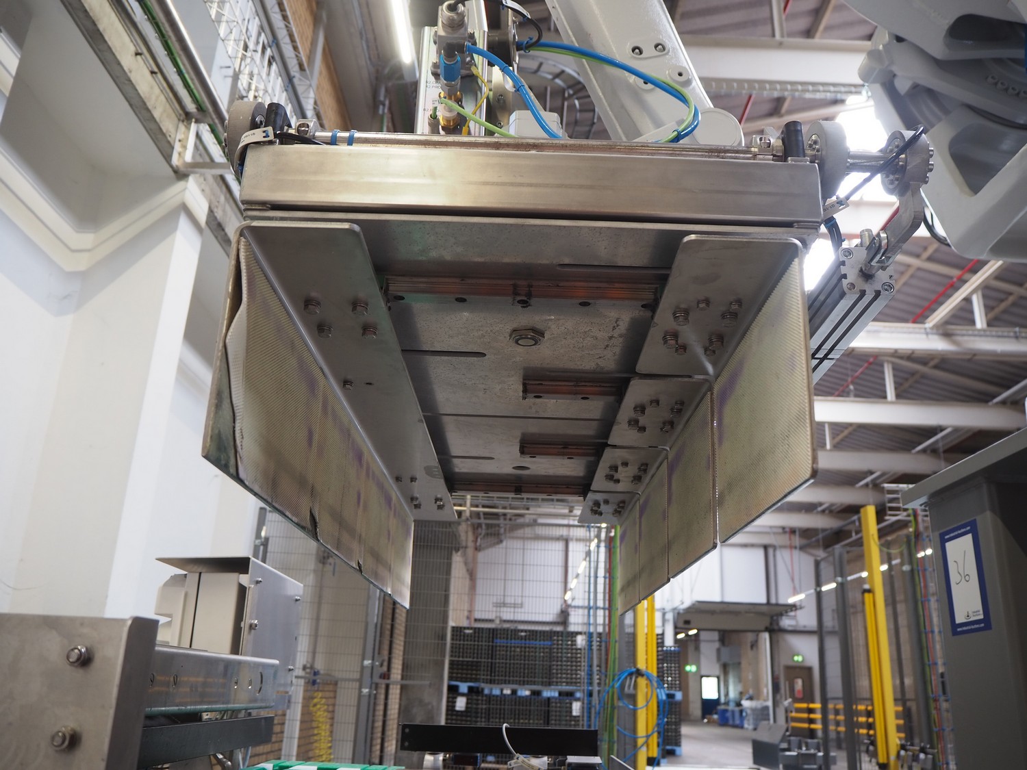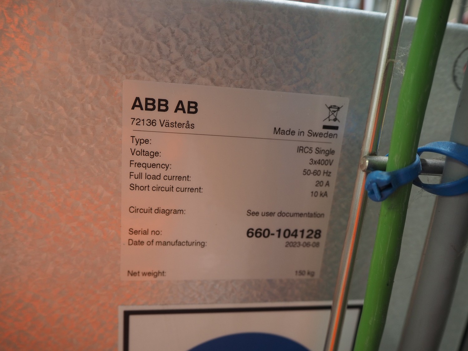 ABB AB/Uitert palletizing installation, consisting of: Uitert infeed roller conveyor, roller width: 1100 mm, total dimensions: 6000 mm x 1900 mm x 1000 mm, infeed unit for spacers, dimensions spacers: 1200 mm x 800 mm, total dimensions: 1700 mm x 1700 mm x 1600 mm, ABB AB palletizing robot, dimensions: 2400 mm x 1200 mm x 2400 mm, switch cabinet palettizing robot, type: IRC5 Single, serial number: 660-104128, date of manufacturing: 2023-06-08, 3x400 V, 56-60 Hz, 20 A, 10 kA, dimensions: 700 mm x 800 mm x 1400 mm, gripper table, dimensions: 1800 mm x 1300 mm x 1400 mm, uitert outfeed roller conveyor, roller width: 1100, total dimensions: 8700 mm x 1900 mm x 1000 mm, steel safety fence.