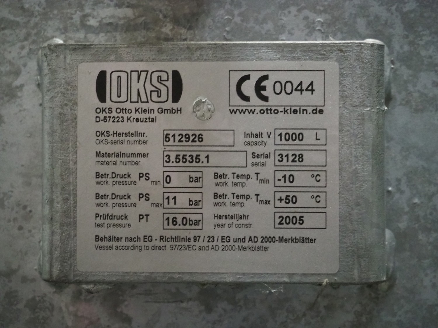 OKS Otto Klein GmbH pressure vessel, material number: 3.5535.1, OKS serial number: 512926, serial number: 3128, year of construction: 2005, capacity: 1000 liter, 11/16 bar, minimum work temperature: -10°C, maximum work temperature: +50°C, dimensions: 950 mm x 1000 mm x 2300 mm.