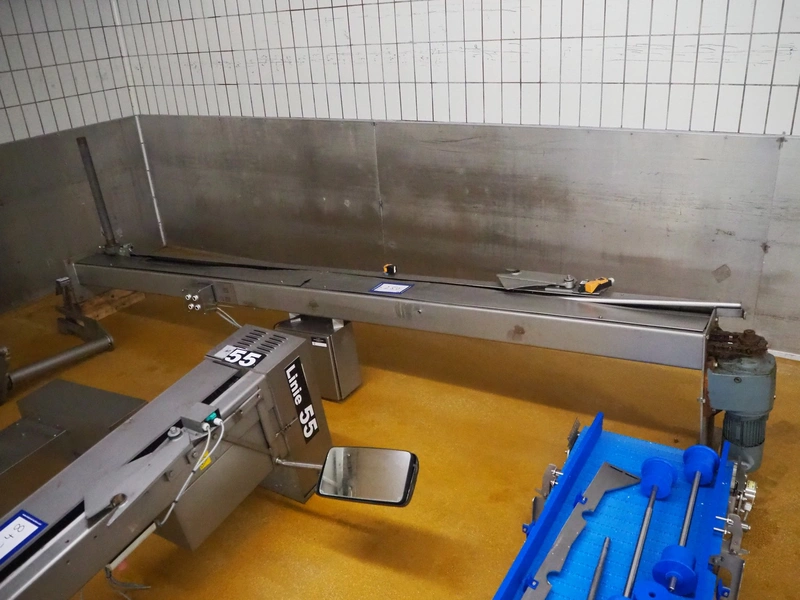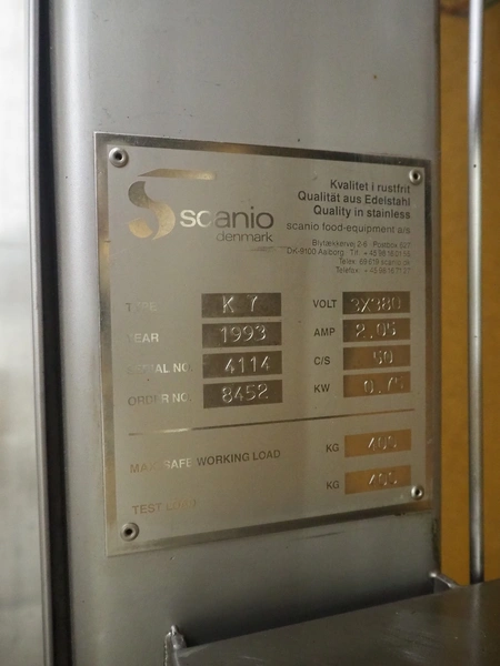 Scanio lifter for meat bins, type: K7, serial number: 4114, year of construction: 1993, 380 V, 3 Ph, 50 Hz, 2.05 A, 0.75 kW, capacity: 400 kg, lifting height: 3200 mm, total dimensions: 4400 mm x 550 mm x 1350 mm.
