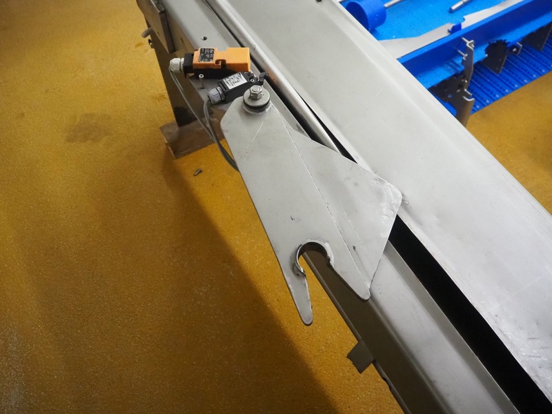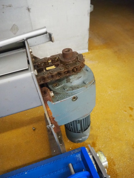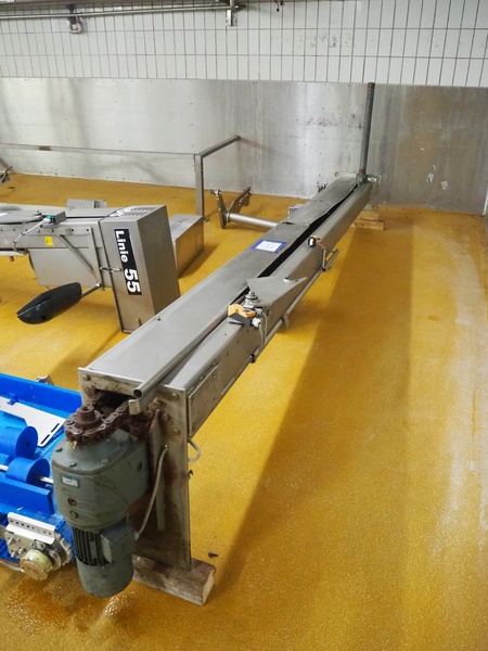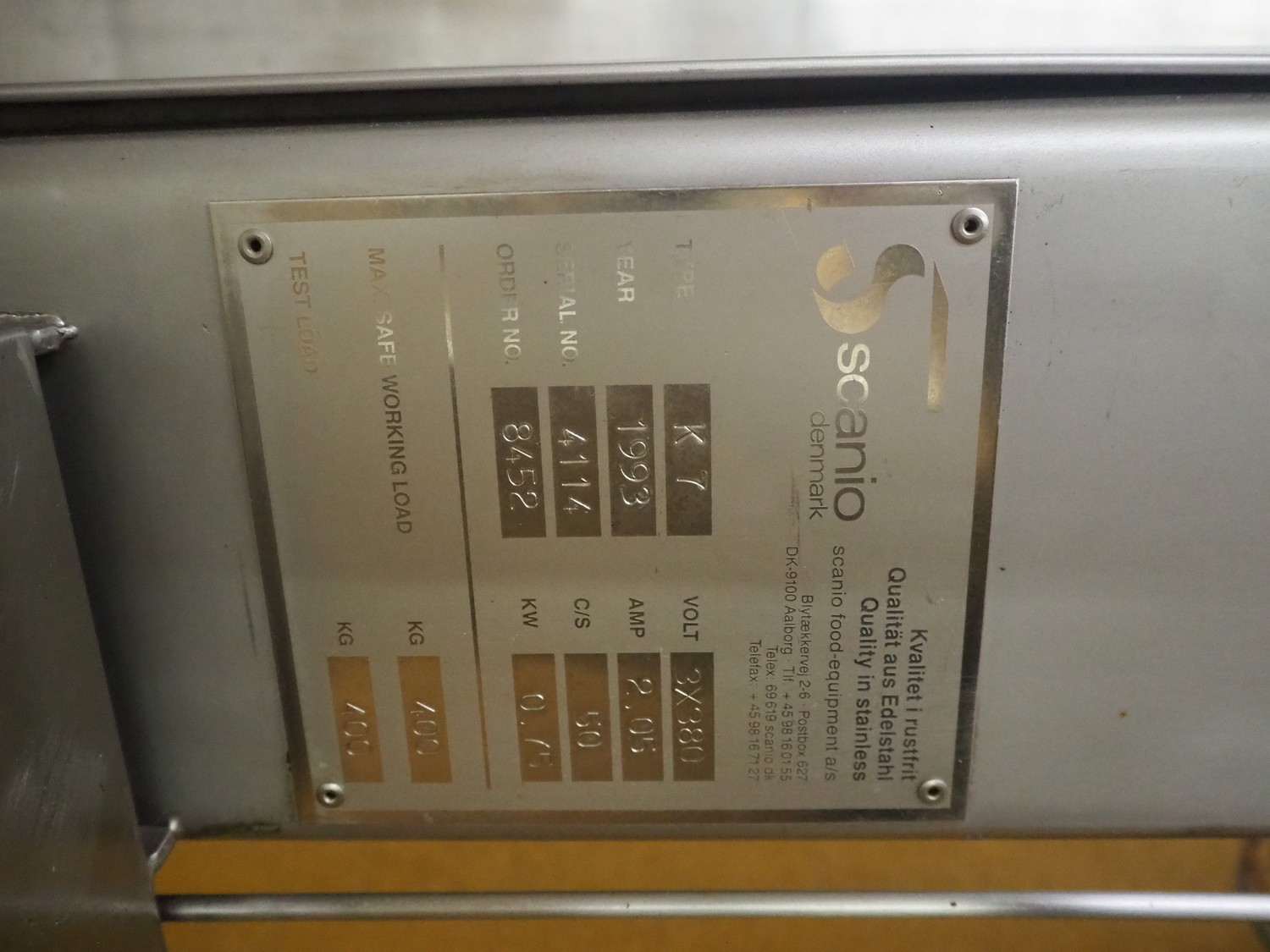 Scanio lifter for meat bins, type: K7, serial number: 4114, year of construction: 1993, 380 V, 3 Ph, 50 Hz, 2.05 A, 0.75 kW, capacity: 400 kg, lifting height: 3200 mm, total dimensions: 4400 mm x 550 mm x 1350 mm.