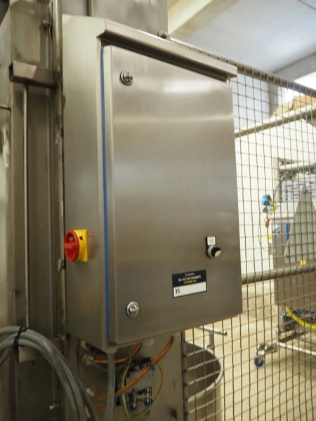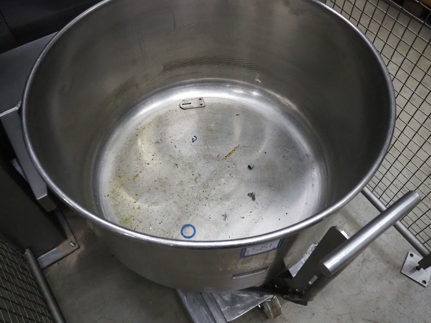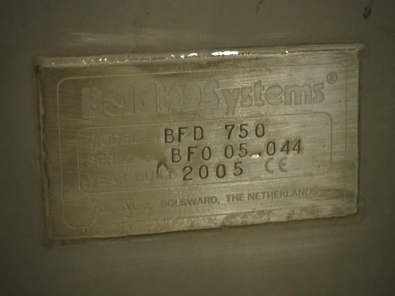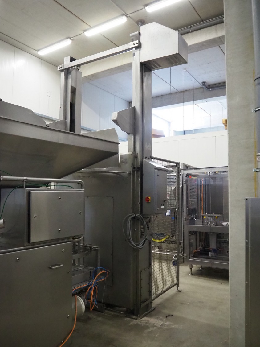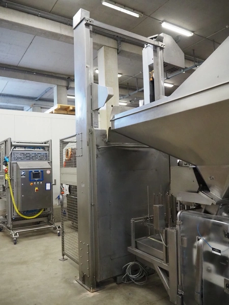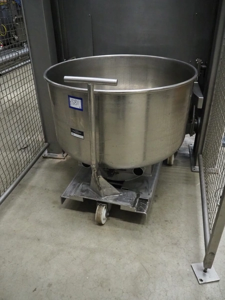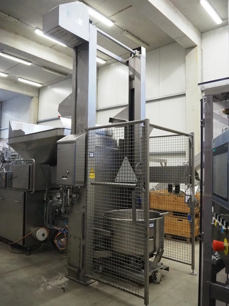 Boldt Systems lifter for mixing bowls, model: BFD 750, serial number: BFO 05_044, year of construction: 2005, capacity: 500 kg, lifting height: 2750 mm, total dimensions: 2000 mm x 1850 mm x 4100 mm. Including mobile s/s mixing bowl, dimensions bowl: Ø 970 mm x 530 mm, total dimensions: 1150 mm x 1000 mm x 950 mm.