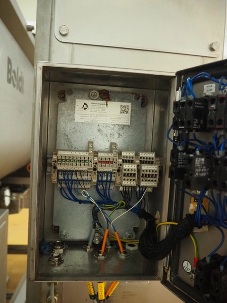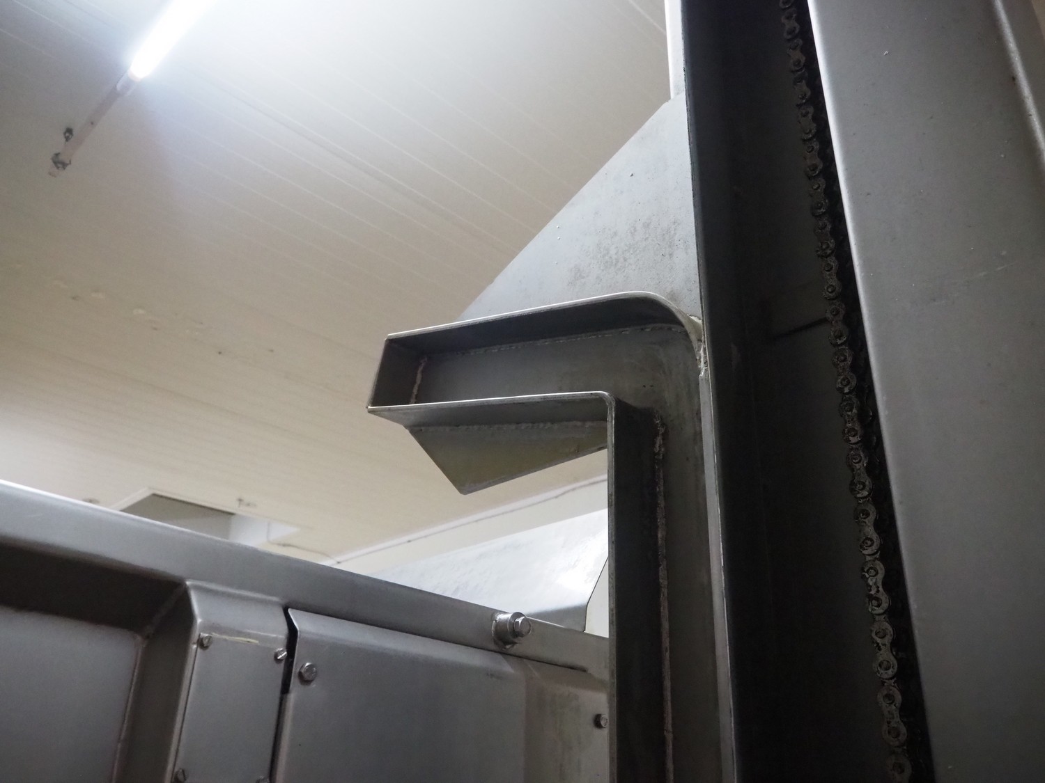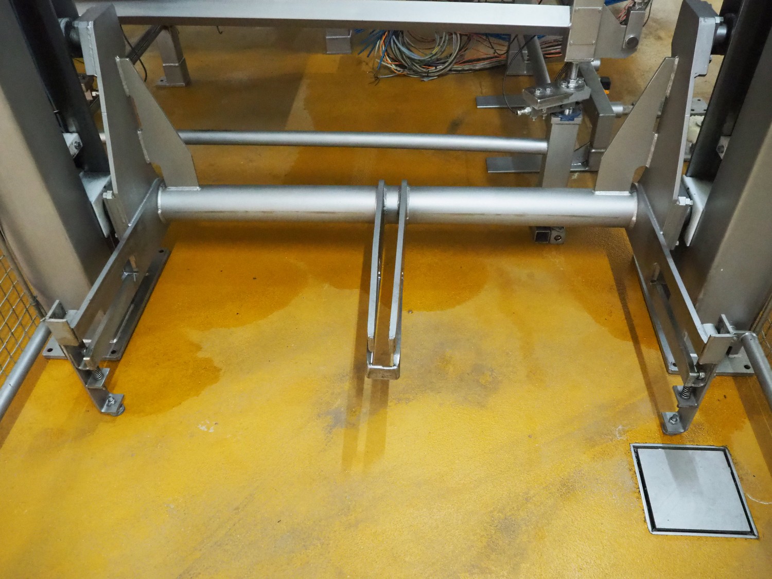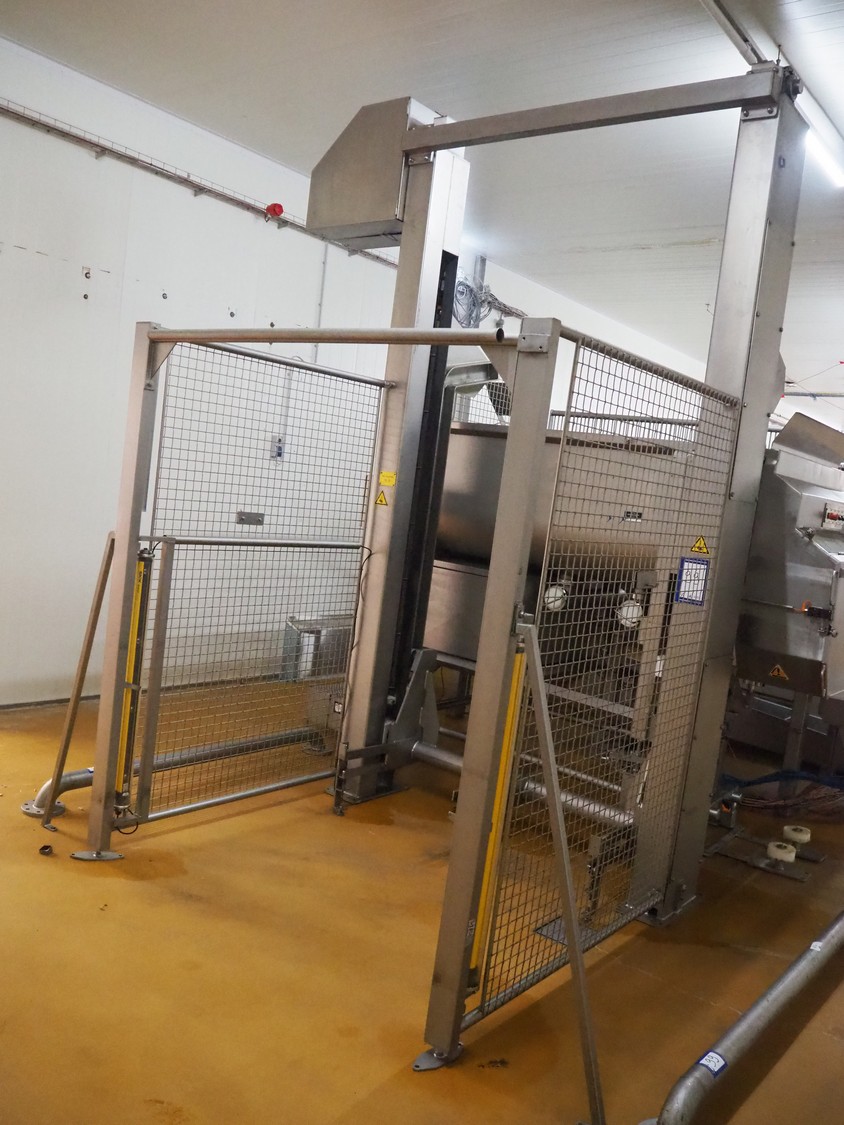 Boldt Systems double lifter for meat bins, model: BFDD 750, serial number: BFO 12-093.03, year of construction: 2013, lifting height: 2400 mm, total dimensions: 3000 mm x 2600 mm x 3800 mm.
