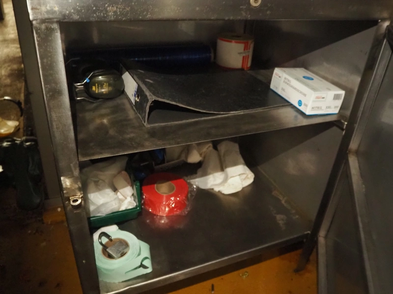 S/s cabinet with writing desk, dimensions: 810 mm x 620 mm x 1120 mm.