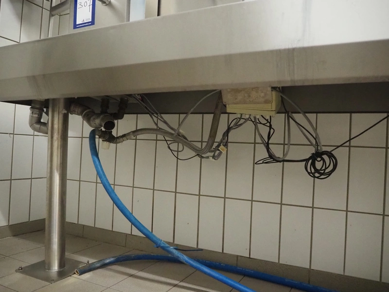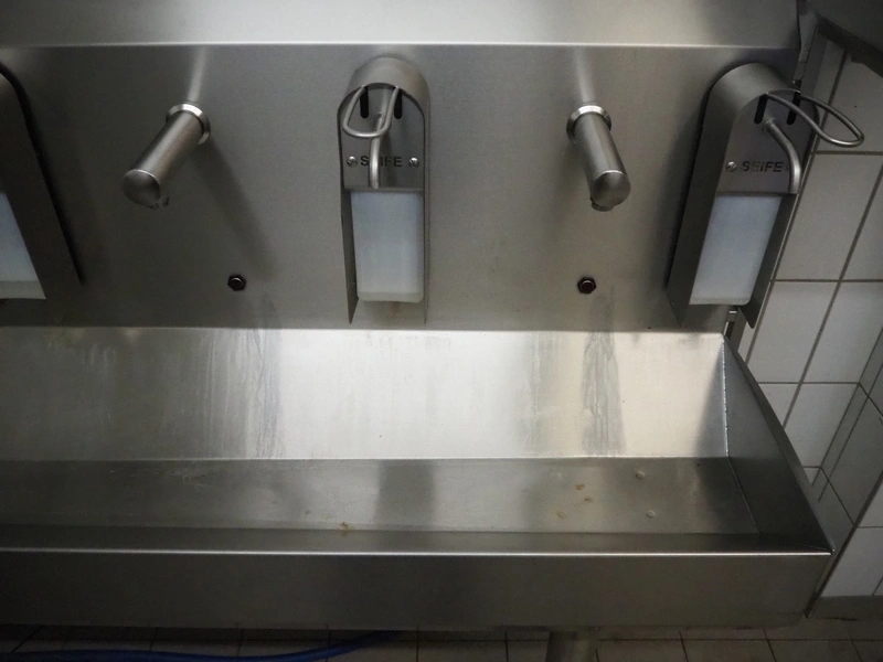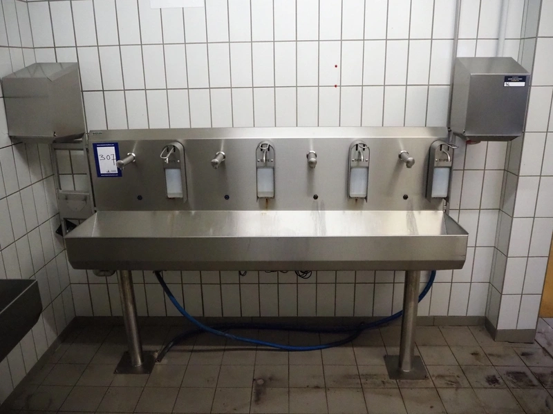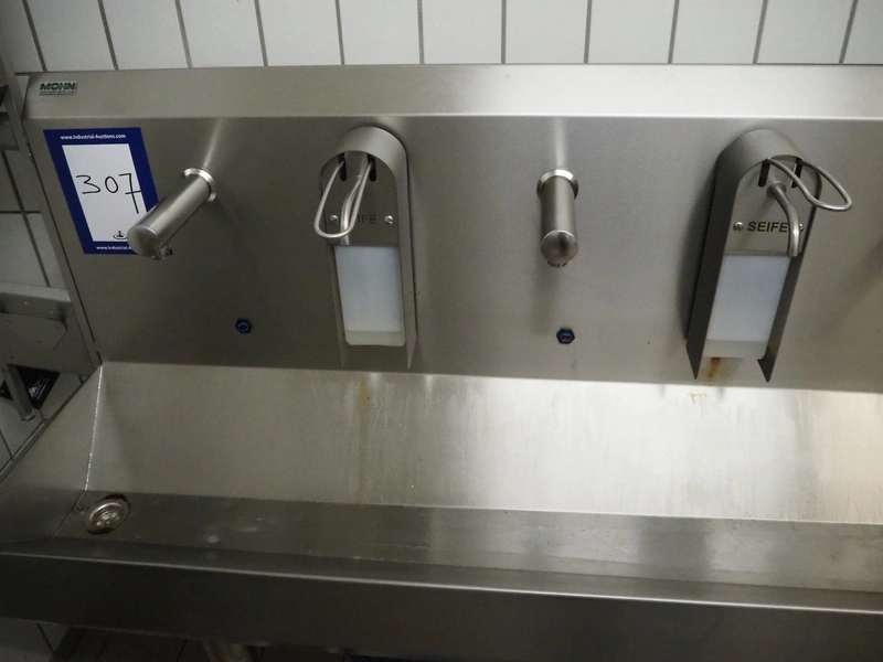 Mohn s/s sink with 4 faucets and soap dispensers and 2 paper dispensers, sensor operated, dimensions: 2600 mm x 600 mm x 1750 mm.