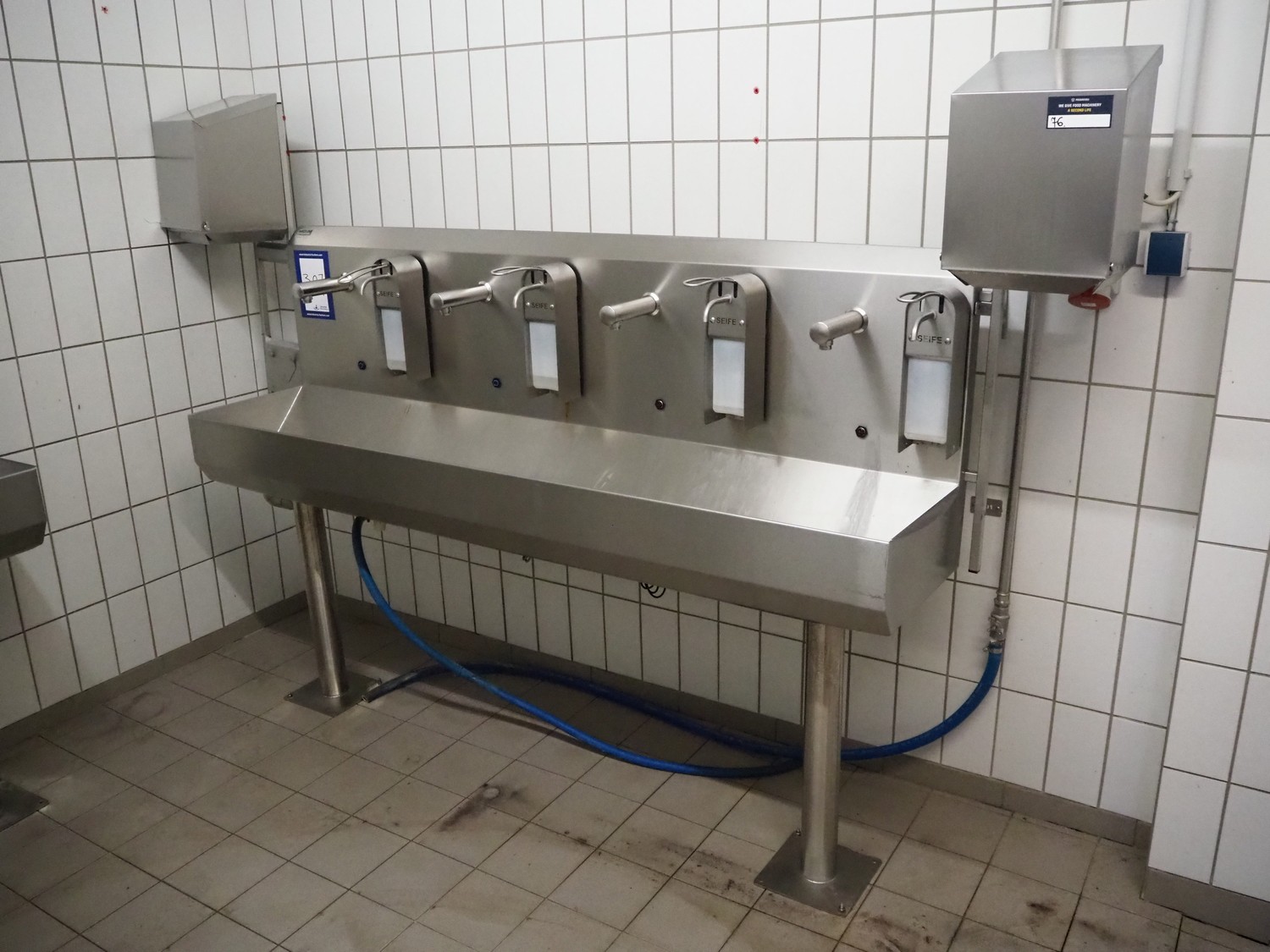 Mohn s/s sink with 4 faucets and soap dispensers and 2 paper dispensers, sensor operated, dimensions: 2600 mm x 600 mm x 1750 mm.