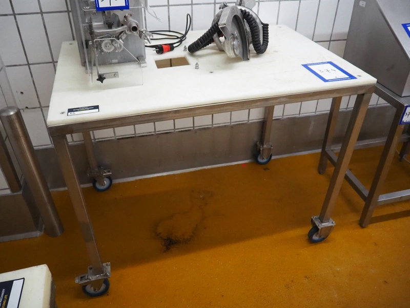 Mobile s/s table with plastic work top, dimensions: 1200 mm x 800 mm x 970 mm.