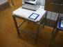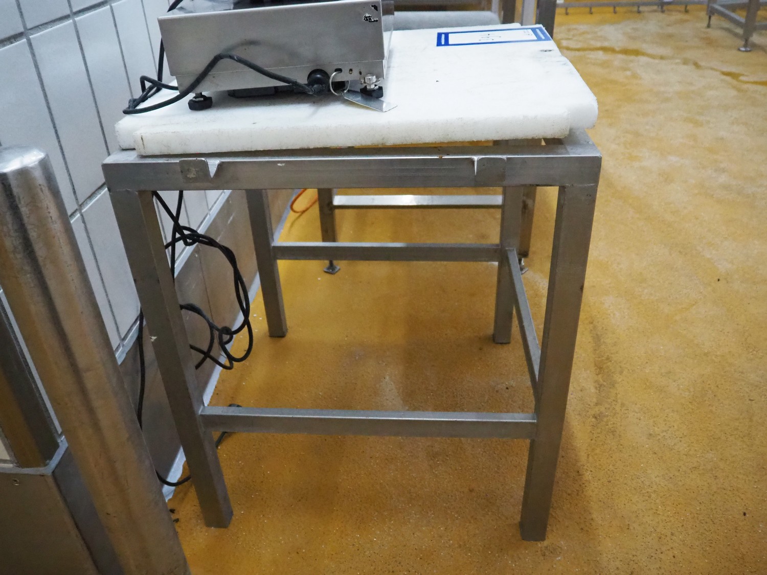 S/s table, plastic worktop, dimensions: 680 mm x 620 mm x 760 mm.