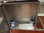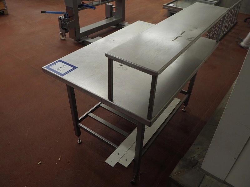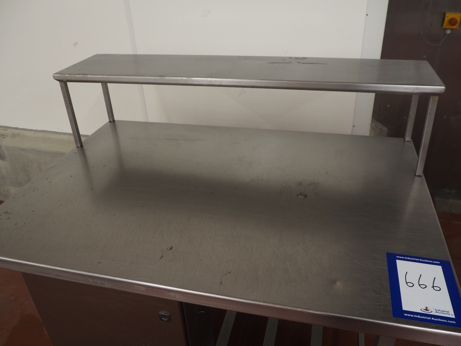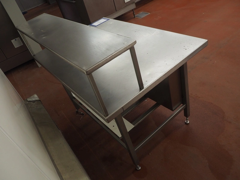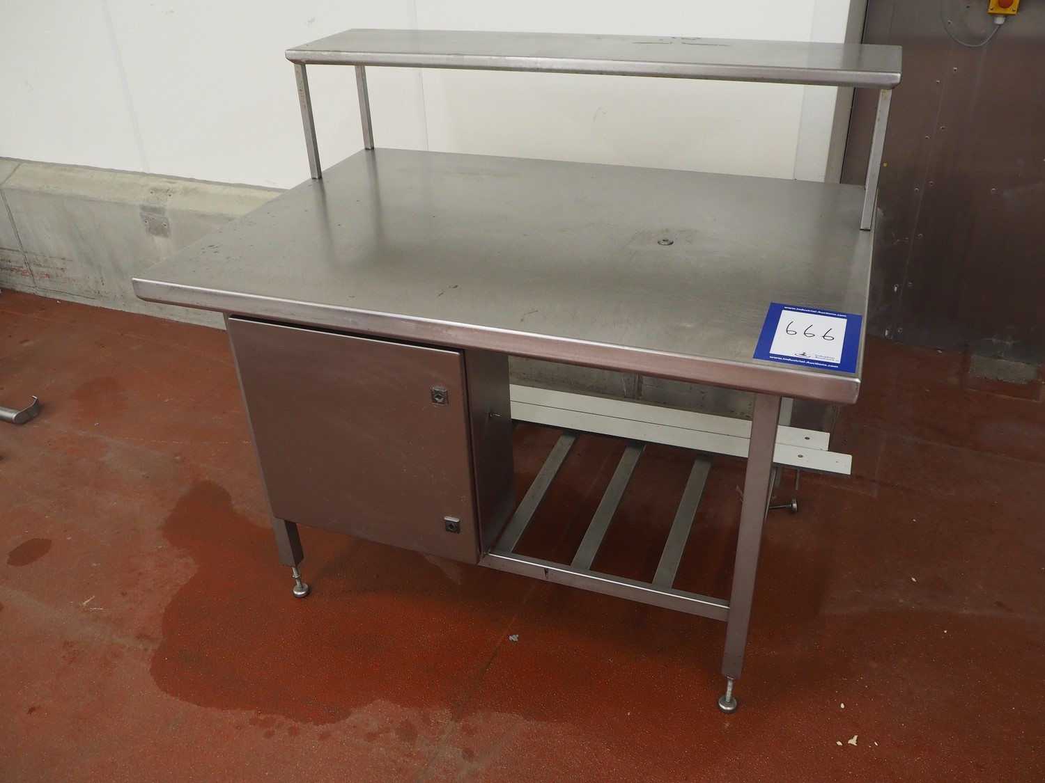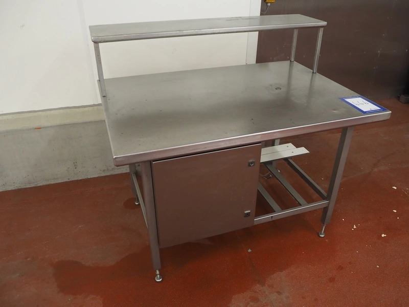 S/s table with cabinet, working height: 880 mm, total dimensions: 1300 mm x 900 mm x 1150 mm.