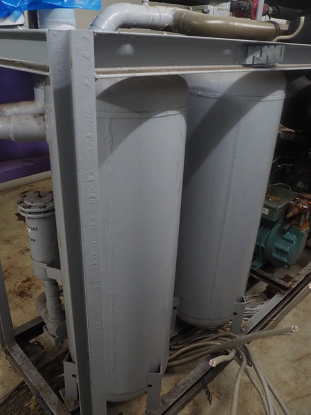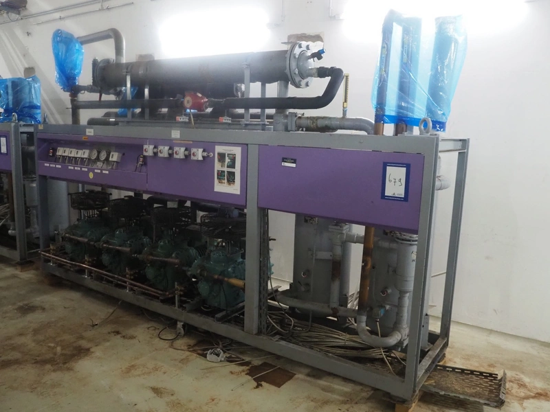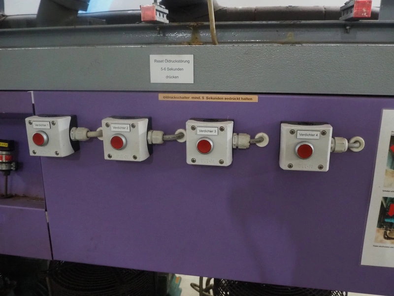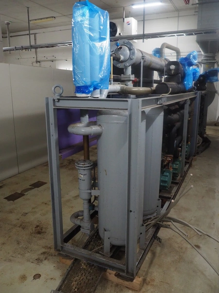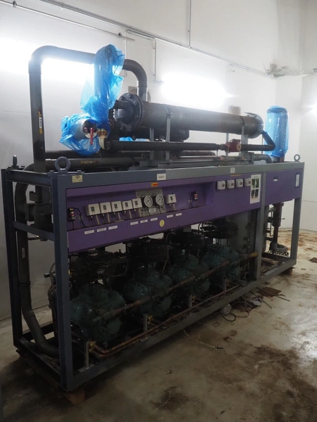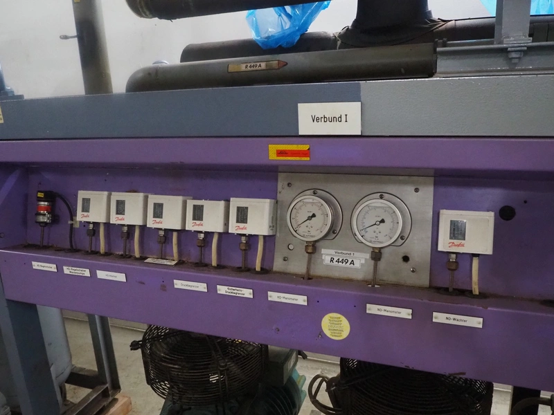 HRS compressor rack with 3 HRS cooling compressors and 1 Green Point cooling compressor, model HRS compressors: 6G 30.2Y, type Green Point compressor: 6G-40.2-40P, capacity: 126/153 m³/h, refrigerant: R449a, dimensions: 3600 mm x 800 mm x 2300 mm.
