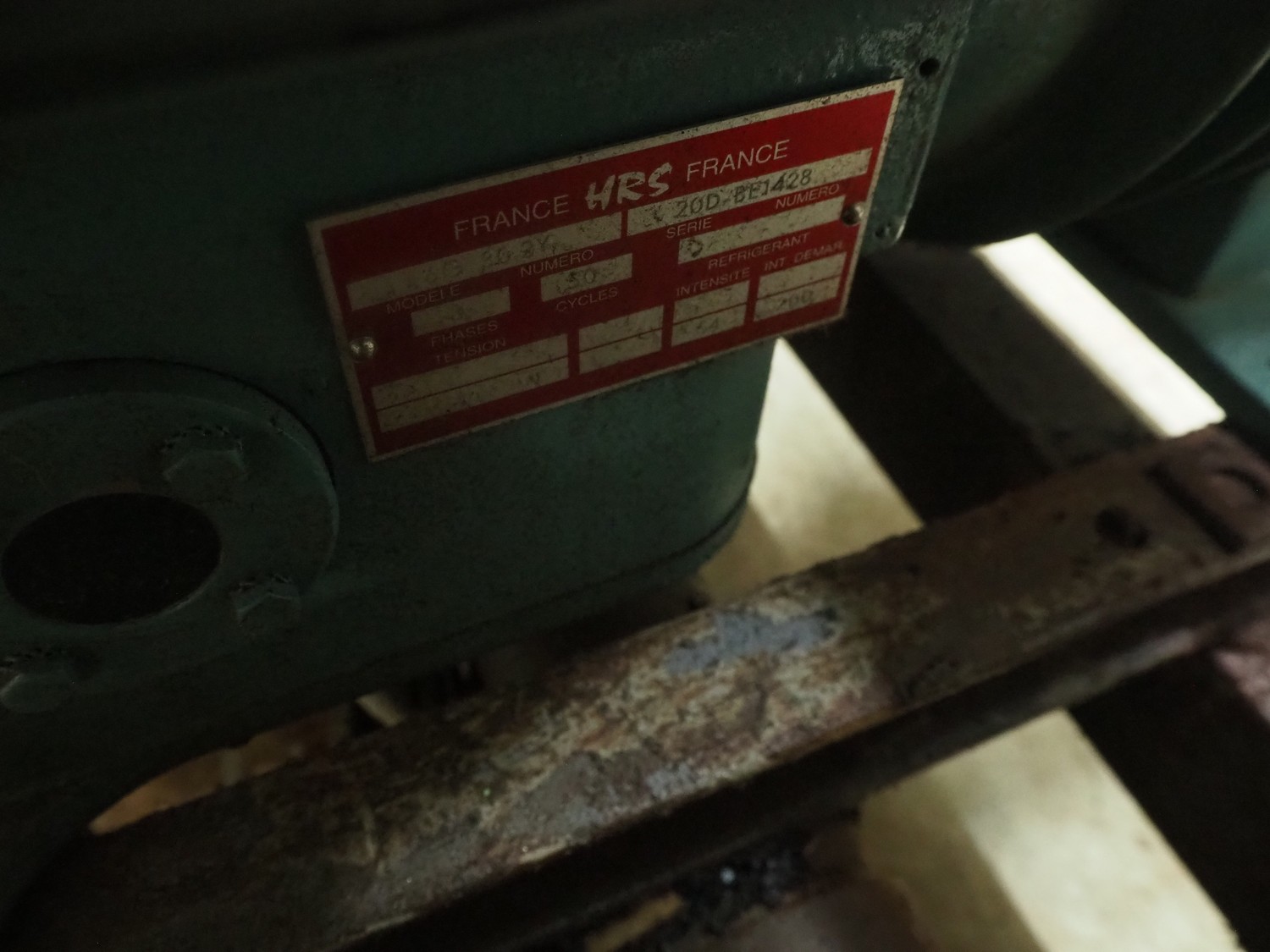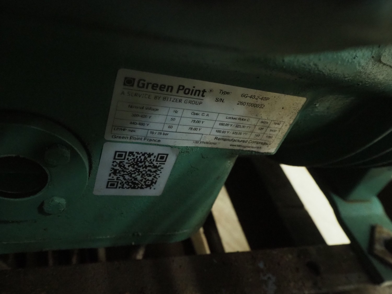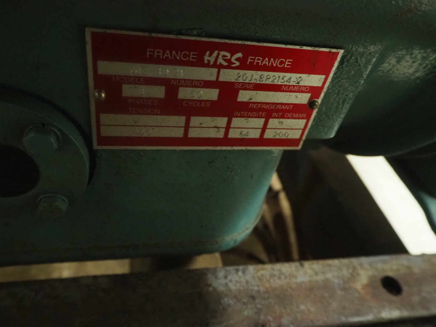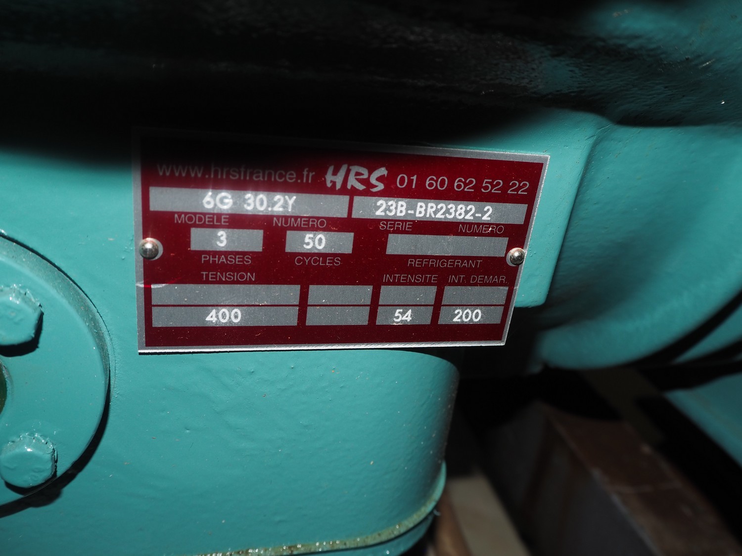 HRS compressor rack with 3 HRS cooling compressors and 1 Green Point cooling compressor, model HRS compressors: 6G 30.2Y, type Green Point compressor: 6G-40.2-40P, capacity: 126/153 m³/h, refrigerant: R449a, dimensions: 3600 mm x 800 mm x 2300 mm.