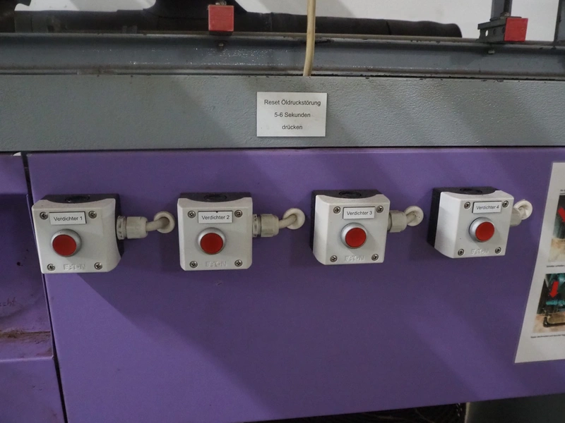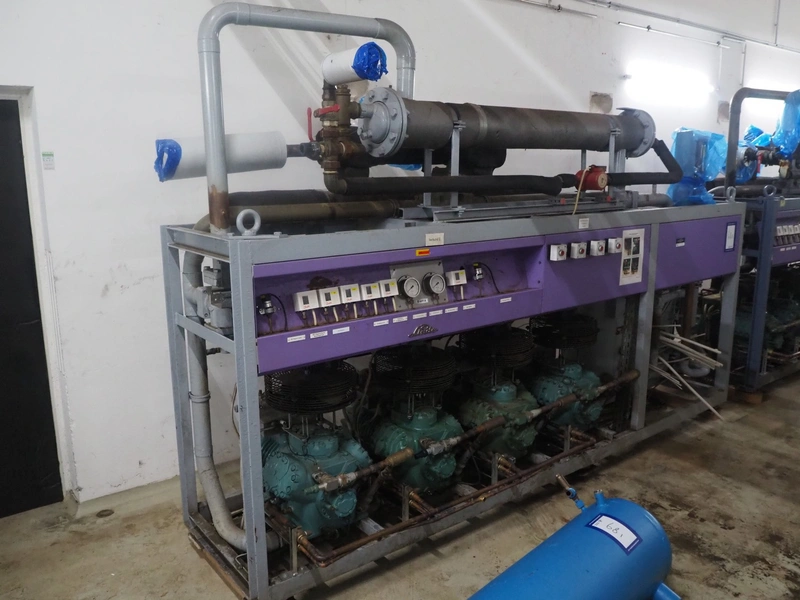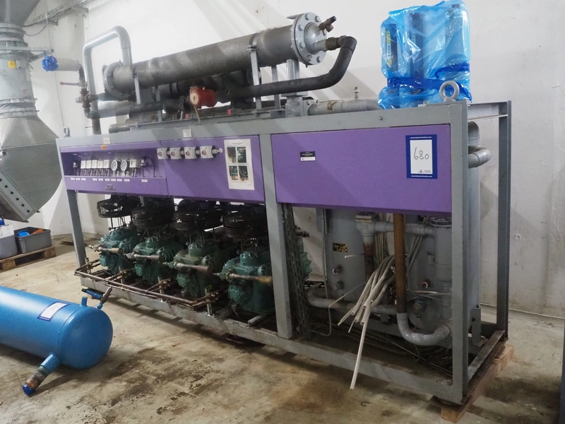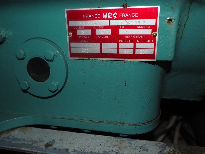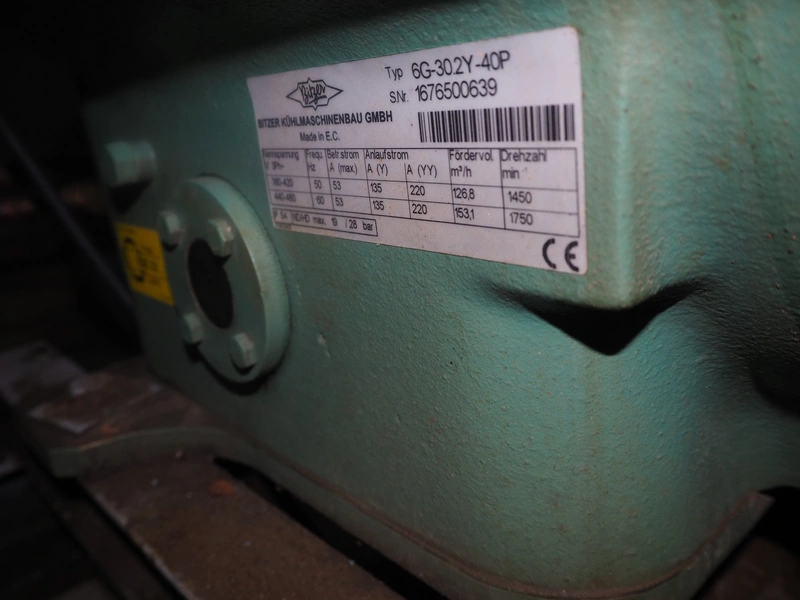 HRS compressor rack with 2 HRS cooling compressors, 1 Bitzer cooling compressor and 1 Green Point cooling compressor, model HRS compressors: 6G 30.2Y, capacity: 126/153 m³/h, type Green Point compressor: 6G-30.2-40P, capacity: 126.8/153.1 m³/h, type Bitzer cooling compressor: 6G-30.2Y-40P, refrigerant: R449a, dimensions: 3600 mm x 800 mm x 2300 mm.