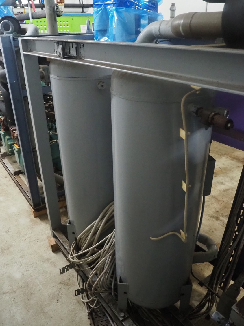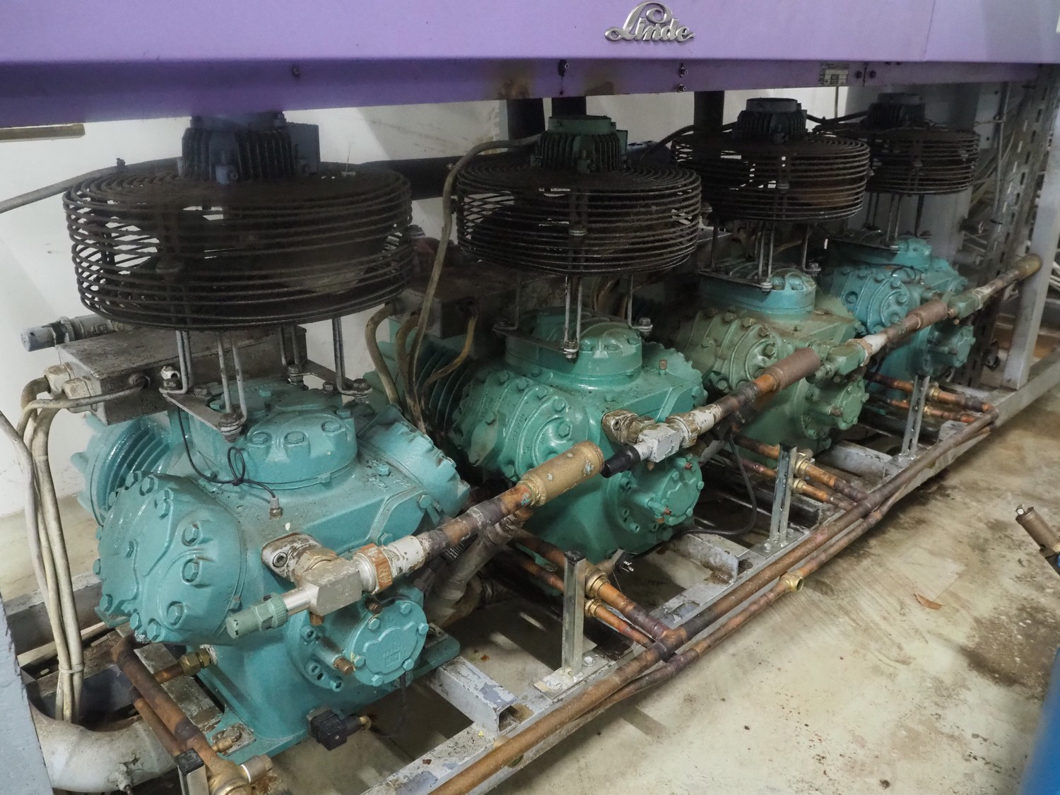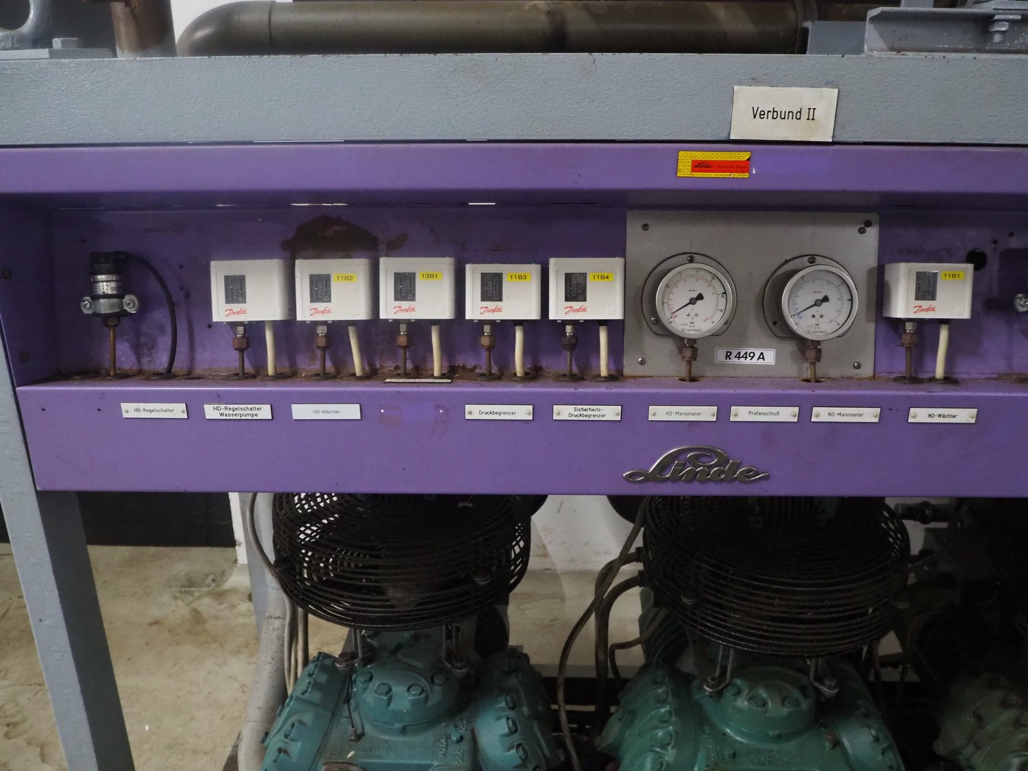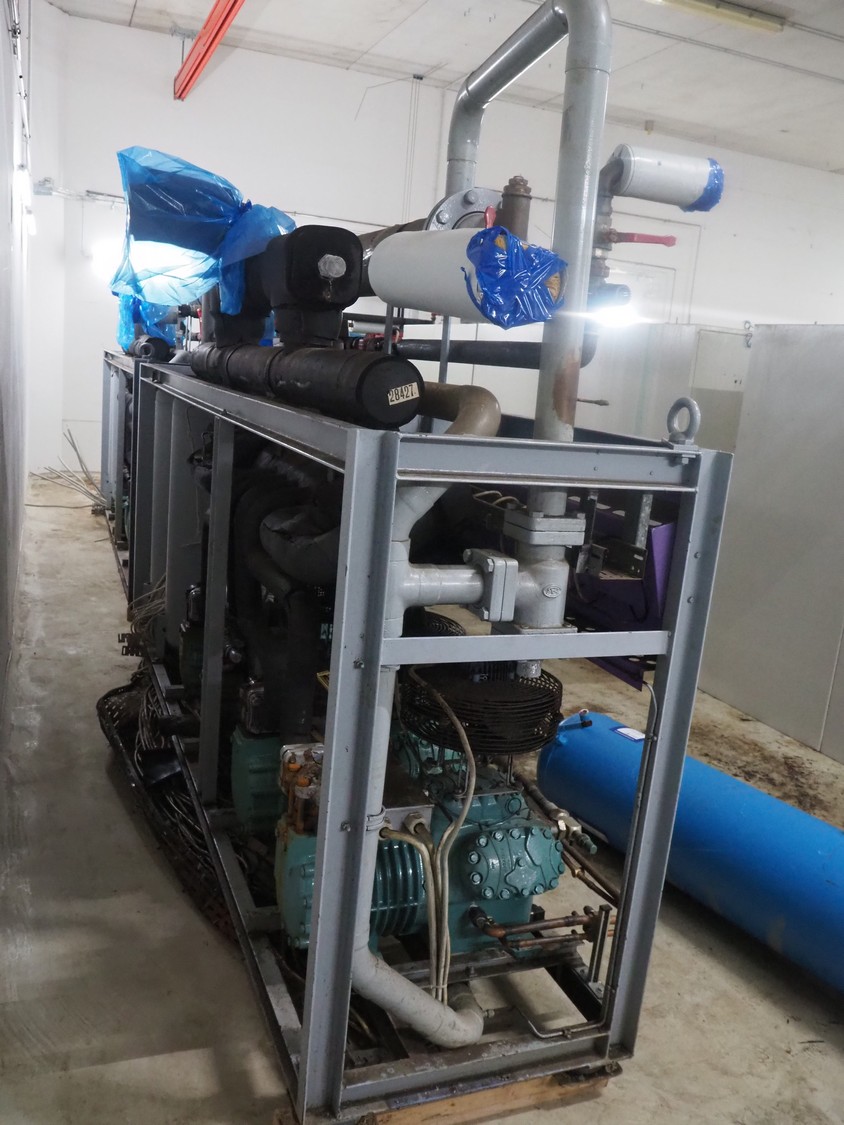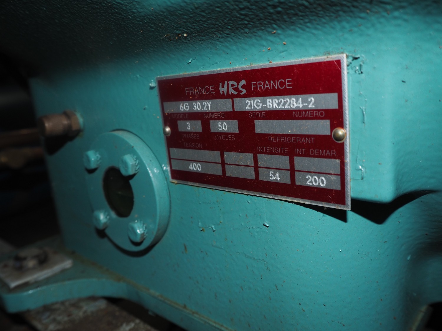 HRS compressor rack with 2 HRS cooling compressors, 1 Bitzer cooling compressor and 1 Green Point cooling compressor, model HRS compressors: 6G 30.2Y, capacity: 126/153 m³/h, type Green Point compressor: 6G-30.2-40P, capacity: 126.8/153.1 m³/h, type Bitzer cooling compressor: 6G-30.2Y-40P, refrigerant: R449a, dimensions: 3600 mm x 800 mm x 2300 mm.