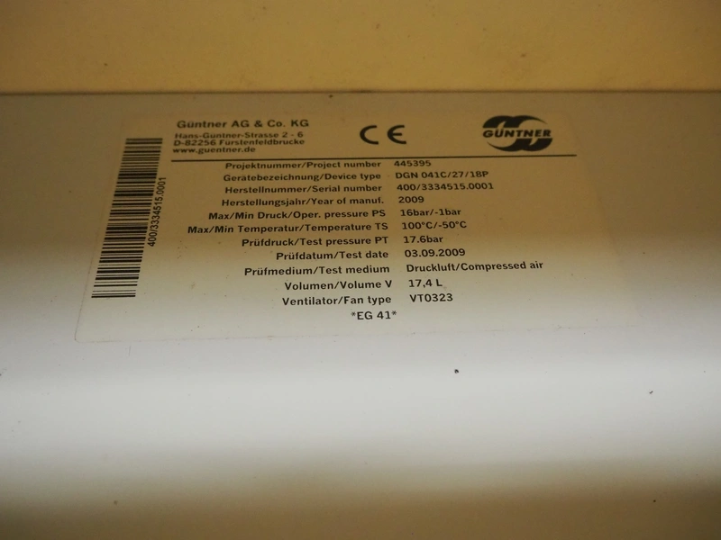 Güntner GmbH & Co. KG evaporator, device type: DGN 041C/27/18P, serial number: 400/333451501, year of construction: 2009, maximum / minimum pressure: 16 bar / - 1 bar, maximum / minimum temperature: 100˚C / -50˚C, volume: 17.4 liter, 2 fans, dimensions: 1900 mm x 1600 mm x 450 mm.