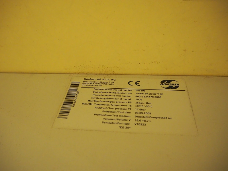 Güntner GmbH & Co. KG evaporator, device type: S-DGN 041C/37/12P, serial number: 400/333447903, year of construction: 2009, maximum / minimum pressure: 16 bar / - 1 bar, maximum / minimum temperature: 100˚C / -50˚C, volume: 16.6 + 8.7 liter, 3 fans, dimensions: 2600 mm x 1600 mm x 450 mm.