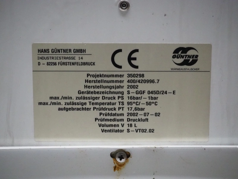 3 Güntner GmbH & Co. KG evaporator, 2 fans, type: (1x) 24-AHS51/8P.E / (2x) S-GGF 045D/24-E, serial number: (1x) 3298254.0001 / (1x) 400/420996.3 / (1x) 400/420996.7, year of construction: (2x) 2002 / (1x) 2009, PS: 16/-1 bar, TS: 100/-50 °C, TS: 17.6 bar, volume: 21 liter, dimensions: (2x) 1900 mm x 600 mm x 630 mm.