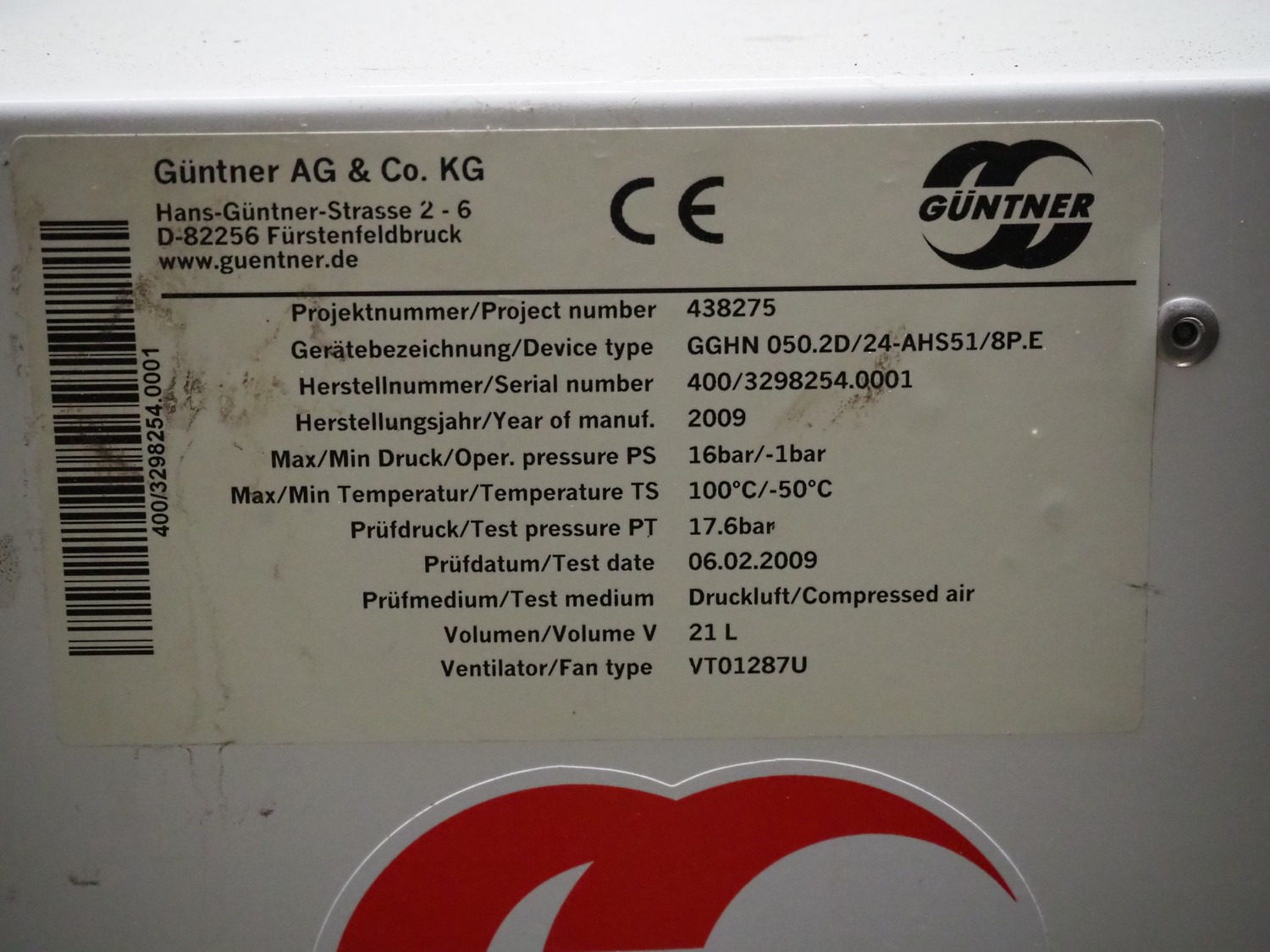 3 Güntner GmbH & Co. KG evaporator, 2 fans, type: (1x) 24-AHS51/8P.E / (2x) S-GGF 045D/24-E, serial number: (1x) 3298254.0001 / (1x) 400/420996.3 / (1x) 400/420996.7, year of construction: (2x) 2002 / (1x) 2009, PS: 16/-1 bar, TS: 100/-50 °C, TS: 17.6 bar, volume: 21 liter, dimensions: (2x) 1900 mm x 600 mm x 630 mm.