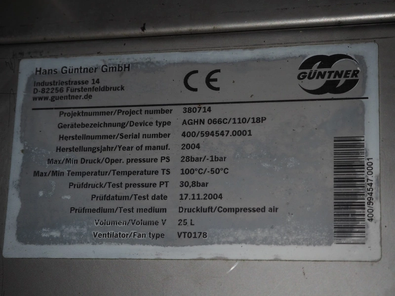 Güntner GmbH & Co. KG evaporator, type: AGHN 066C/110/18P, serial number: 400/594547.0001, year of construction: 2004, 1 fan, fan type: VT0178, dimensions: 1900 mm x 900 mm x 1100 mm.