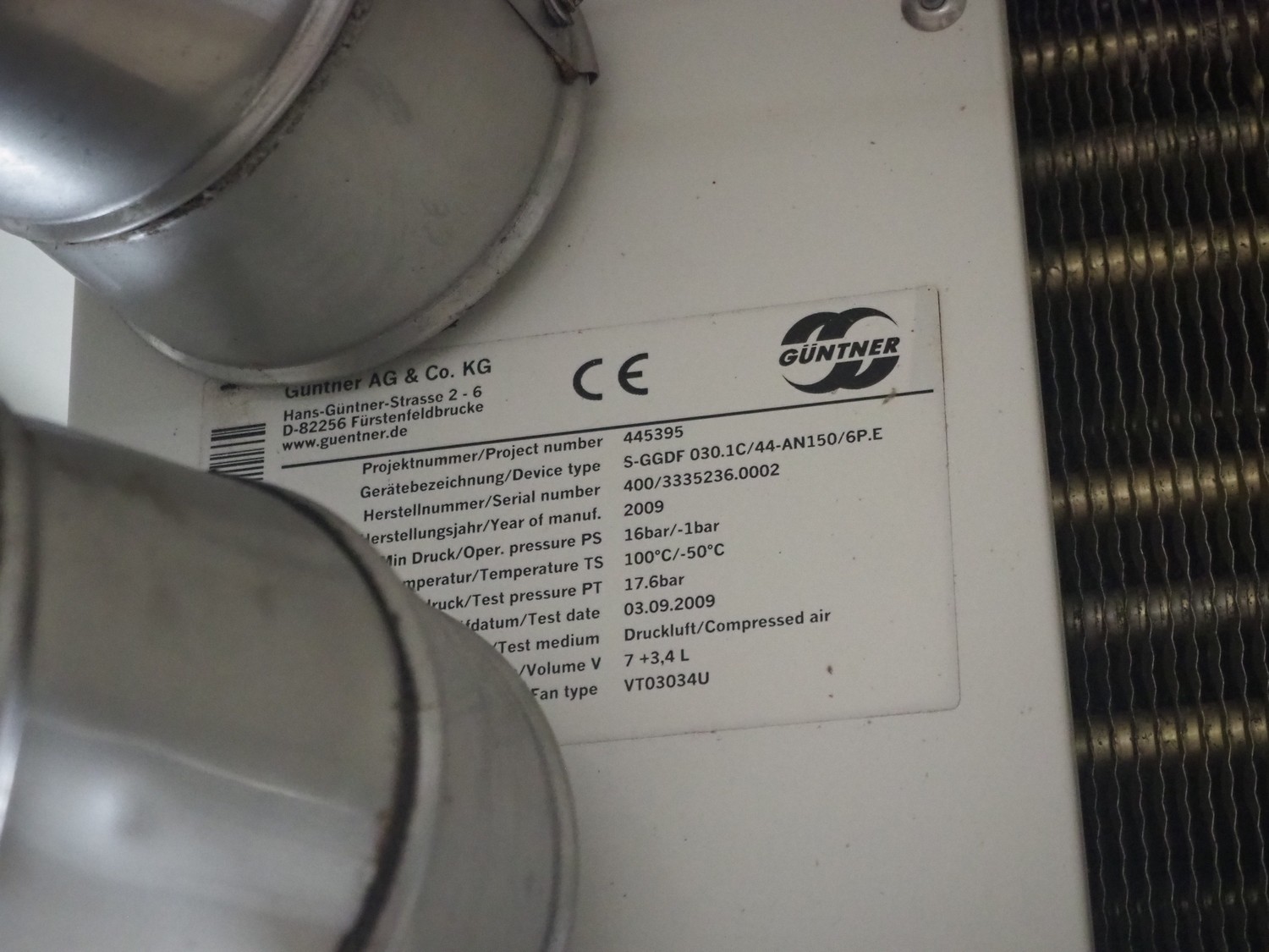 Güntner GmbH & Co. KG evaporator, device type: S-GGDF 030.1C/44-AN150/6P.E, unit serial number: 400/333523602, year of construction: 2009, volume: 7+3.4 liter, maximum/minimum permissible pressure: 16 / -1 bar, maximum/minimum permissible temperature: -50 C° / +100 C°, test medium: compressed air, 4 fans, total dimensions: 3200 mm x 500 mm x 350 mm.