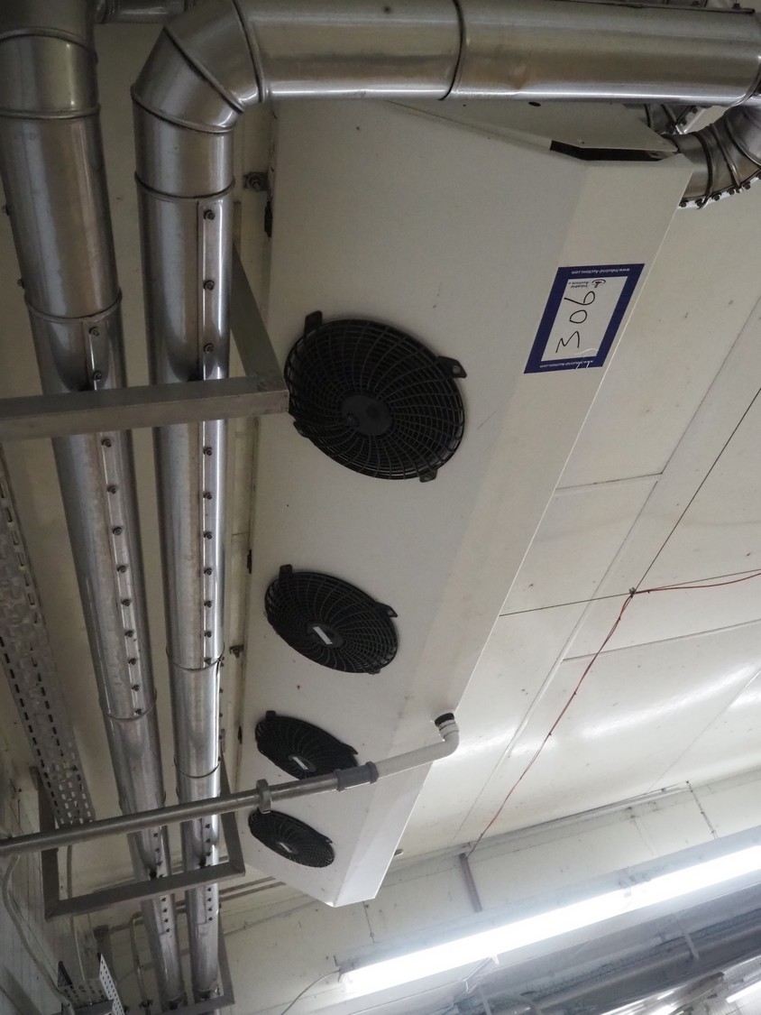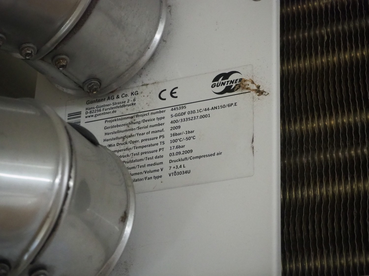 Güntner GmbH & Co. KG evaporator, device type: S-GGDF 030.1C/44-AN150/6P.E, unit serial number: 400/333523701, year of construction: 2009, volume: 7+3.4 liter, maximum/minimum permissible pressure: 16 / -1 bar, maximum/minimum permissible temperature: -50 C° / +100 C°, test medium: compressed air, 4 fans, total dimensions: 3200 mm x 500 mm x 350 mm.