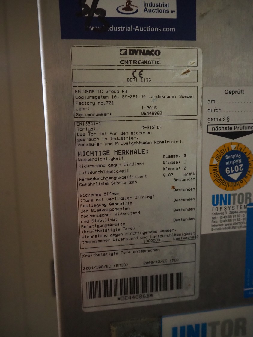 Dynaco Entrematic electric high speed shutter door, door type: D-313 LF, serial number: DE44886B, year of construction: 2016, dimensions door: 1910 mm x 2440 mm, 2 switch cabinets, dimensions: 400 mm x 220 mm x 490 mm and 600 mm x 220 mm x 600 mm.