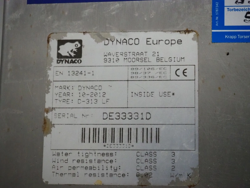Dynaco Europe electric high speed shutter door, type: D-313 LF, serial number: DE33331D, year of construction: 10-2012, dimensions: 2150 mm x 2150 mm.