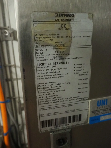 Dynaco Entrematic electric high speed shutter door, type: D-313 LF, serial number: DE47321B, year of construction: 9-2016, dimensions: 2000 mm x 2600 mm.