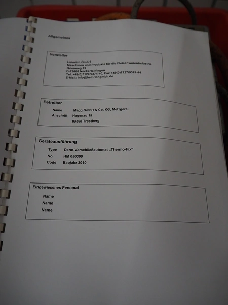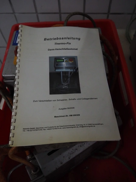 Heinrich GmbH casing sealer, machine number: HM 050309, year of construction: 09/2008, dimensions: 300 mm x 200 mm x 150 mm. Including Thermofix pneumatic closing stamp.
