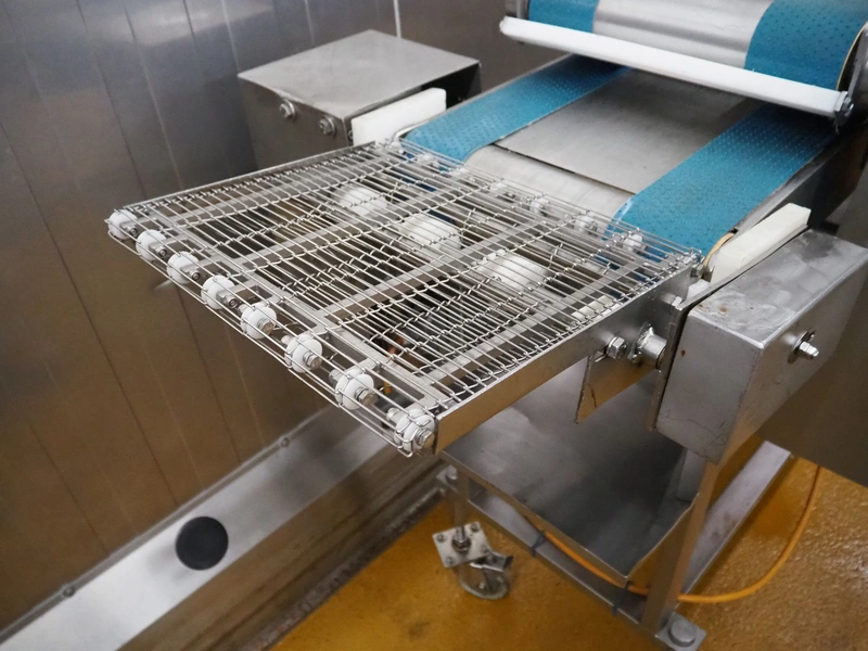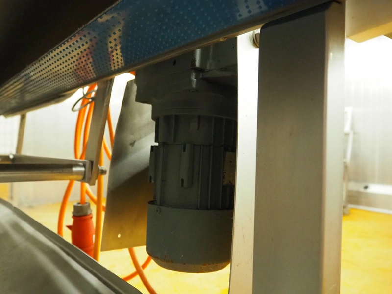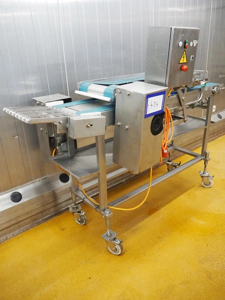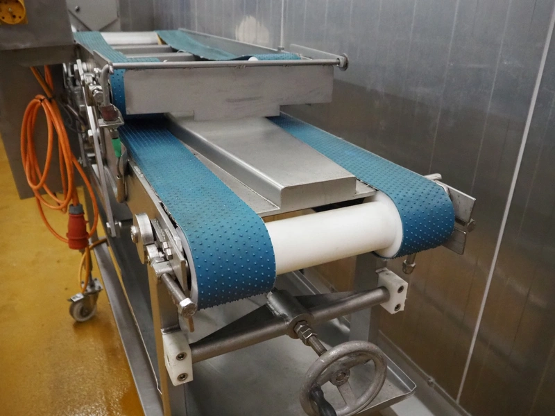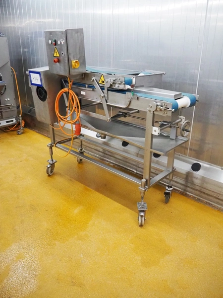 Alco-food-machines GmbH & Co. KG mobile cordon bleu machine, type: CB 400, serial number: 01212205, year of construction: 1994, 380 V, 0.55 kW, plastic belt, belt width: (2x) 100 mm, s/s mesh outfeed belt, belt width: 400 mm, total dimensions: 2150 mm x 920 mm x 1700 mm. Missing knives.