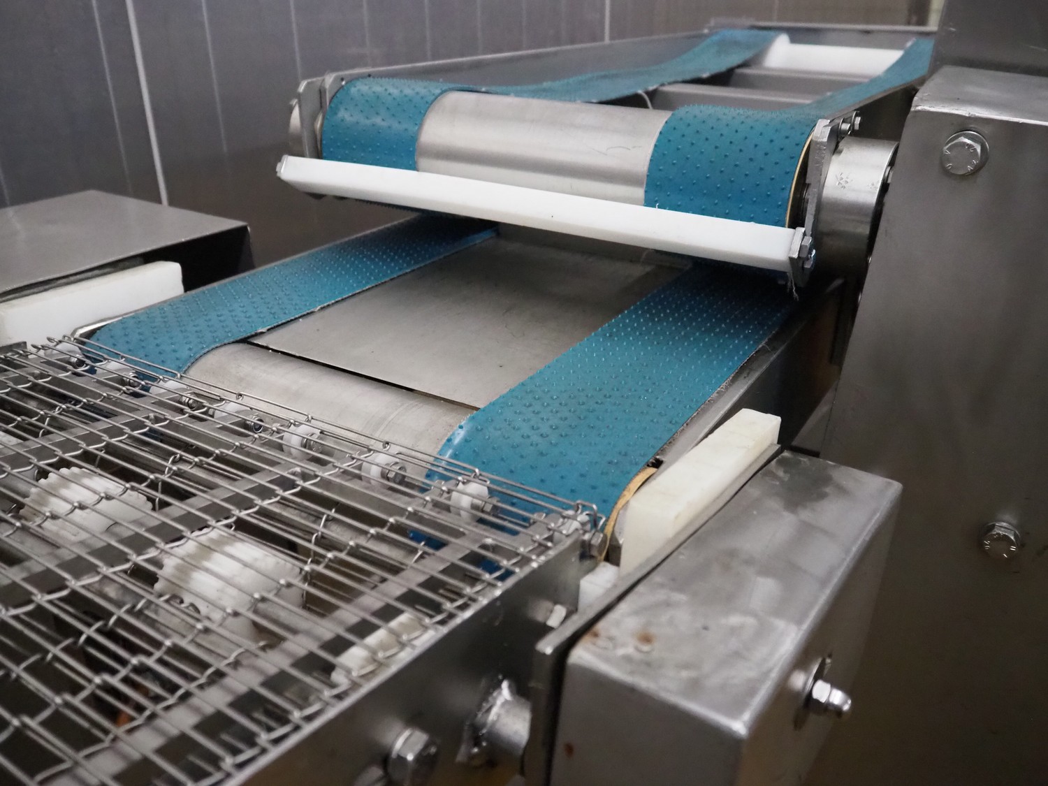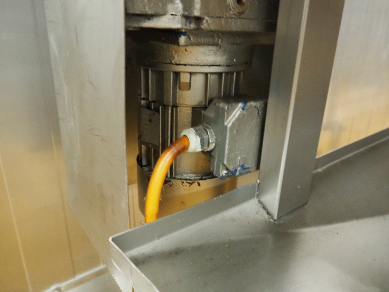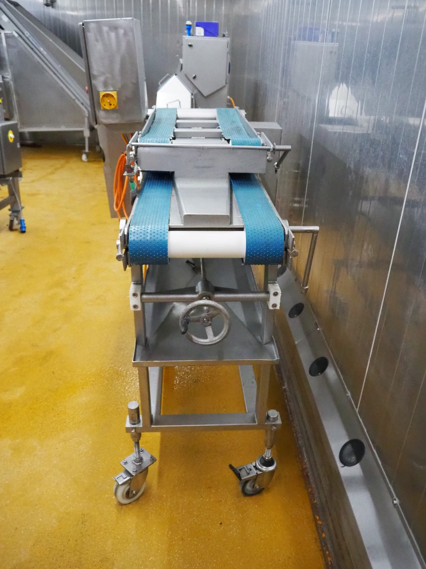 Alco-food-machines GmbH & Co. KG mobile cordon bleu machine, type: CB 400, serial number: 01212205, year of construction: 1994, 380 V, 0.55 kW, plastic belt, belt width: (2x) 100 mm, s/s mesh outfeed belt, belt width: 400 mm, total dimensions: 2150 mm x 920 mm x 1700 mm. Missing knives.