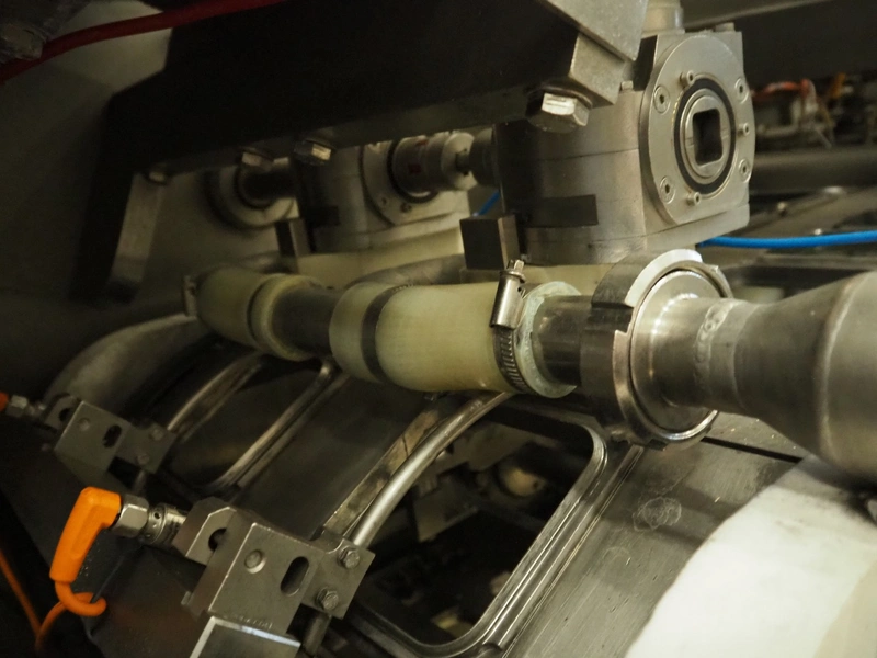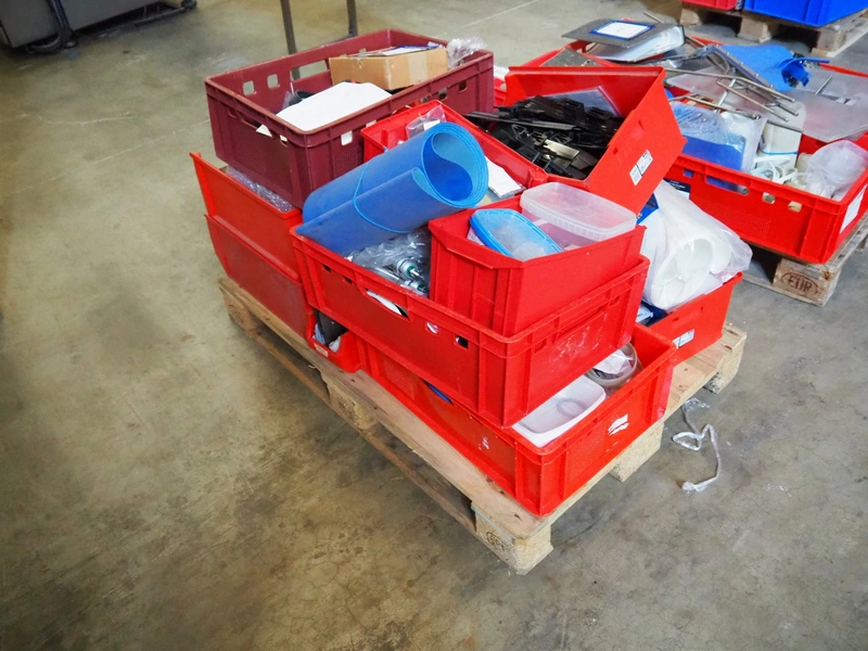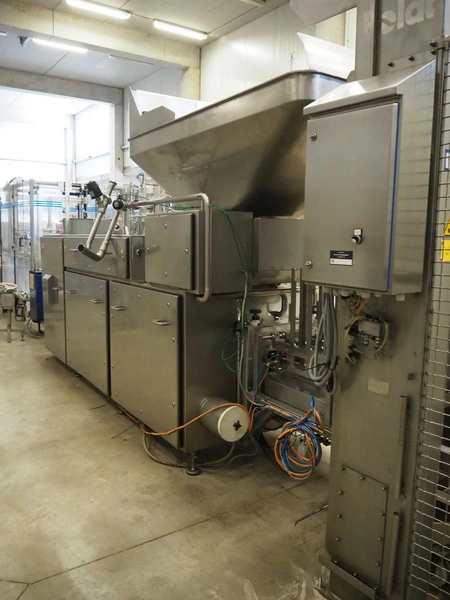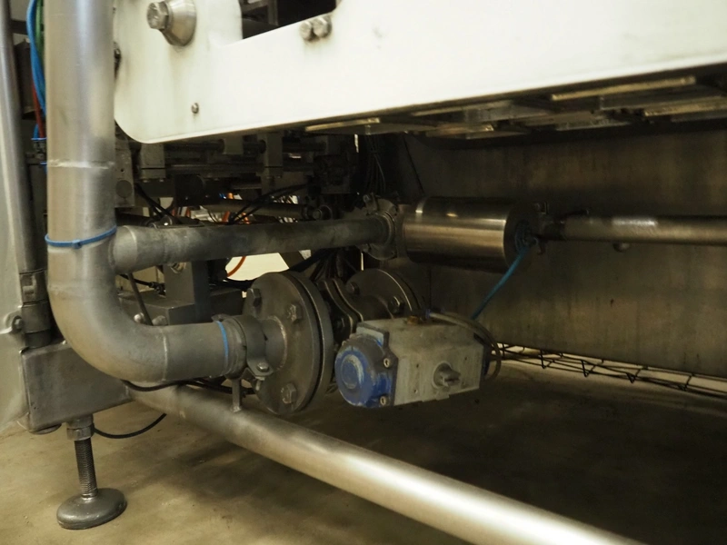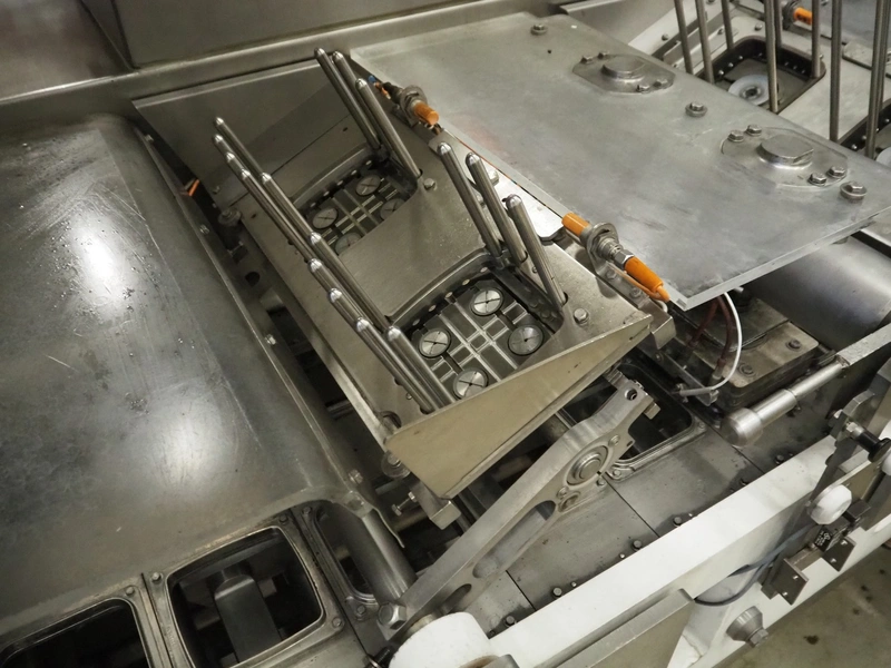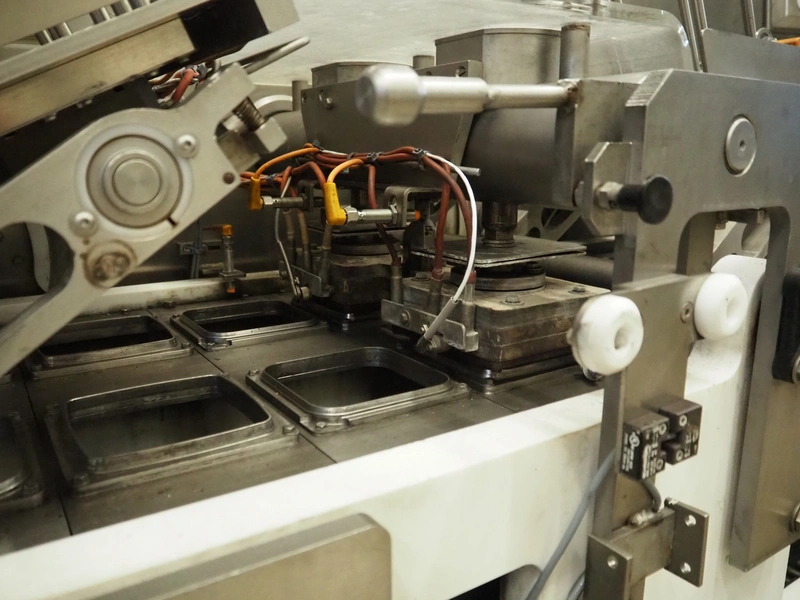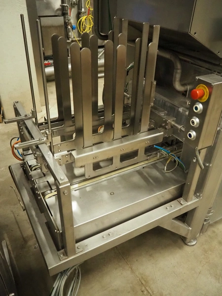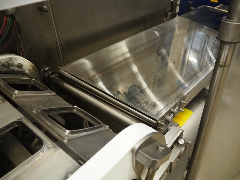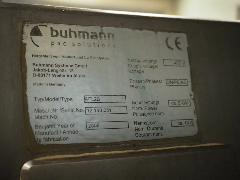 Buhmann Pac Solutions tray filling and closing machine, type: AFL2B, serial number: 12.140.051, year of construction: 2008, 400 V, 3 Ph, 10 A, 5 kW, Hilge pump, dimensions dye: 120 mm x 120 mm, belt width: 450 mm, platform height: 2230 mm, total dimensions: 4850 mm x 4100 mm x 3400 mm. With pallet with parts.