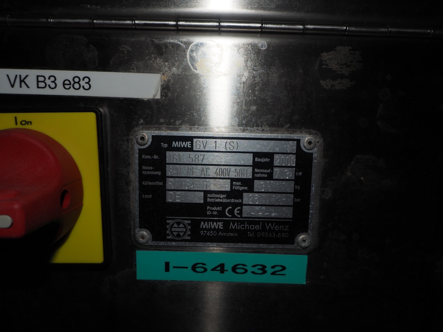 MIWE Gäromat proofer, type: MIWE GV 1 (S), serial number: 161 587, 400 V, 3 Ph, 50 Hz, year of construction: 2000, 400 V, 3 Ph, 50 Hz, 7.3 kW, refrigerant: R134A, 3.0 kg, inside dimensions: 1620 mm x 830 mm x 2000 mm, total dimensions: 1950 mm x 1380 mm x 2900 mm. Including pallet with parts, dimensions pallet: 1200 mm x 800 mm x 630 mm.