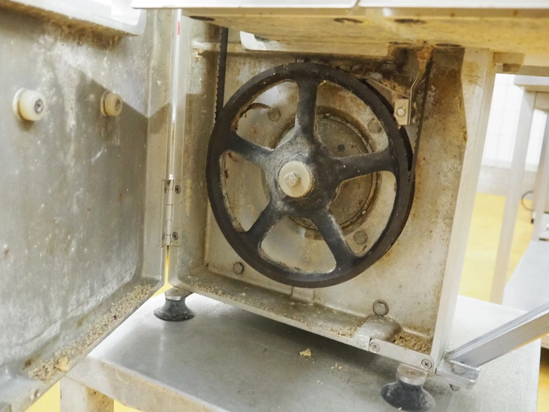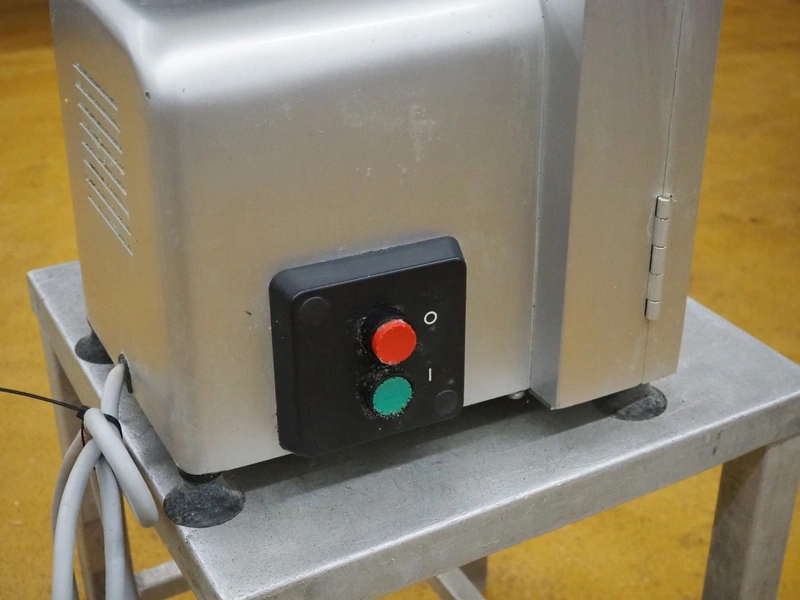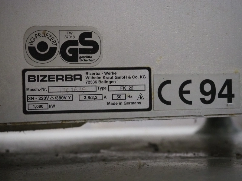Bizerba bandsaw on aluminium table, type: FK22, machine number: 1301639, 220/380 V, 3 Ph, 50 Hz, 3.8/2.2 A, 1.080 kW, dimensions: 900 mm x 450 mm x 1300 mm.