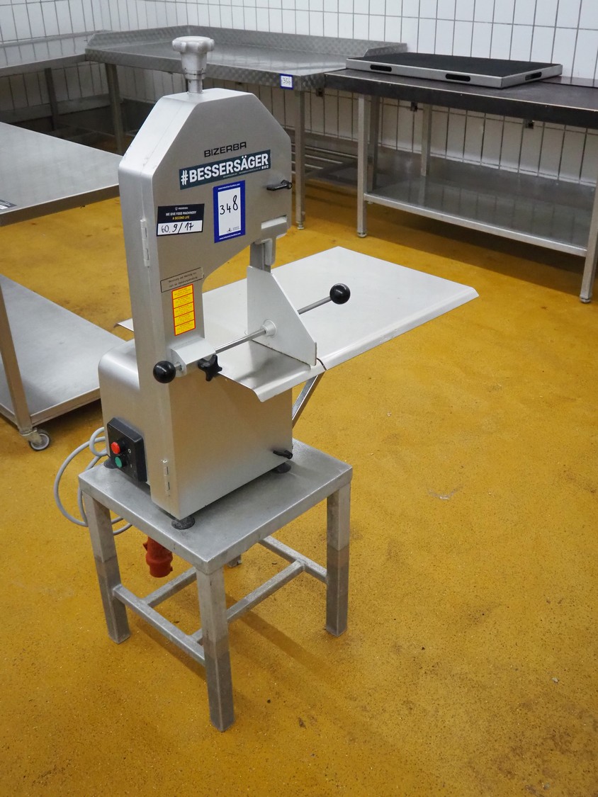 Bizerba bandsaw on aluminium table, type: FK22, machine number: 1301639, 220/380 V, 3 Ph, 50 Hz, 3.8/2.2 A, 1.080 kW, dimensions: 900 mm x 450 mm x 1300 mm.