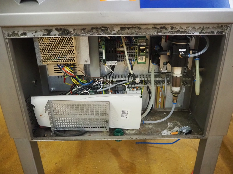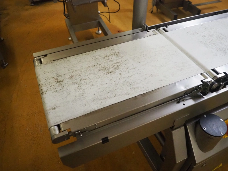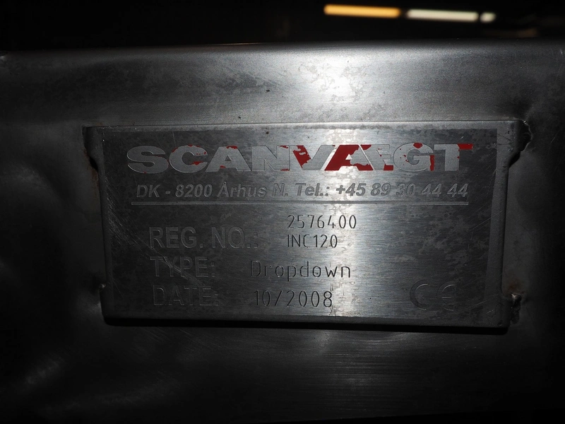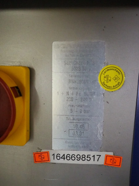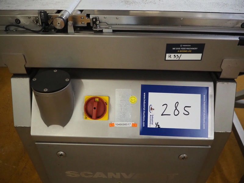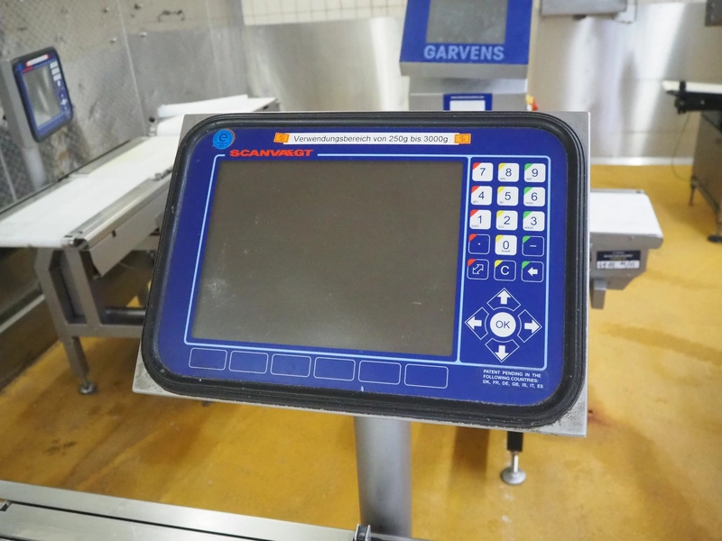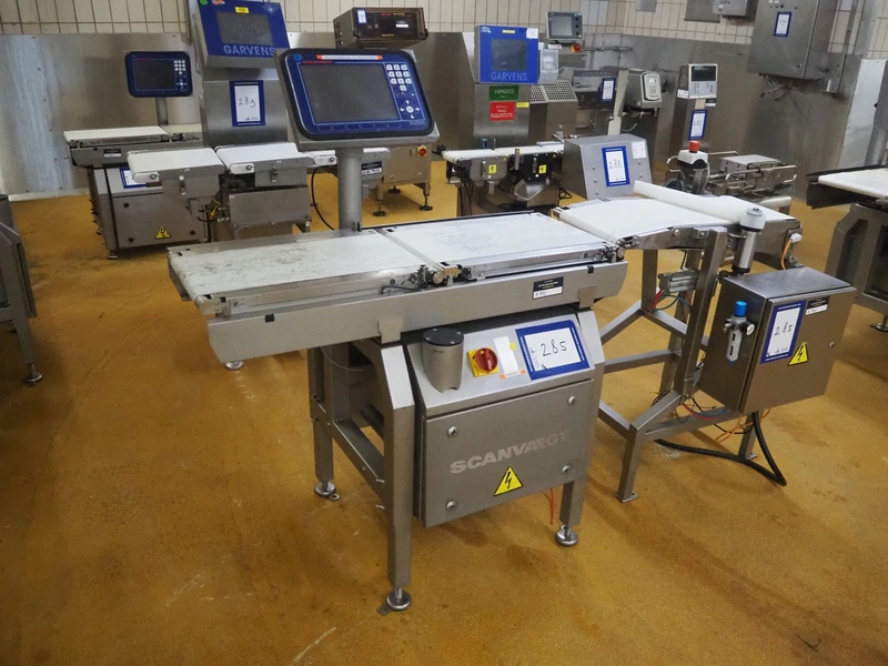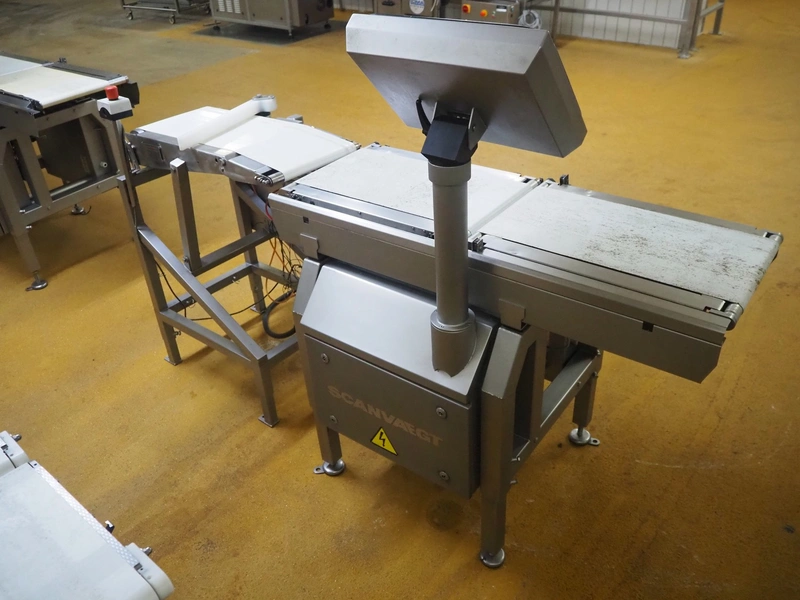 Scanvaegt checkweigher, model: Scancheck RF5, serial number: BNK00809, year of construction: 2005, 200-240 V, 1 Ph, 50/60 Hz, 5.0 A, 5-8 bar, belt width: 300 mm, weighing range: between 250 and 3000 gram, total dimensions: 1220 mm x 900 mm x 1650 mm. Including Scanvaegt rejector, belt width: 270 mm, total dimensions: 1000 mm x 750 mm x 1050 mm.