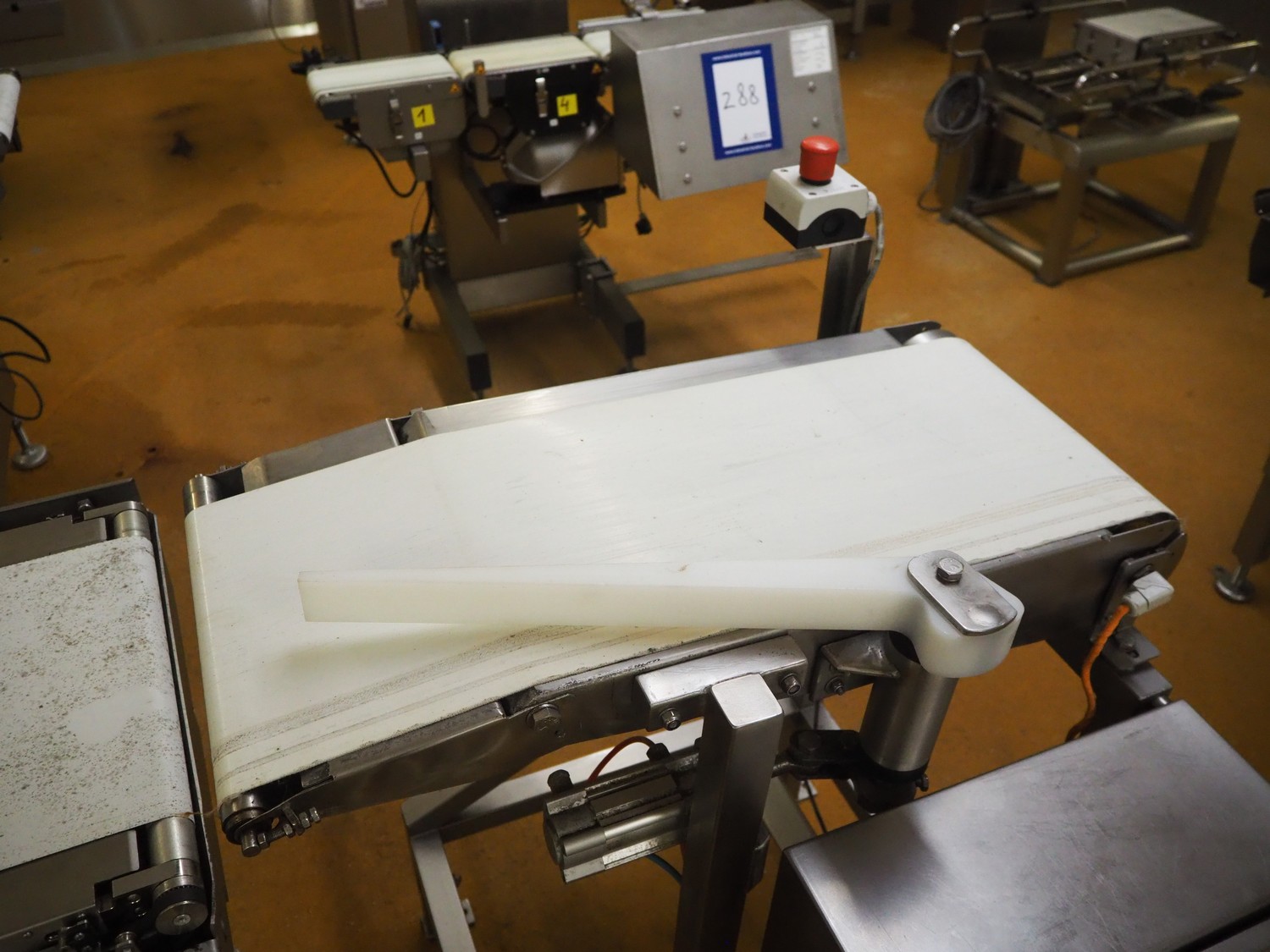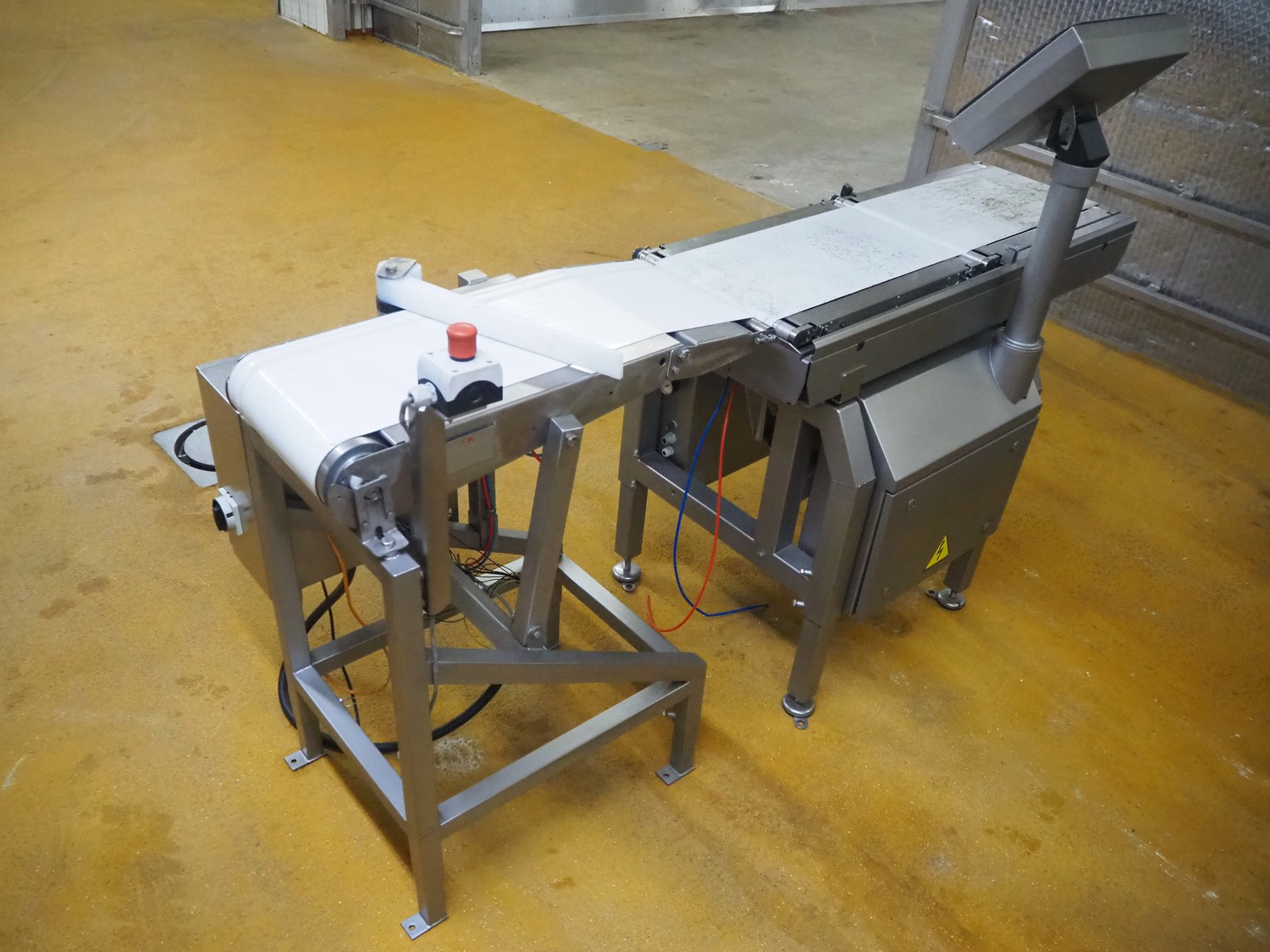 Scanvaegt checkweigher, model: Scancheck RF5, serial number: BNK00809, year of construction: 2005, 200-240 V, 1 Ph, 50/60 Hz, 5.0 A, 5-8 bar, belt width: 300 mm, weighing range: between 250 and 3000 gram, total dimensions: 1220 mm x 900 mm x 1650 mm. Including Scanvaegt rejector, belt width: 270 mm, total dimensions: 1000 mm x 750 mm x 1050 mm.