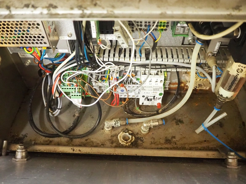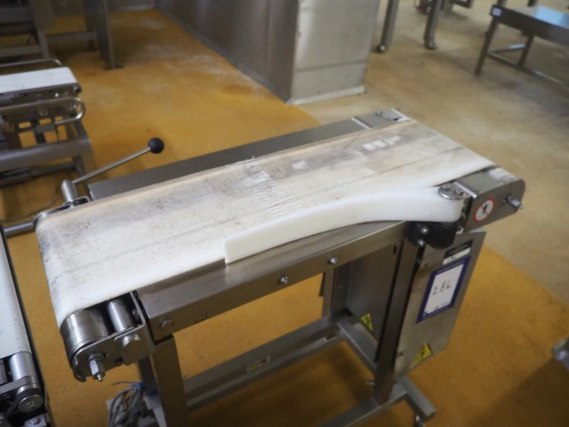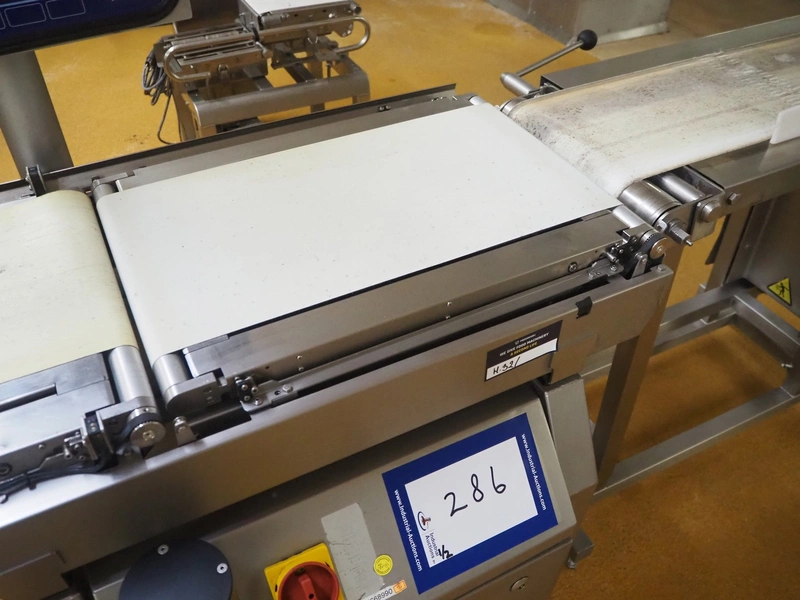 Scanvaegt checkweigher, model: Scancheck RF5, serial number: BNK00805, year of construction: 2005, 200-240 V, 1 Ph, 50/60 Hz, 5.0 A, 5-8 bar, belt width: 300 mm, weighing range: between 500 and 3000 gram, total dimensions: 1220 mm x 900 mm x 1650 mm. Including Scanvaegt rejector, belt width: 270 mm, total dimensions: 1000 mm x 750 mm x 1050 mm.