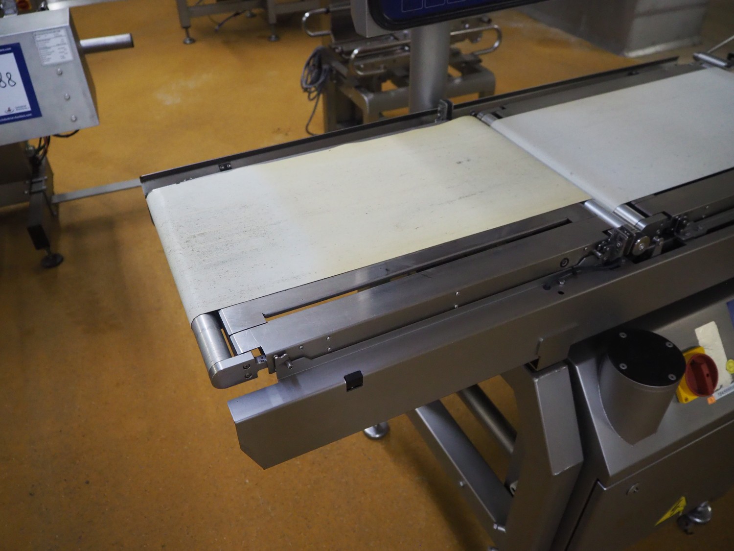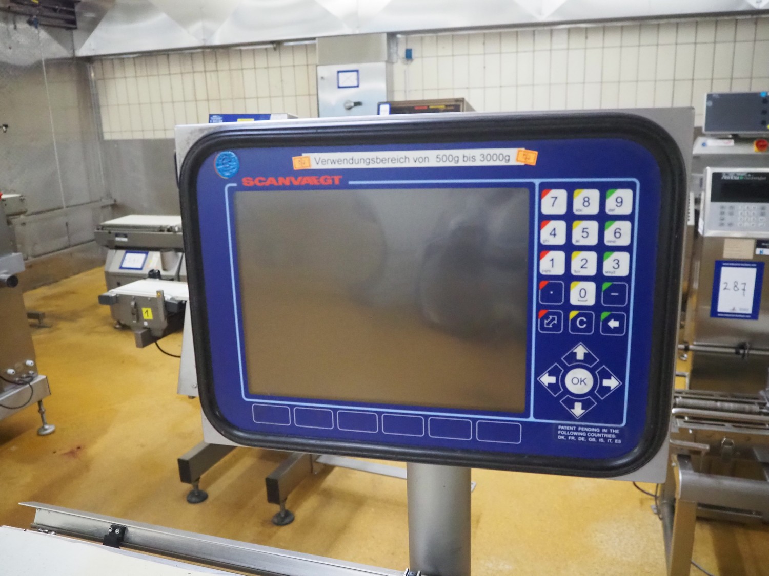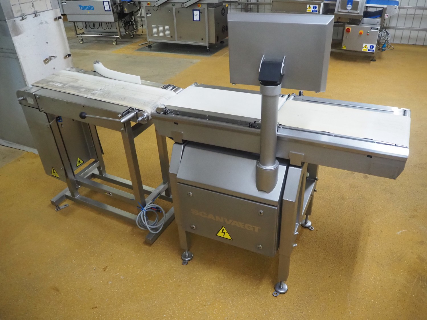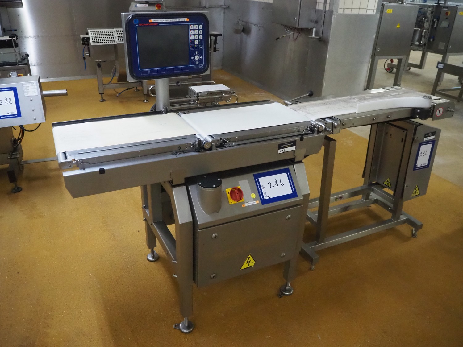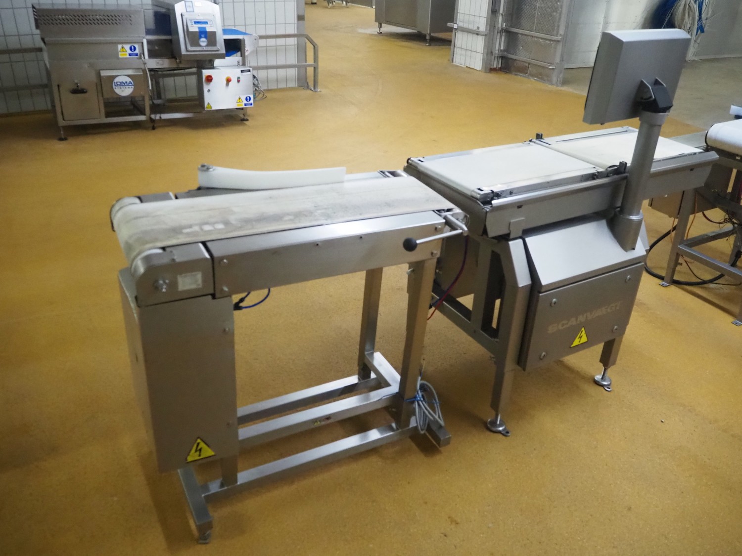Scanvaegt checkweigher, model: Scancheck RF5, serial number: BNK00805, year of construction: 2005, 200-240 V, 1 Ph, 50/60 Hz, 5.0 A, 5-8 bar, belt width: 300 mm, weighing range: between 500 and 3000 gram, total dimensions: 1220 mm x 900 mm x 1650 mm. Including Scanvaegt rejector, belt width: 270 mm, total dimensions: 1000 mm x 750 mm x 1050 mm.